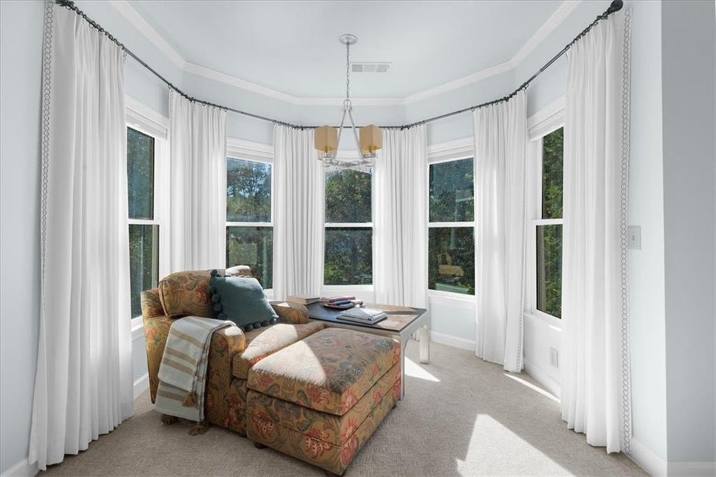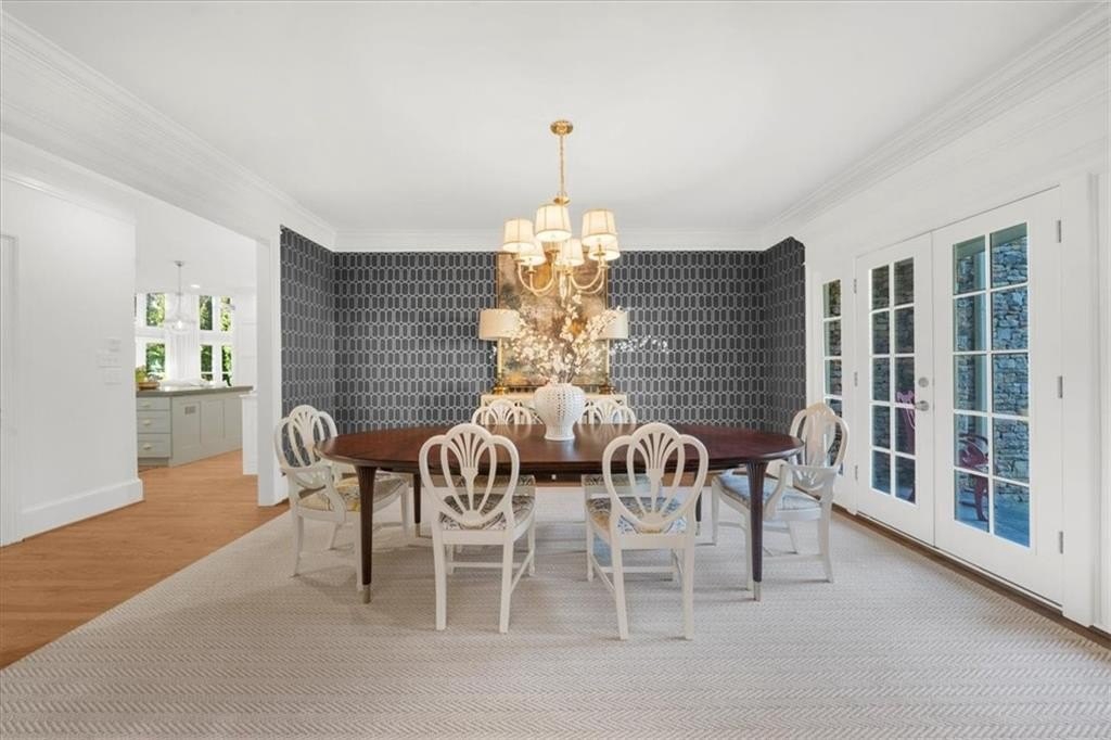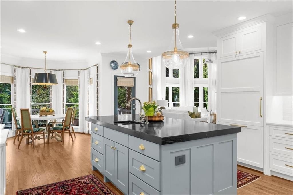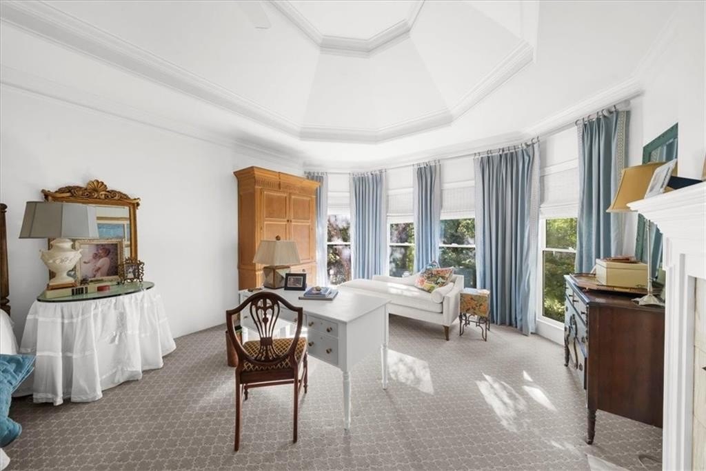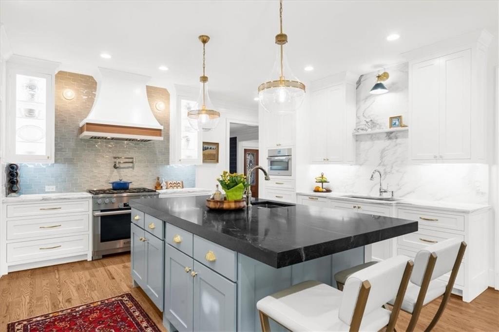 Additional highlights include Schumacher window treatments and wall coverings, custom natural woven shades, and a serene location on a quiet cul-de-sac street adjacent to the neighborhood’s green space and play area.