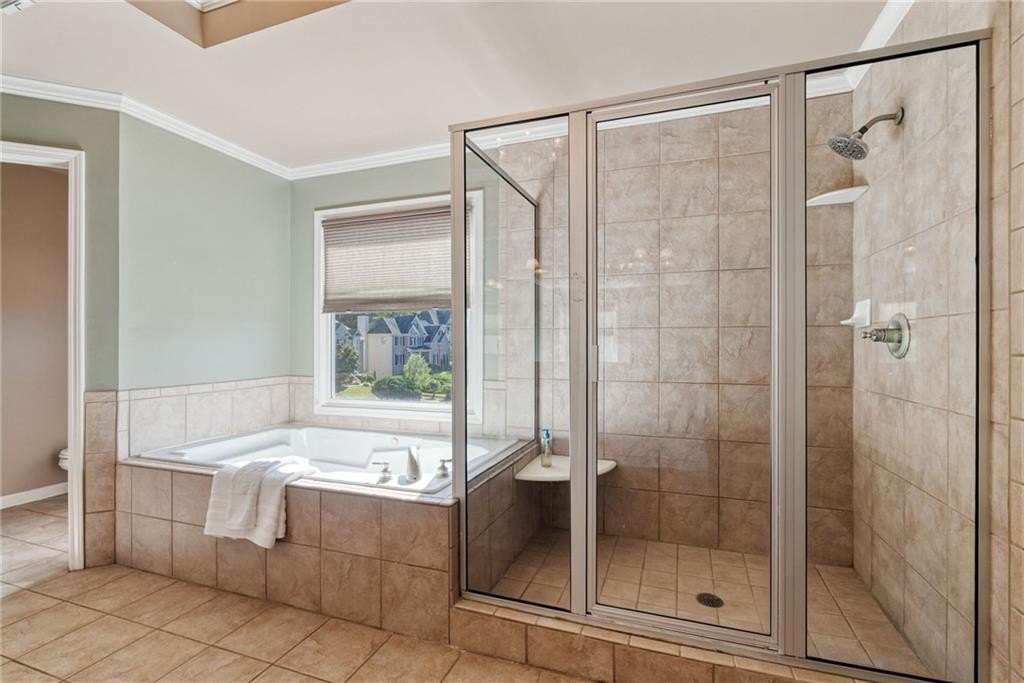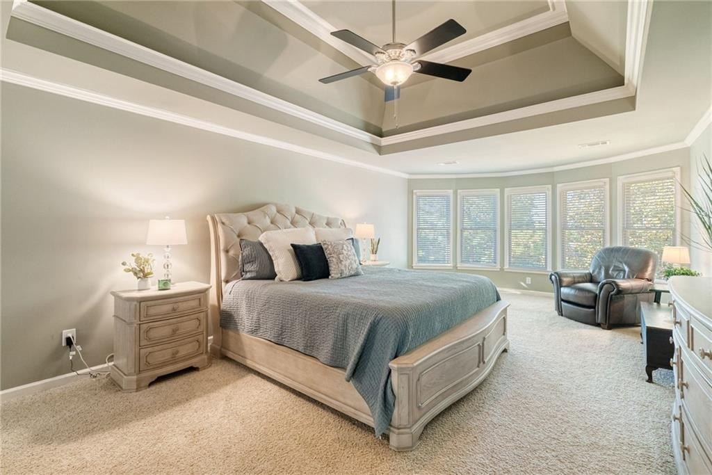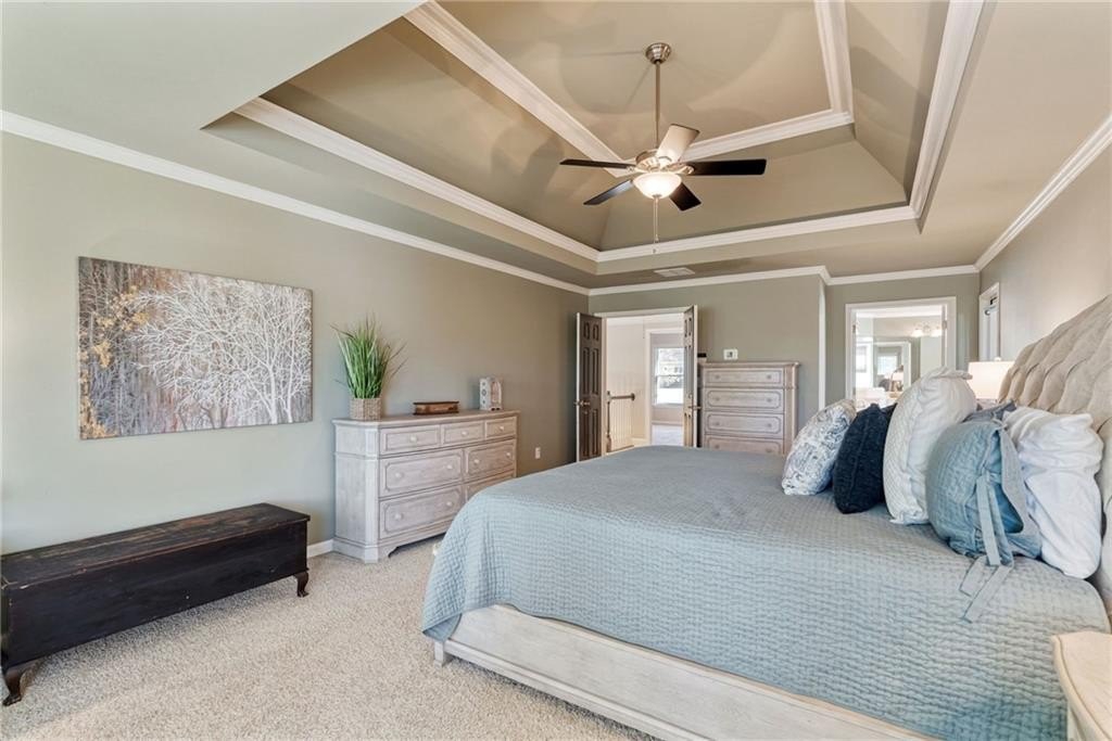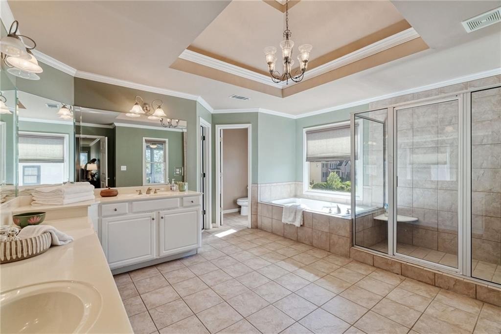 A bedroom and full bath on the main level make this floor plan ideal for guests or multi-generational living. Upstairs, the spacious primary suite is a true retreat—complete with tray ceilings, a sitting area framed by windows, and a spa-style bath with dual vanities, soaking tub, and a large shower.
