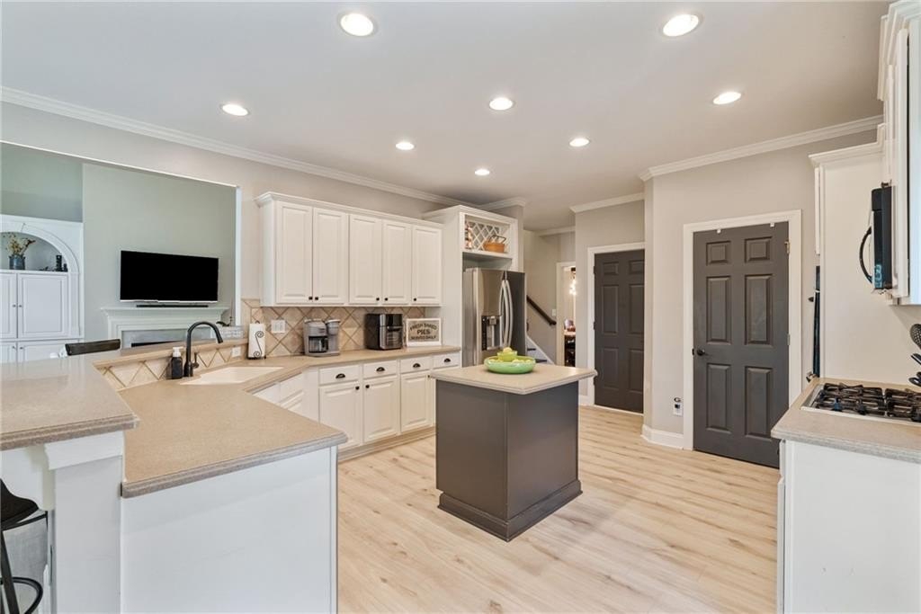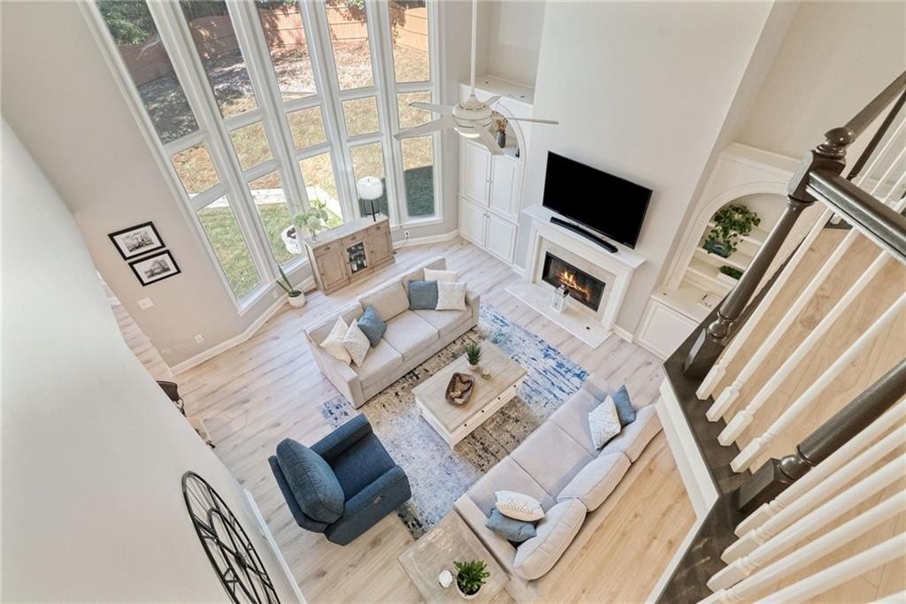 From the moment you step inside, you’ll feel at home in the bright, open floor plan anchored by a two-story great room with soaring windows and a cozy fireplace. The white kitchen is warm and inviting, featuring double ovens, a center island, and a sunny breakfast area overlooking the backyard.