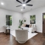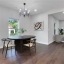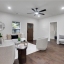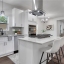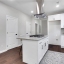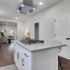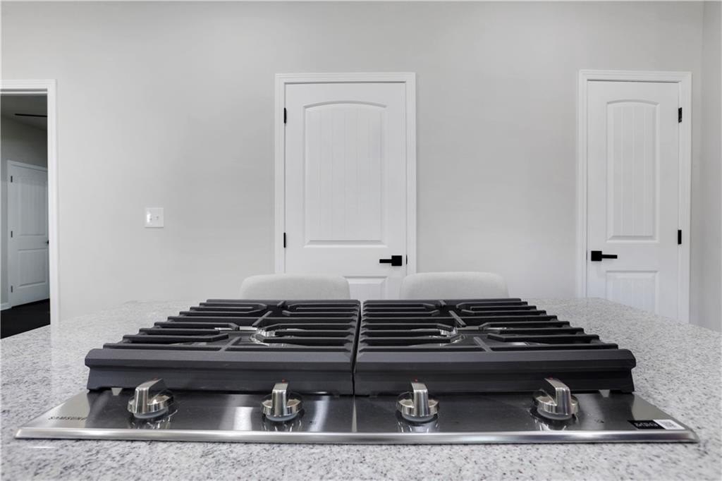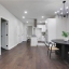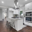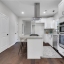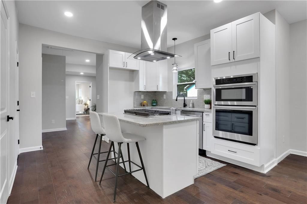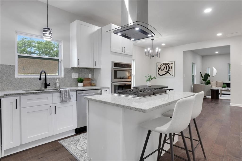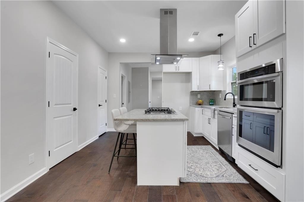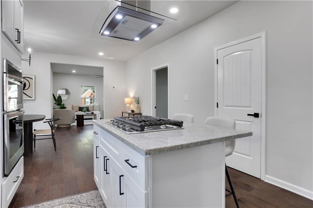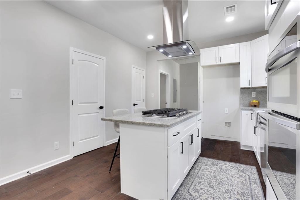 The chef’s kitchen serves as the centerpiece of the home, showcasing sleek white cabinetry, granite countertops, a gas cooktop island with a modern range hood, and a built-in oven and microwave combo for a true designer finish. Recessed and pendant lighting elevate the space, complemented by a stylish backsplash and warm hardwood floors, perfect for both entertaining and everyday living.