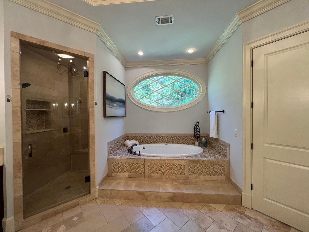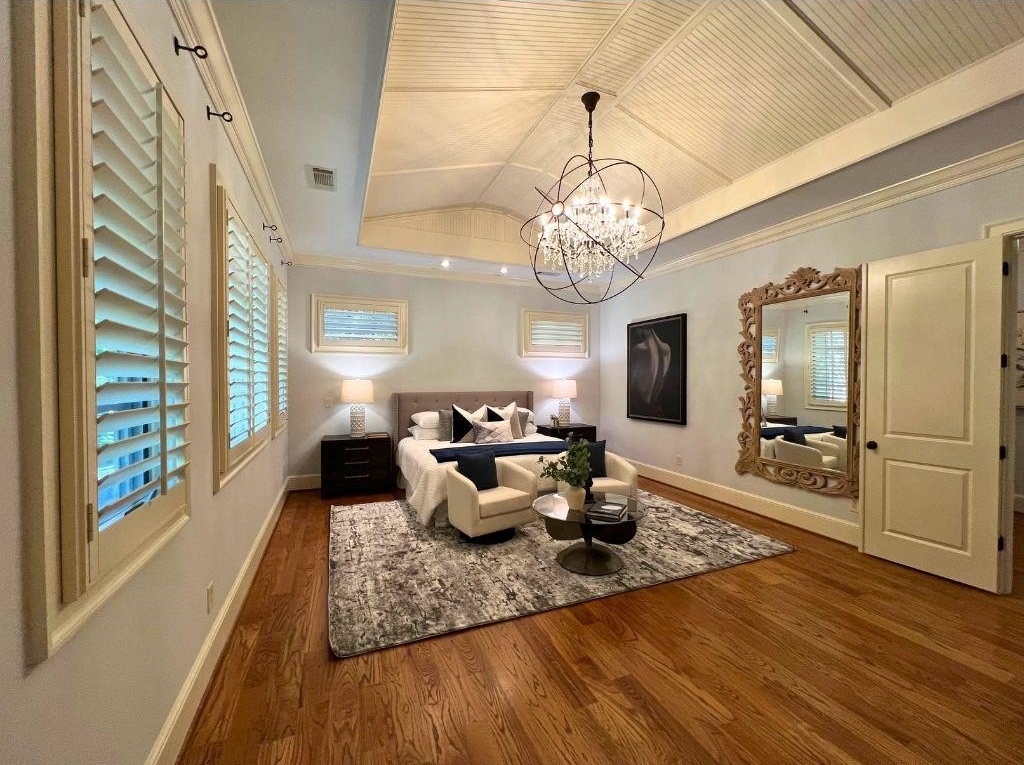 An elevator connects all levels with ease, offering both comfort and accessibility. Freshly painted and filled with natural light, the home showcases premium trim and molding, coffered and vaulted ceilings, and plantation shutters throughout. A three-car garage with electric car charger, new HVAC system, solar panels, and no HOA add both convenience and flexibility.