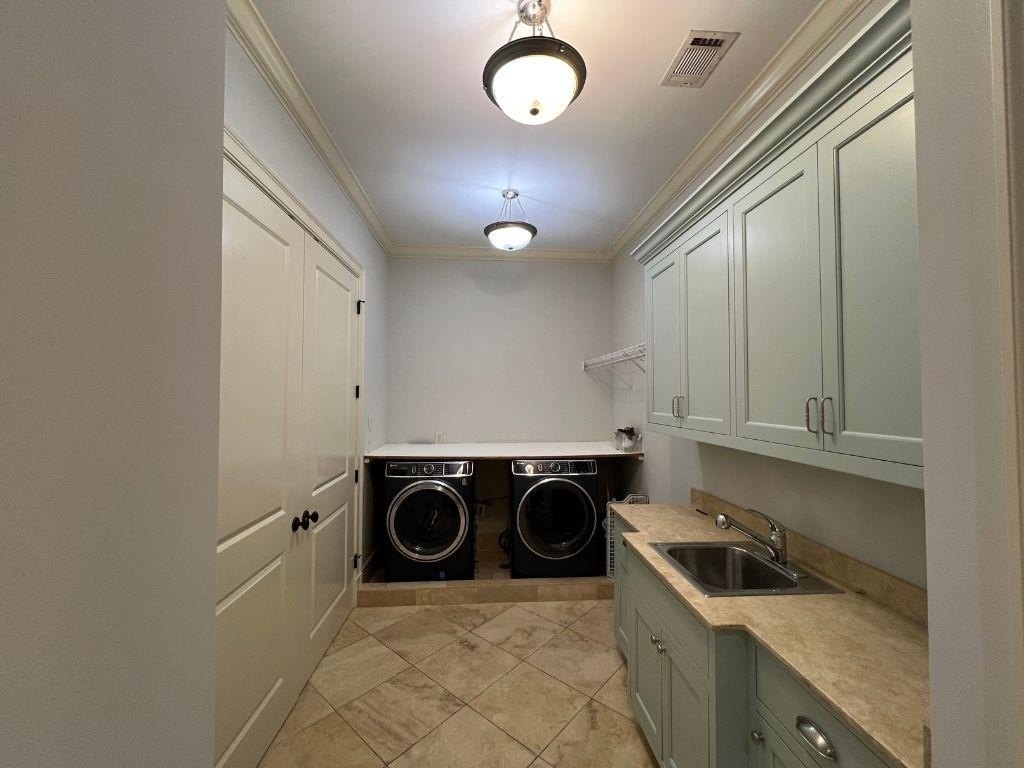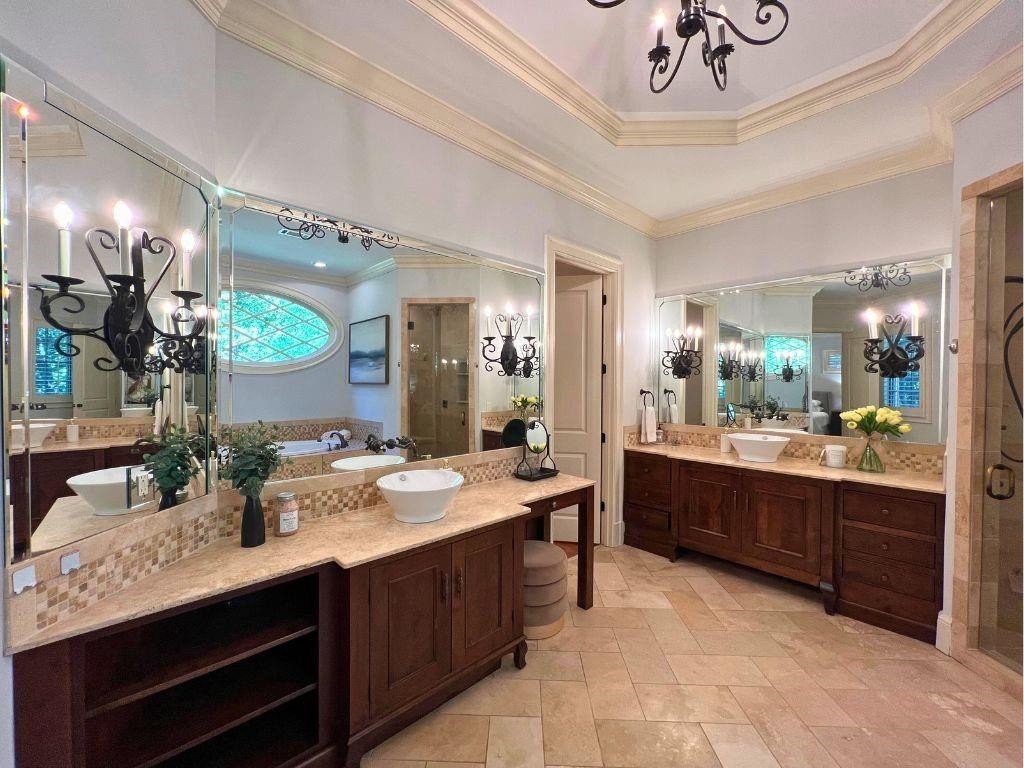 At the heart of the home is the chef’s kitchen, featuring double dishwashers, a butler’s pantry, large walk-in pantry, and abundant storage. The kitchen opens to an inviting outdoor sitting area, perfect for alfresco dinners on the side porch, and flows seamlessly to the fireside great room and walk-out covered patio with an outdoor fireplace overlooking the private backyard, creating an inviting setting for year-round enjoyment.