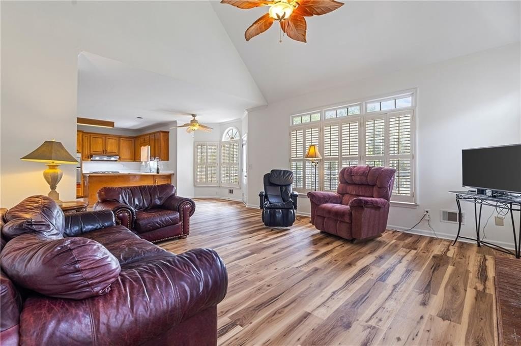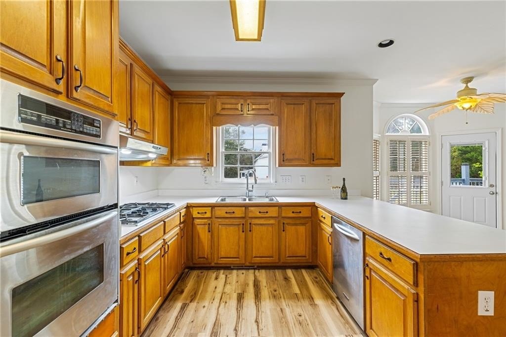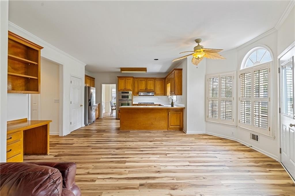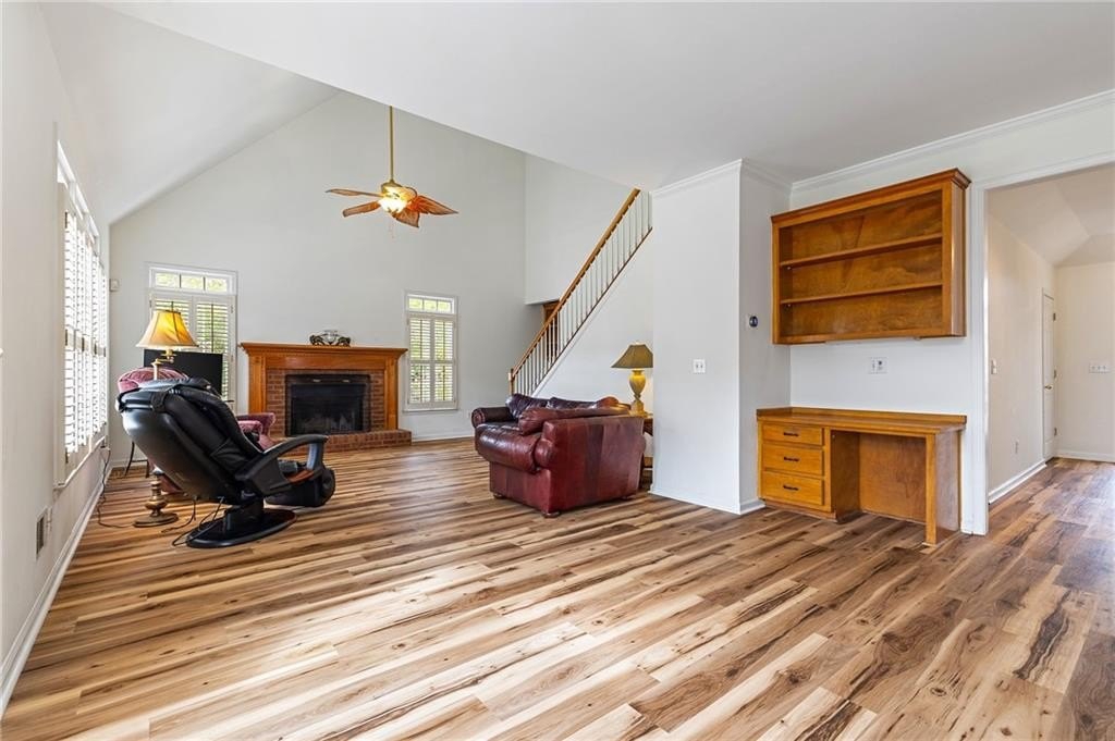 The open and functional floor plan features a bright family room with a cozy fireplace, a separate dining area, and a spacious kitchen with breakfast nook overlooking the private, fenced backyard — ideal for gatherings or quiet mornings.
