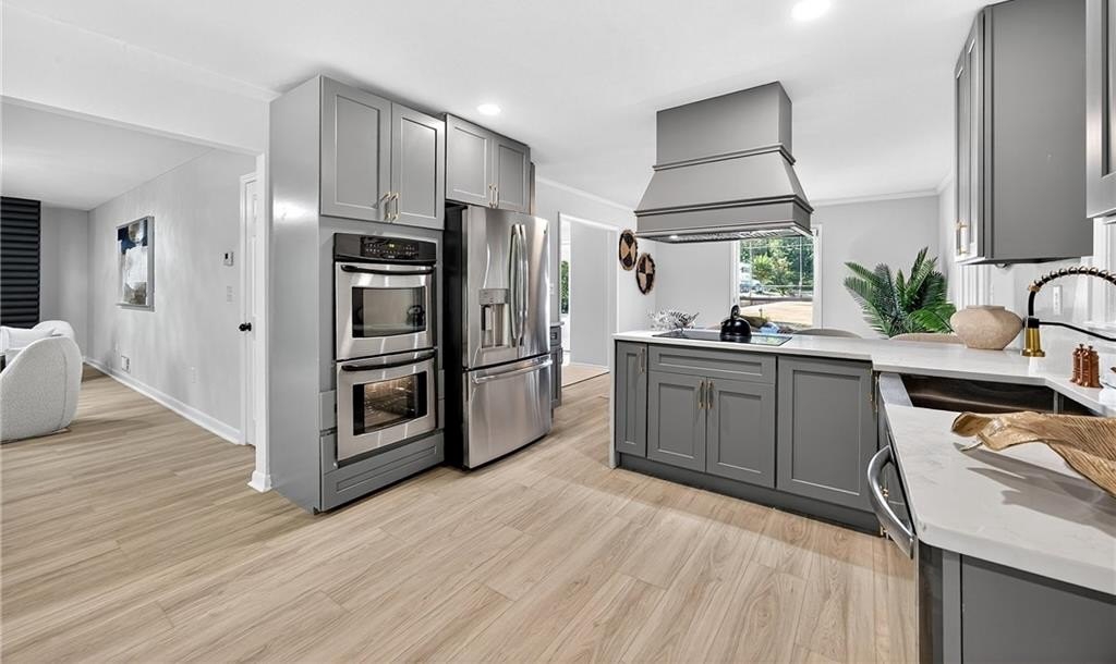 At the heart of the home, the chef’s kitchen commands attention. Bathed in inviting light, it blends functionality with refinement: sleek quartz countertops, gleaming stainless steel appliances, and double ovens ready to turn everyday meals into memorable moments. A nearby wet bar introduces a touch of sophistication, the perfect complement for entertaining guests or winding down with quiet ease.