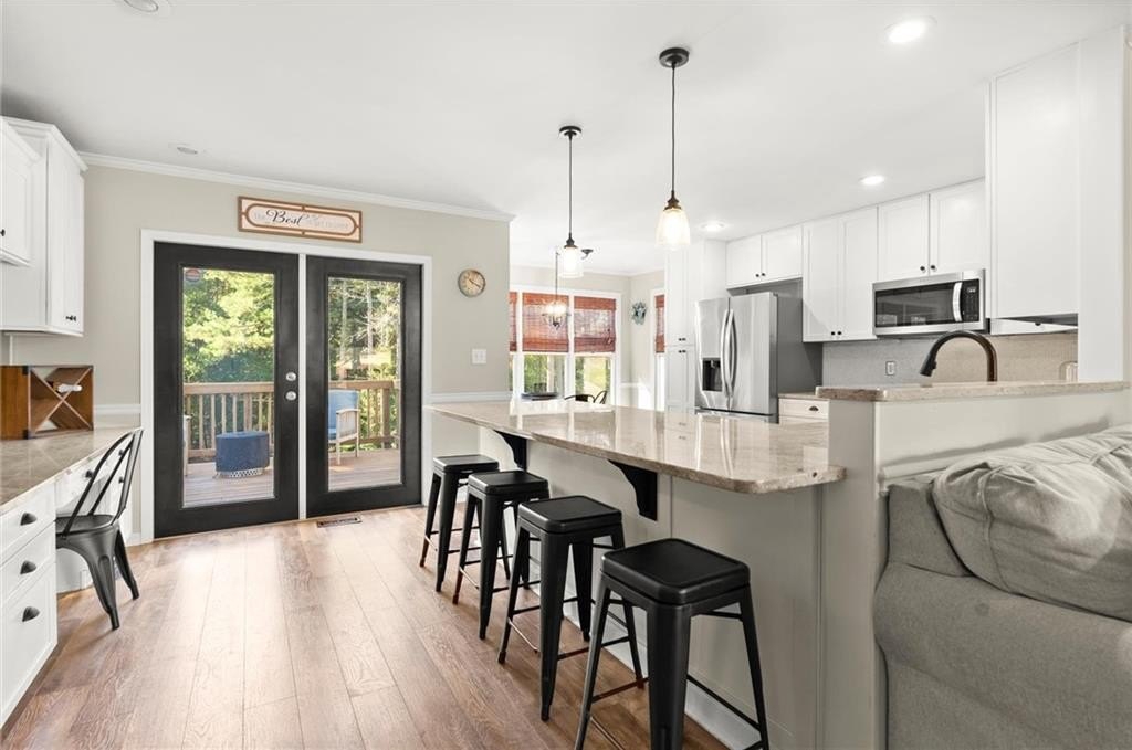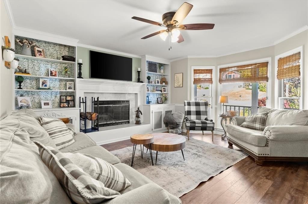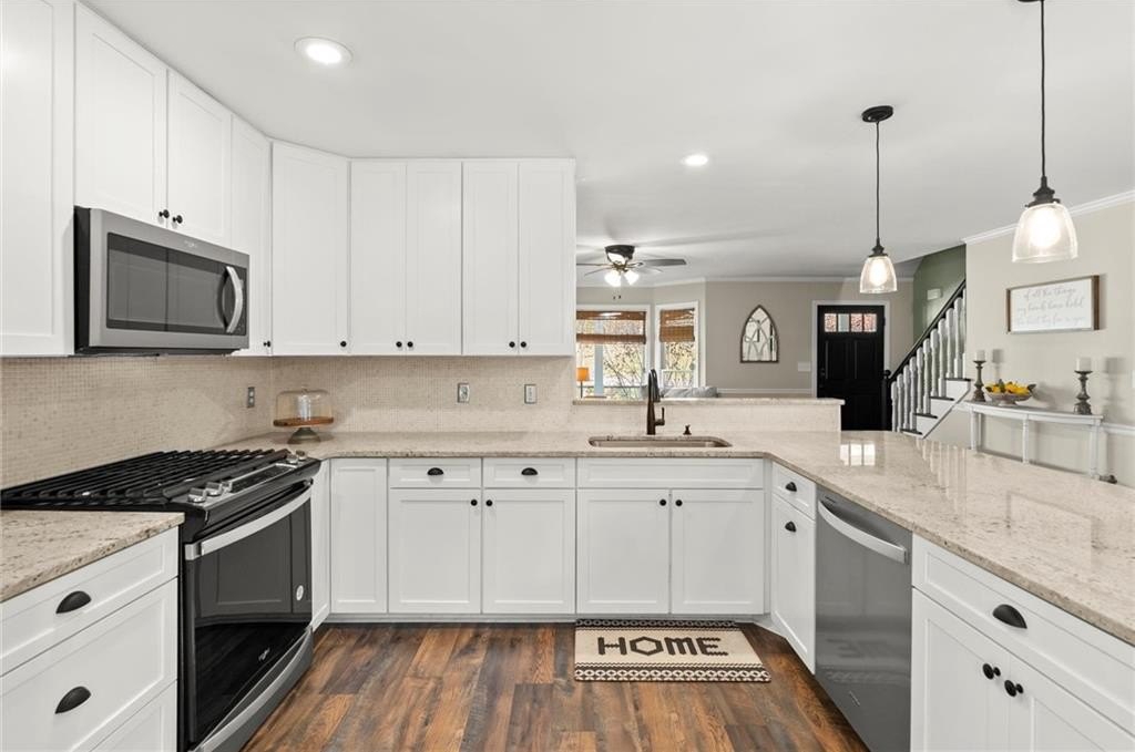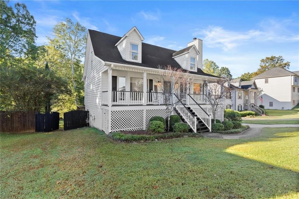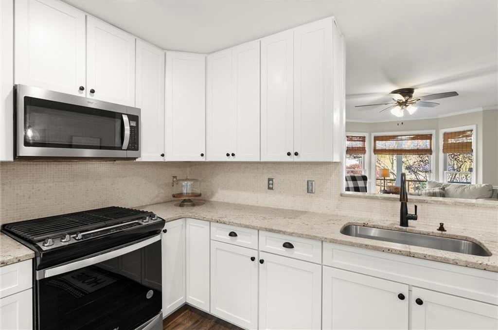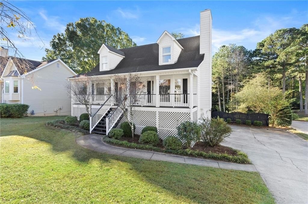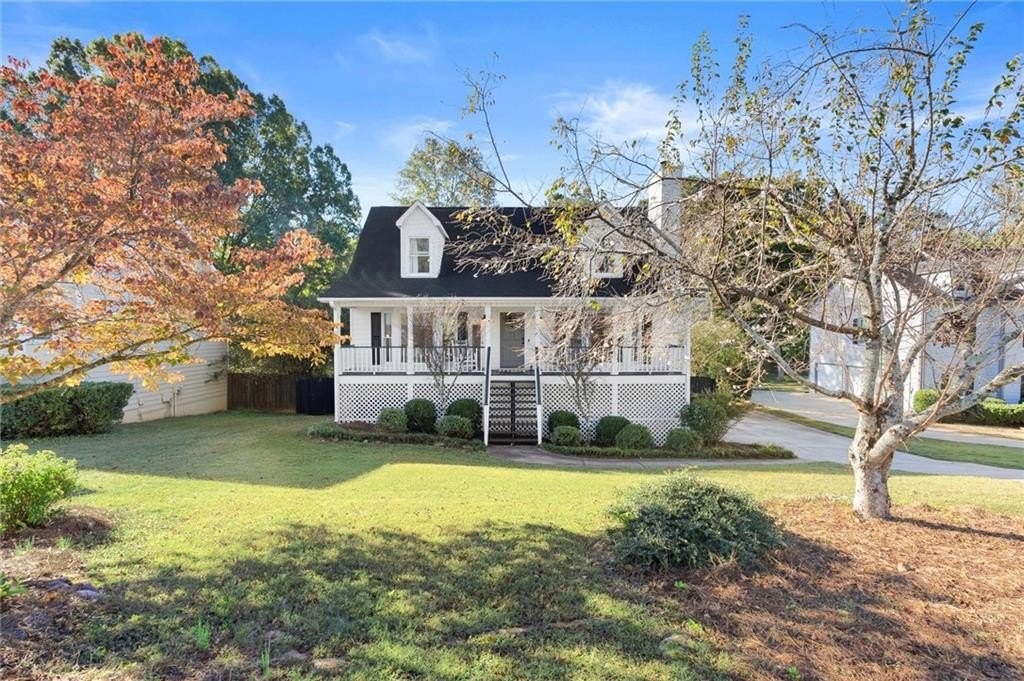 This home is an absolute DREAM! You're immediately greeted by a charming front porch, step inside to a gorgeous, light & bright, open floorplan--the living room is generously sized with a bay window and centered by a cozy fireplace and built in bookcases, and is open to a beautiful white kitchen with granite countertops, stainless steel appliances, and tons of storage, even a long peninsula perfect for hosting/entertaining. Adorable banquette takes advantage of breakfast nook area with extra seating and tons of windows, and built in desk area makes for smart storage space. Primary bedroom on main floor is generous in size with spacious en-suite bathroom including separate tub and shower, and walk in closet. An additional powder room on the main floor as well as laundry conveniently located. Upstairs, find 2 additional spacious bedrooms with dormer window nooks adding to the charm as well as a secondary bathroom. Basement level offers additional living area/office/playroom/exercise space--whatever is needed! And just wait til you see this fenced-in yard! Recently built deck is a great extension of the living area and kitchen and overlooks a sprawling, over half acre flat yard with a fireplace at the back to soak up the outdoors! All of this in the heart of Woodstock--super quick highway access, 5 minute drive to Target or Walmart, 10 minutes to downtown Woodstock, and tons of grocery stores right around the corner (including Aldi, Lidl, Kroger, Sprouts & more!) It's everywhere you want to be, don't miss your chance to call it home!