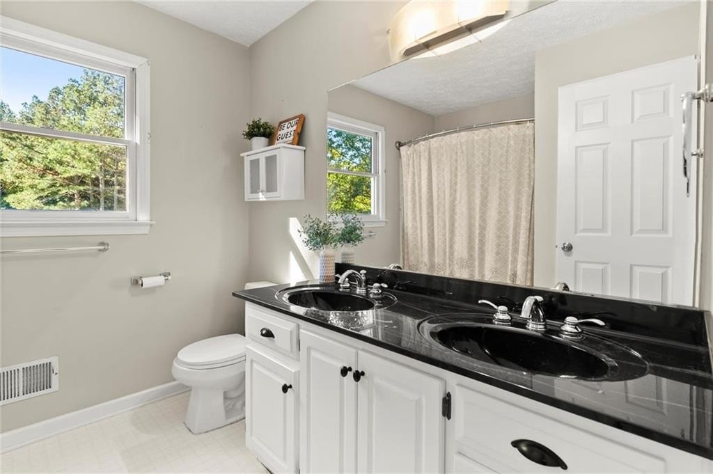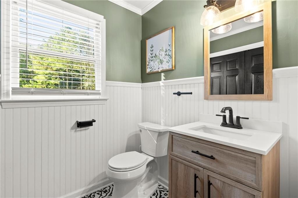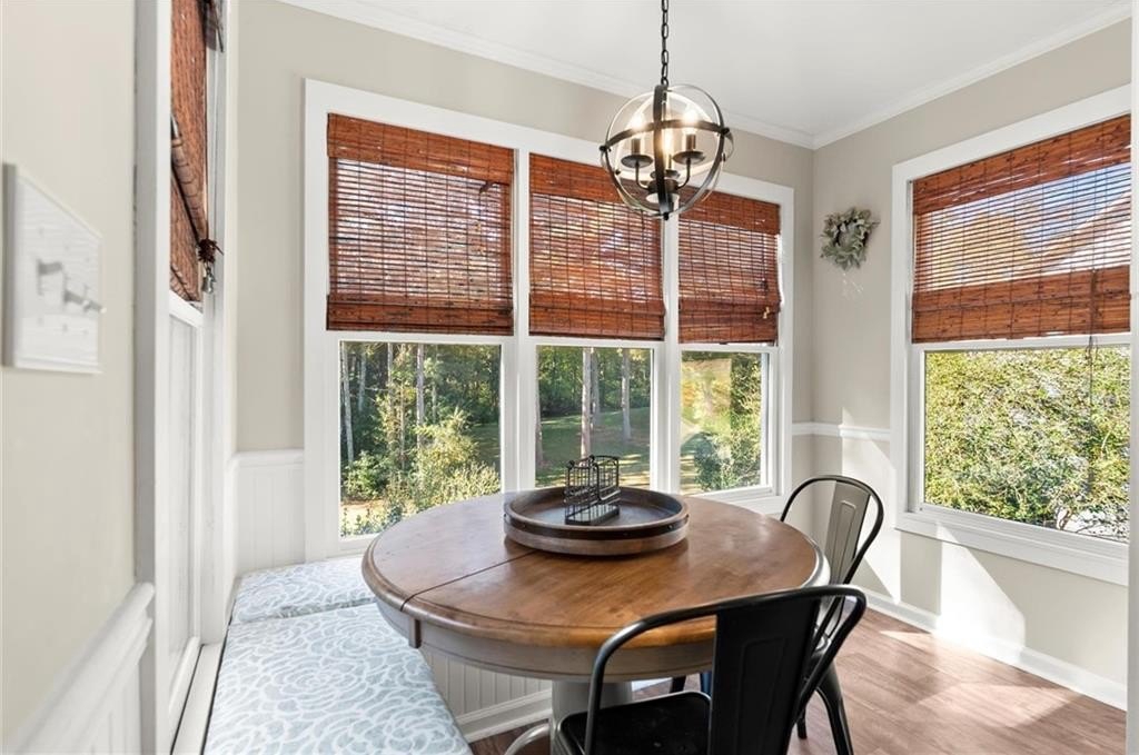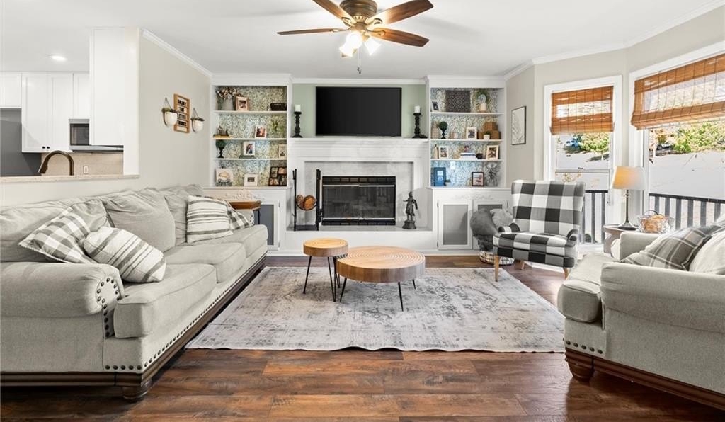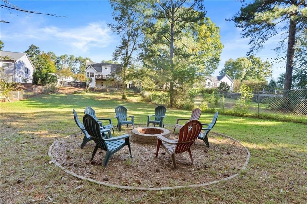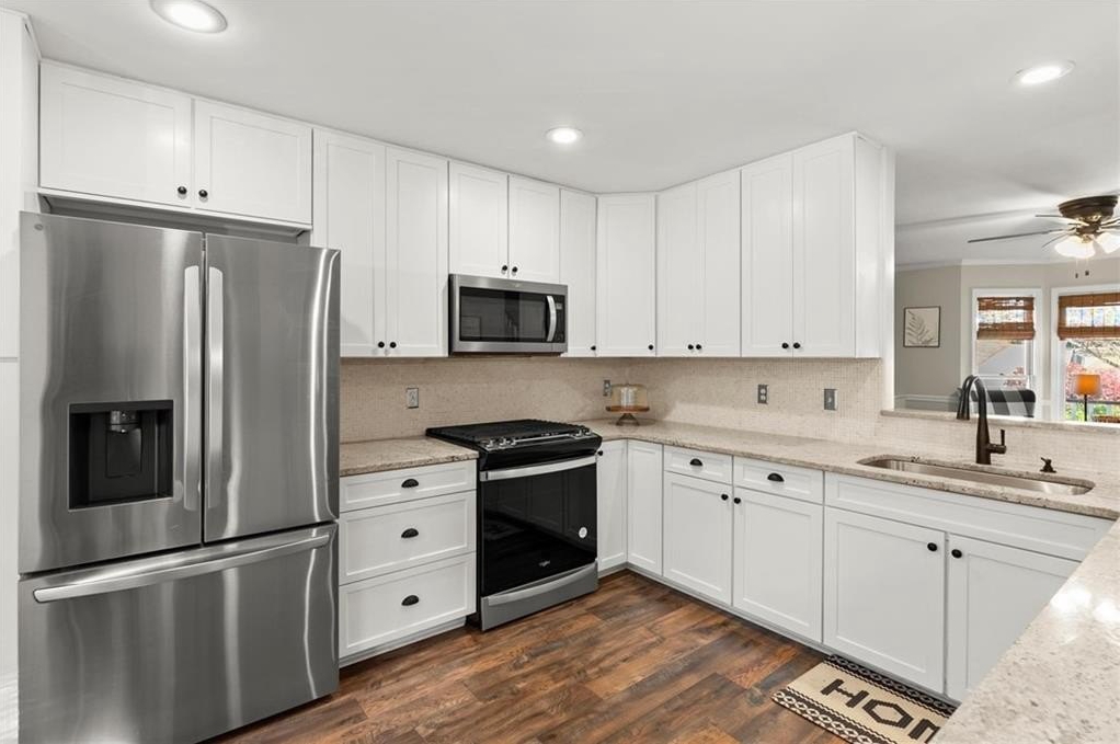 This home is an absolute DREAM! You're immediately greeted by a charming front porch, step inside to a gorgeous, light & bright, open floorplan--the living room is generously sized with a bay window and centered by a cozy fireplace and built in bookcases, and is open to a beautiful white kitchen with granite countertops, stainless steel appliances, and tons of storage, even a long peninsula perfect for hosting/entertaining. Adorable banquette takes advantage of breakfast nook area with extra seating and tons of windows, and built in desk area makes for smart storage space. Primary bedroom on main floor is generous in size with spacious en-suite bathroom including separate tub and shower, and walk in closet. An additional powder room on the main floor as well as laundry conveniently located. Upstairs, find 2 additional spacious bedrooms with dormer window nooks adding to the charm as well as a secondary bathroom. Basement level offers additional living area/office/playroom/exercise space--whatever is needed! And just wait til you see this fenced-in yard! Recently built deck is a great extension of the living area and kitchen and overlooks a sprawling, over half acre flat yard with a fireplace at the back to soak up the outdoors! All of this in the heart of Woodstock--super quick highway access, 5 minute drive to Target or Walmart, 10 minutes to downtown Woodstock, and tons of grocery stores right around the corner (including Aldi, Lidl, Kroger, Sprouts & more!) It's everywhere you want to be, don't miss your chance to call it home!