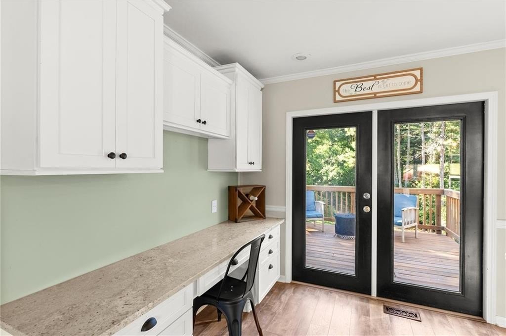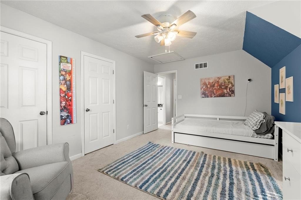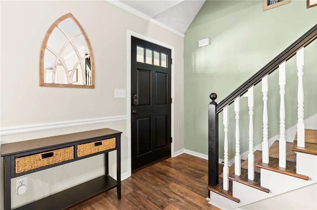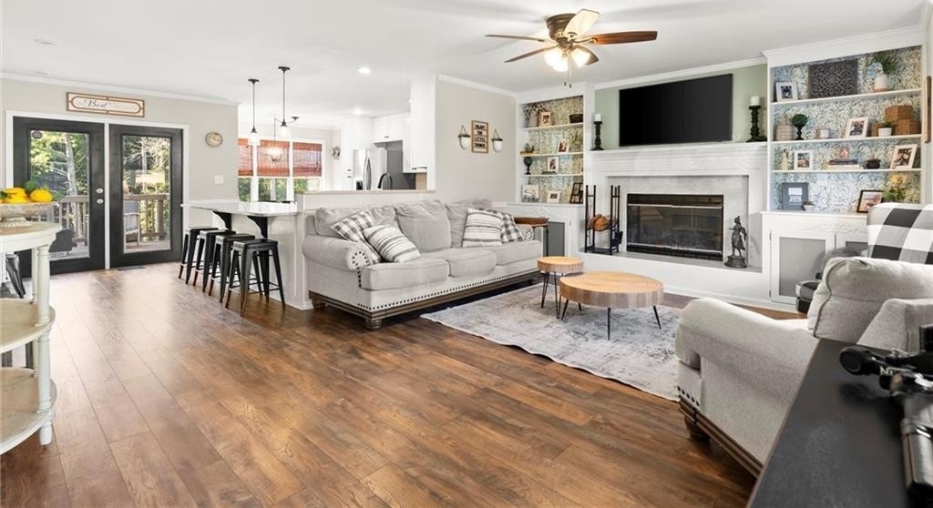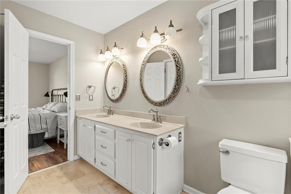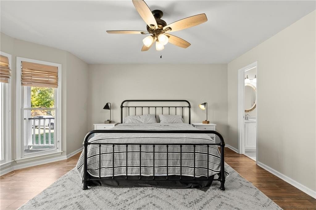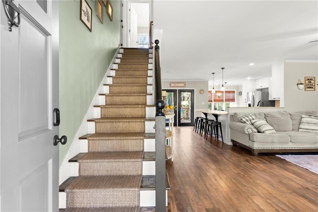 This home is an absolute DREAM! You're immediately greeted by a charming front porch, step inside to a gorgeous, light & bright, open floorplan--the living room is generously sized with a bay window and centered by a cozy fireplace and built in bookcases, and is open to a beautiful white kitchen with granite countertops, stainless steel appliances, and tons of storage, even a long peninsula perfect for hosting/entertaining. Adorable banquette takes advantage of breakfast nook area with extra seating and tons of windows, and built in desk area makes for smart storage space. Primary bedroom on main floor is generous in size with spacious en-suite bathroom including separate tub and shower, and walk in closet. An additional powder room on the main floor as well as laundry conveniently located. Upstairs, find 2 additional spacious bedrooms with dormer window nooks adding to the charm as well as a secondary bathroom. Basement level offers additional living area/office/playroom/exercise space--whatever is needed! And just wait til you see this fenced-in yard! Recently built deck is a great extension of the living area and kitchen and overlooks a sprawling, over half acre flat yard with a fireplace at the back to soak up the outdoors! All of this in the heart of Woodstock--super quick highway access, 5 minute drive to Target or Walmart, 10 minutes to downtown Woodstock, and tons of grocery stores right around the corner (including Aldi, Lidl, Kroger, Sprouts & more!) It's everywhere you want to be, don't miss your chance to call it home!