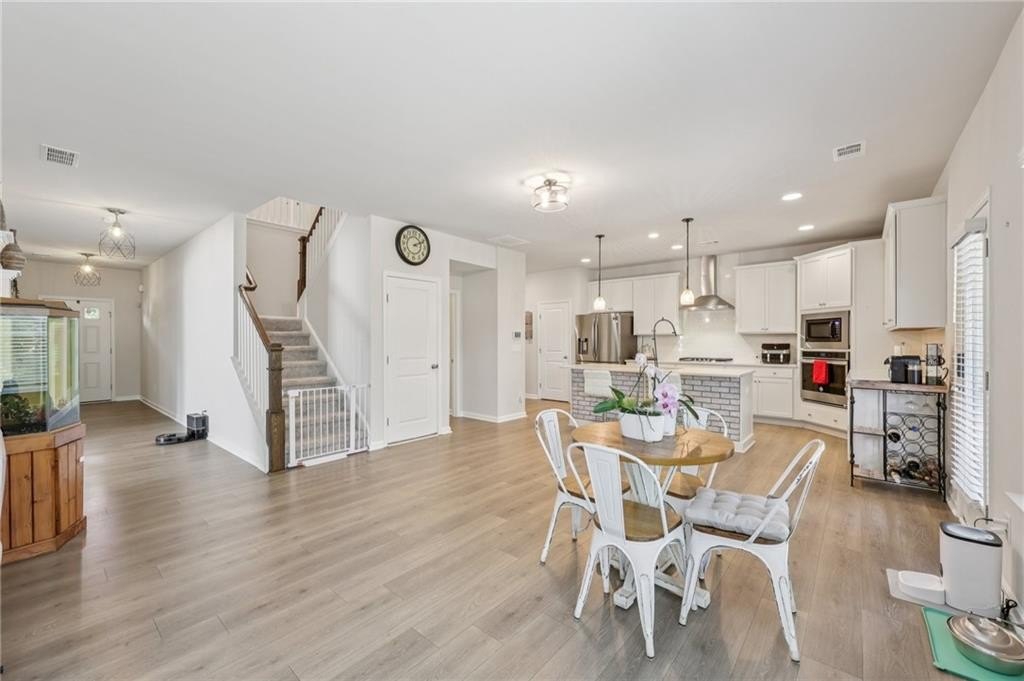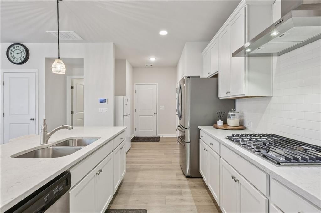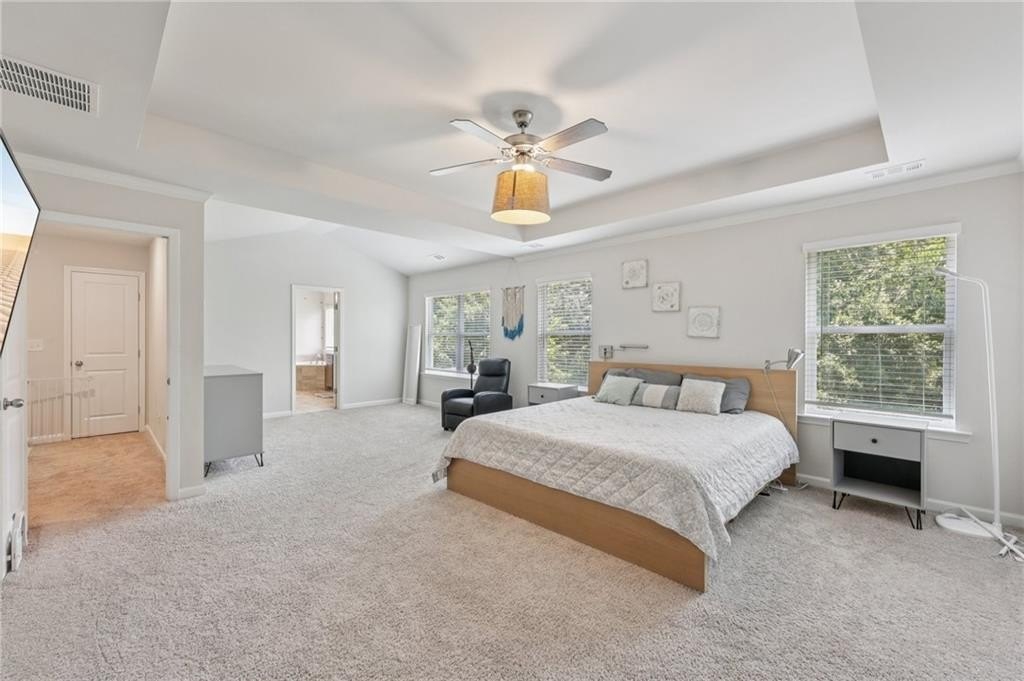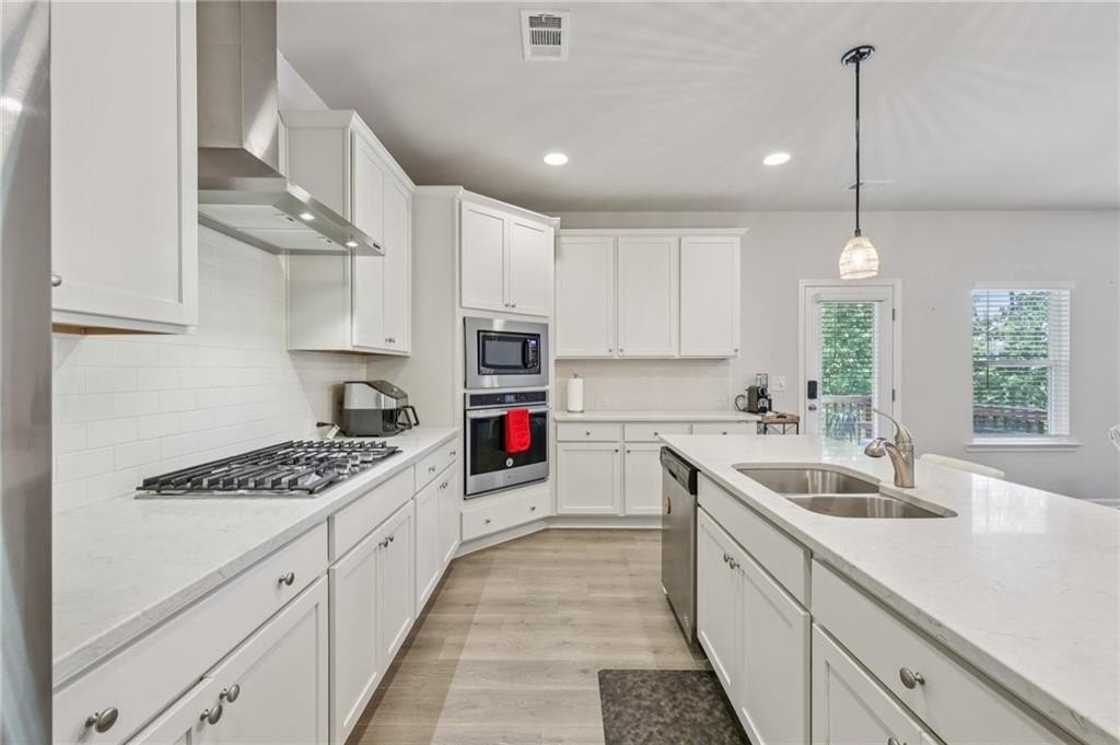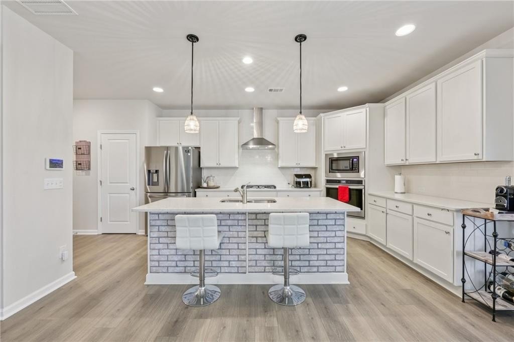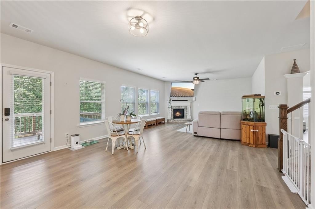 Southern Charm Meets Modern Comfort! This beautifully landscaped home welcomes you with a classic rocking-chair front porch. Inside, durable vinyl wood flooring flows throughout the main level. A stylish home office with sliding barn doors sits just off the entryway while columns and an arched entryway leads to a formal dining room. The bright, open-concept living room features a cozy fireplace and connects seamlessly to the on-trend kitchen with white cabinets, large island, stainless steel appliances, tile backsplash, and plenty of prep space. Upstairs, the oversized primary suite offers a tray ceiling, sitting area, luxurious en-suite with dual vanities, soaking tub, tiled shower, and walk-in closet. Two bedrooms share a Jack-and-Jill bath, while a fourth has its own private en-suite. The finished basement adds incredible versatility with a large open area, built-in bar with sink and dishwasher, plus a bedroom and full bath—ideal for guests or entertaining. Outside, enjoy a fully fenced backyard oasis with a 10x20 covered deck, 12x30 patio (partially covered), hot tub outlet, fire pit, garden space, and landscape lighting. Additional perks include a 2-car garage with overhead storage, extended 3-car parking pad, new hot water heater, and new basement AC. Book your tour today!