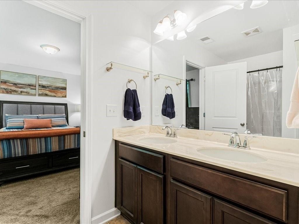 Upstairs, the primary suite provides a peaceful retreat with a walk-in closet and a private ensuite bath featuring a dual vanity. Two additional bedrooms share a full hallway bath, and the laundry area is conveniently located on the same level for ease and efficiency.