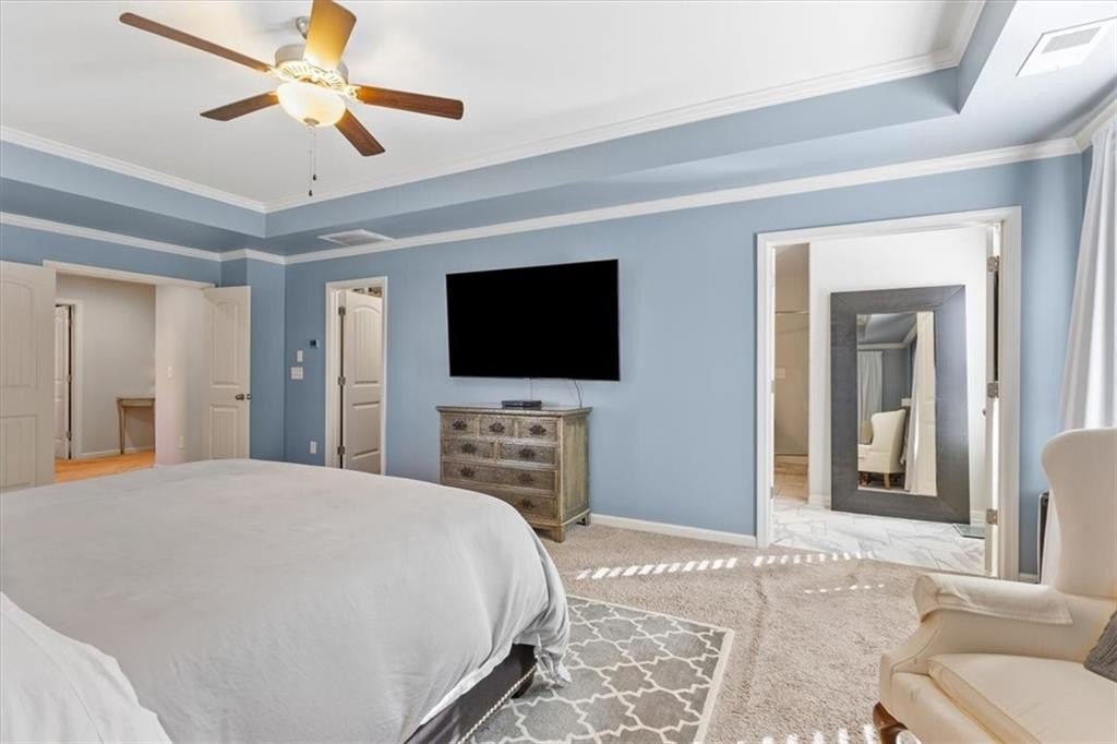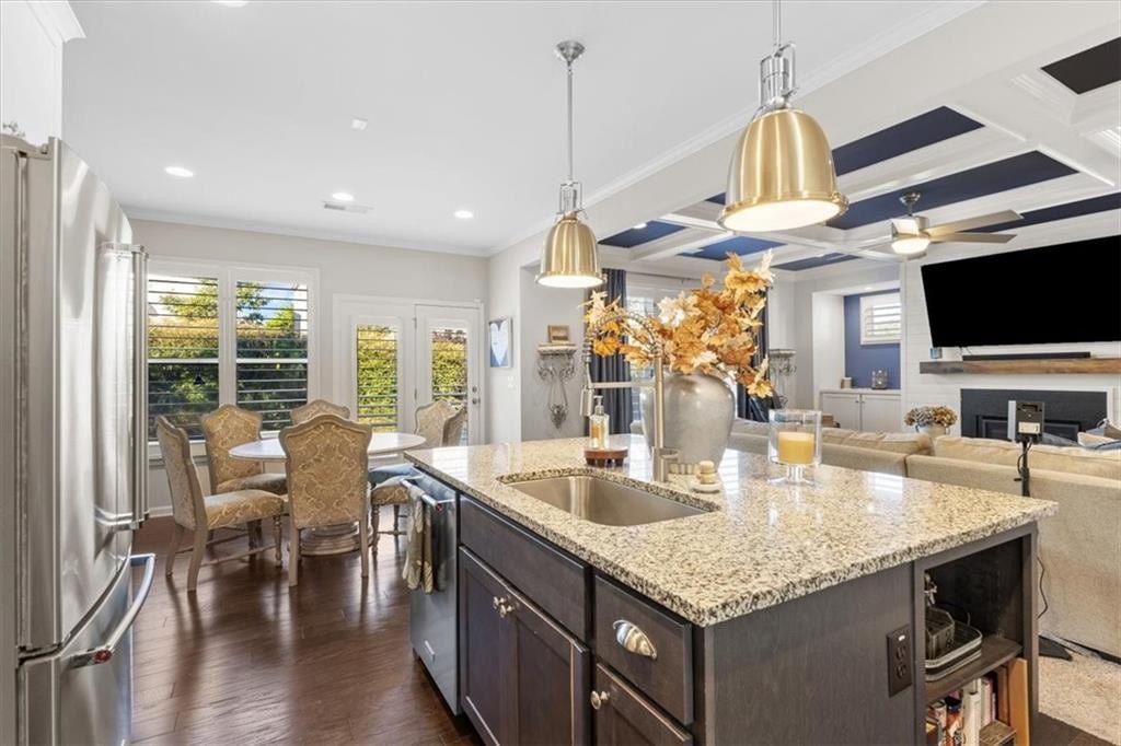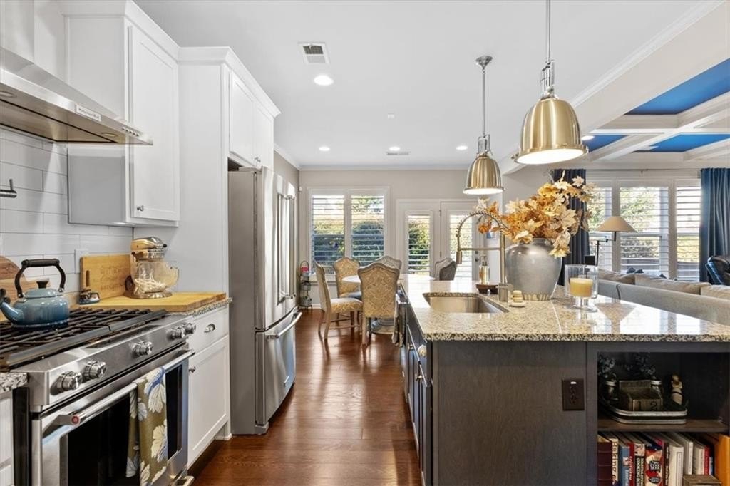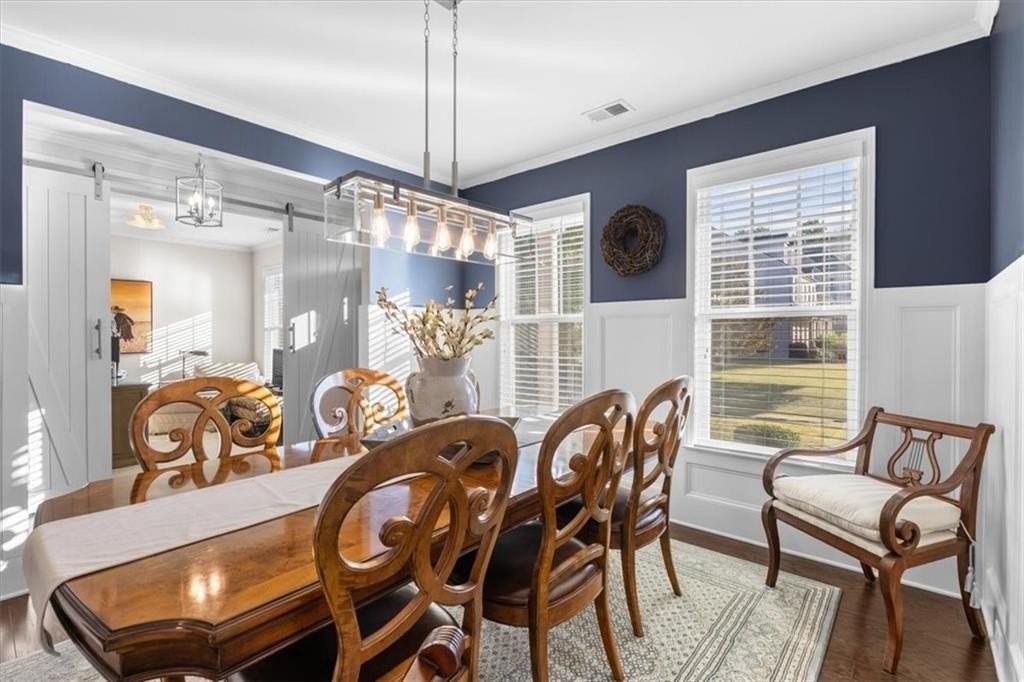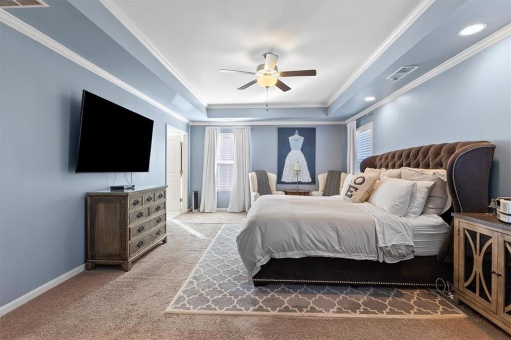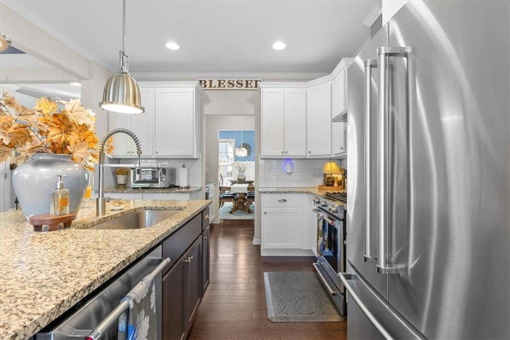 Perfectly positioned in the heart of Buford, this traditional two-story home blends timeless charm, modern comforts, and an unbeatable location. Enjoy close proximity to TOP-RATED SCHOOLS, as well as endless options for shopping, dining, and year-round entertainment. Spend weekends at Bogan Park, on nearby golf courses, or take a short drive to Lake Lanier for boating, fishing, and outdoor adventures. The community amenities enhance your lifestyle with an Olympic-style pool featuring a shallow area for little swimmers, tennis and pickleball courts, and an outdoor fireplace, perfect for relaxing or gathering with neighbors. The home’s brick front, distinct dormers, and covered rocking chair porch with classic columns create desirable curb appeal. Step through the NEW STEEL FRONT DOOR into an inviting foyer flanked by a formal sitting room or home office and a dining room with craftsman-style trim. A BUTLER'S PANTRY with beverage cooler connects the dining room to the open-concept great room, featuring a floor-to-ceiling ship-lap fireplace with custom built-ins, coffered ceiling, and ample space for entertaining. The eat-in kitchen is both stylish and functional with a center island and breakfast bar, HIGH-END APPLIANCES, stainless range hood, pot filler, subway tile backsplash, granite countertops, and a comfortable dining nook. Updated lighting throughout the main level adds warmth and character to every space. Off the garage, the mudroom serves as a practical drop zone for daily living. A MAIN LEVEL BEDROOM and full bath with a ship-lap accent wall offer an inviting space for guests or multi-generational living. Upstairs, a spacious landing leads to the OVERSIZED PRIMARY SUITE, highlighted by a tray ceiling, double vanity, walk-in shower with two shower heads, garden tub, and dual closets. Two additional bedrooms, a full bath, and a convenient upstairs laundry room provide comfort and convenience. The BONUS ROOM, currently serving as a media room, comes complete with custom lighting and a FULL MEDIA SYSTEM for movie nights or game days. Additional features include barn doors, plantation shutters, hardwood flooring, and new soft-close toilets in all bathrooms for thoughtful touches that elevate the home’s overall design and livability. Step outside to a spacious EXTENDED PATIO overlooking the LEVEL BACKYARD, ready to be customized into an outdoor area you love. Whether you envision a cozy fire pit, lounge area, or space to dine under the stars, this property offers the perfect layout for enjoying every season.