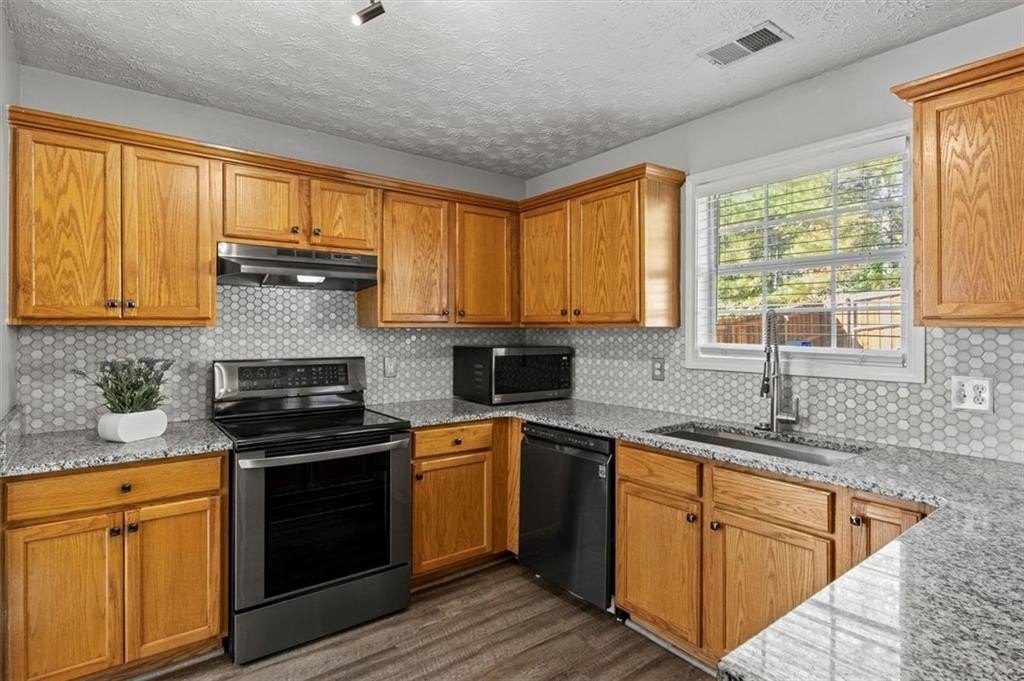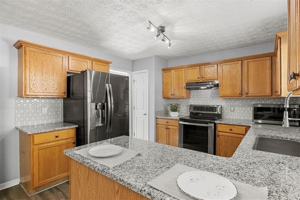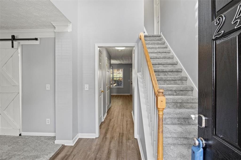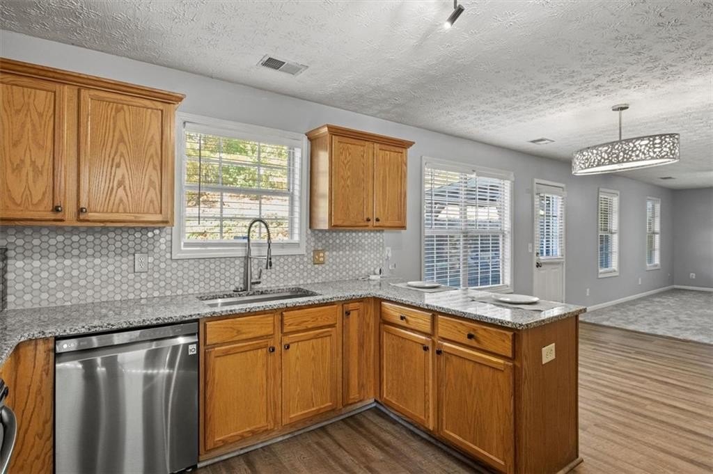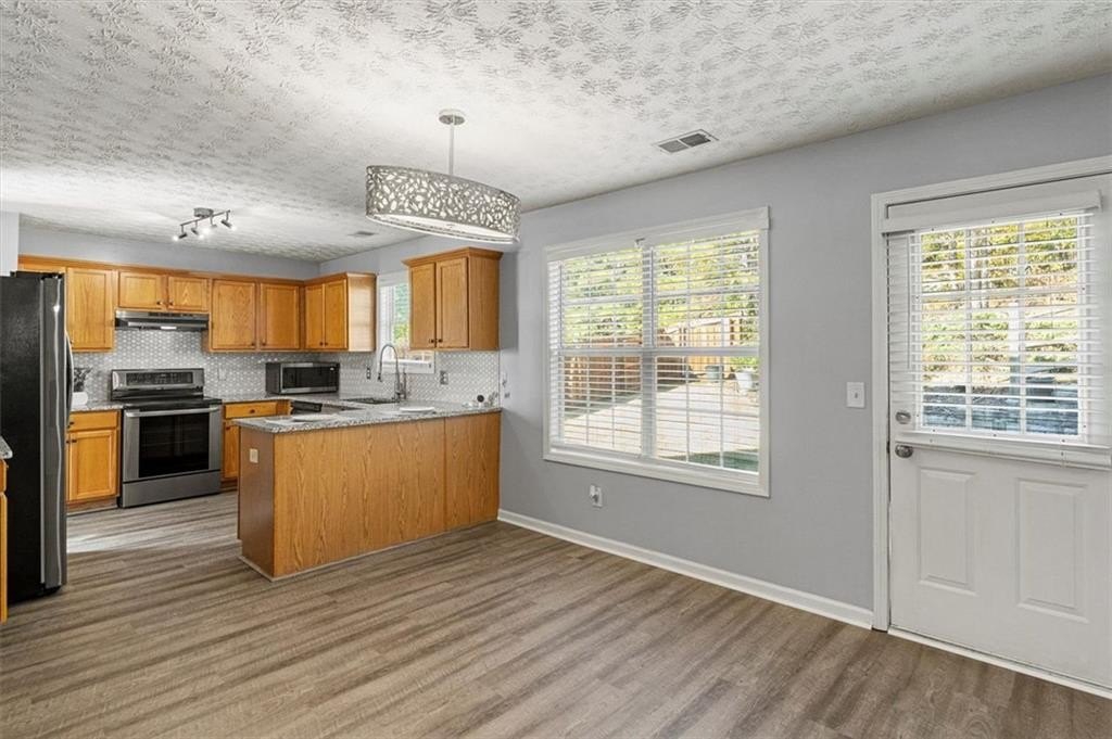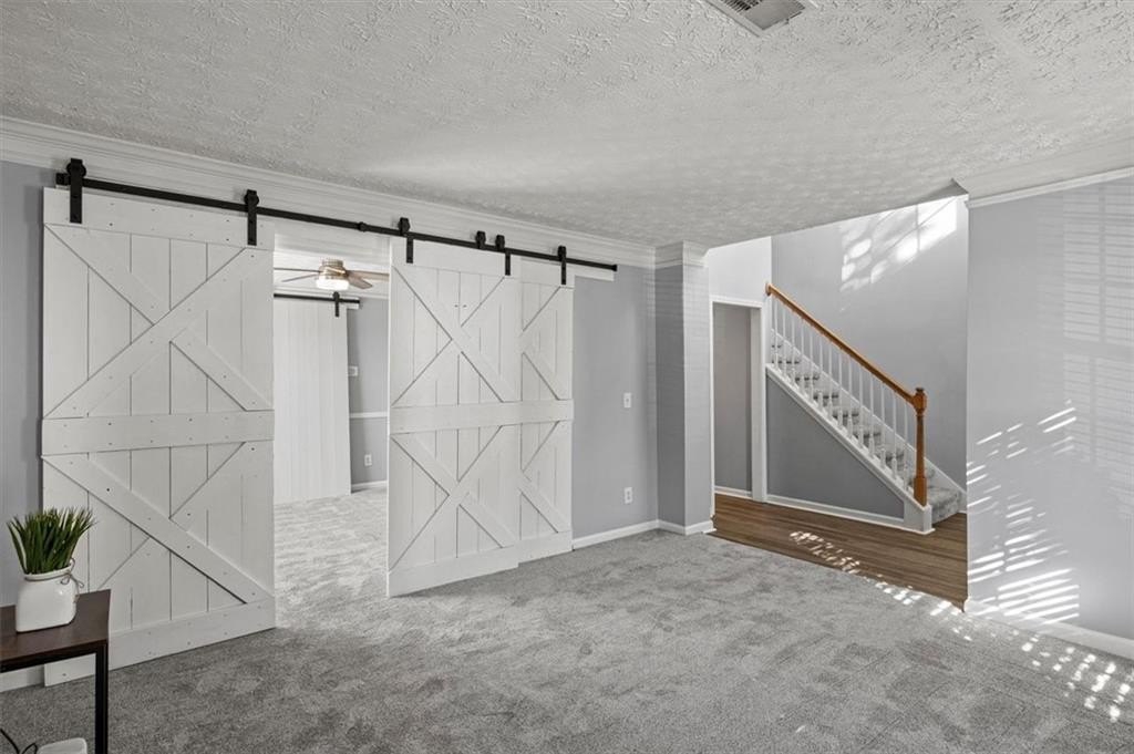 The spacious kitchen is a showstopper with granite countertops, modern backsplash, and contemporary light fixtures throughout. Additional design touches include charming barn doors, upgraded finishes, and an open, inviting layout ideal for entertaining or relaxing.