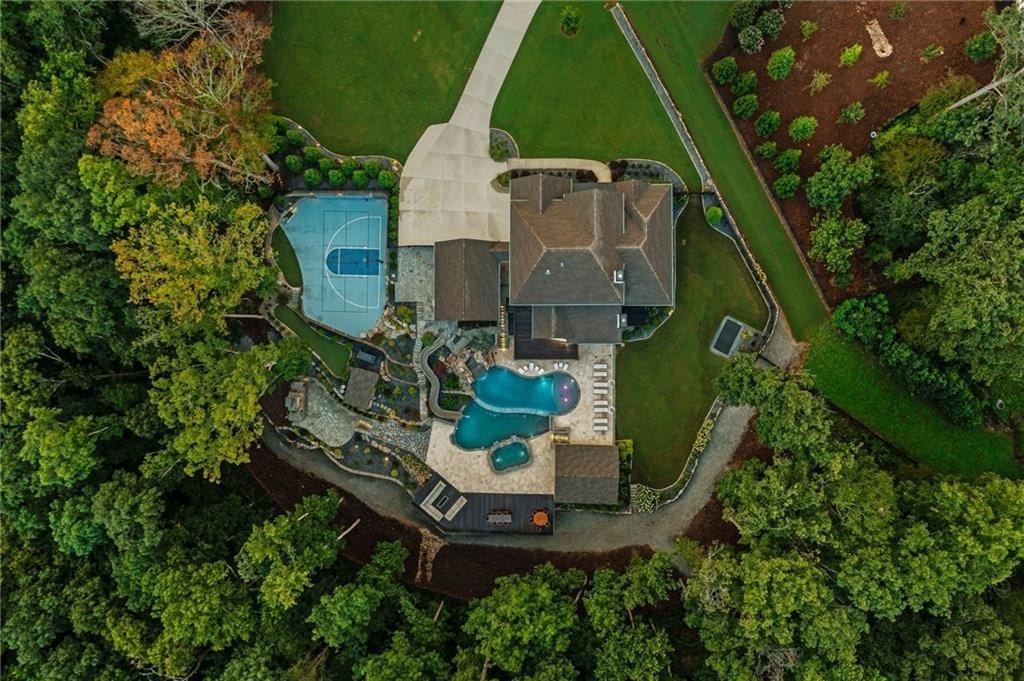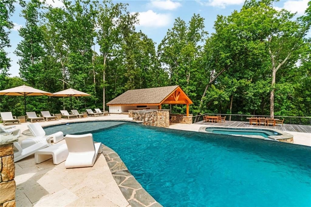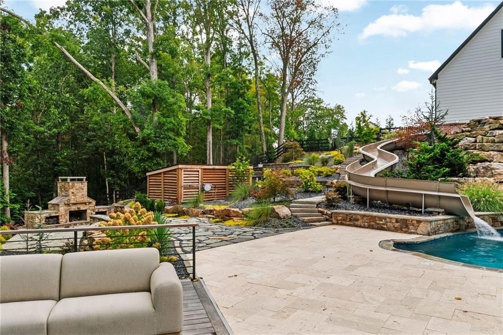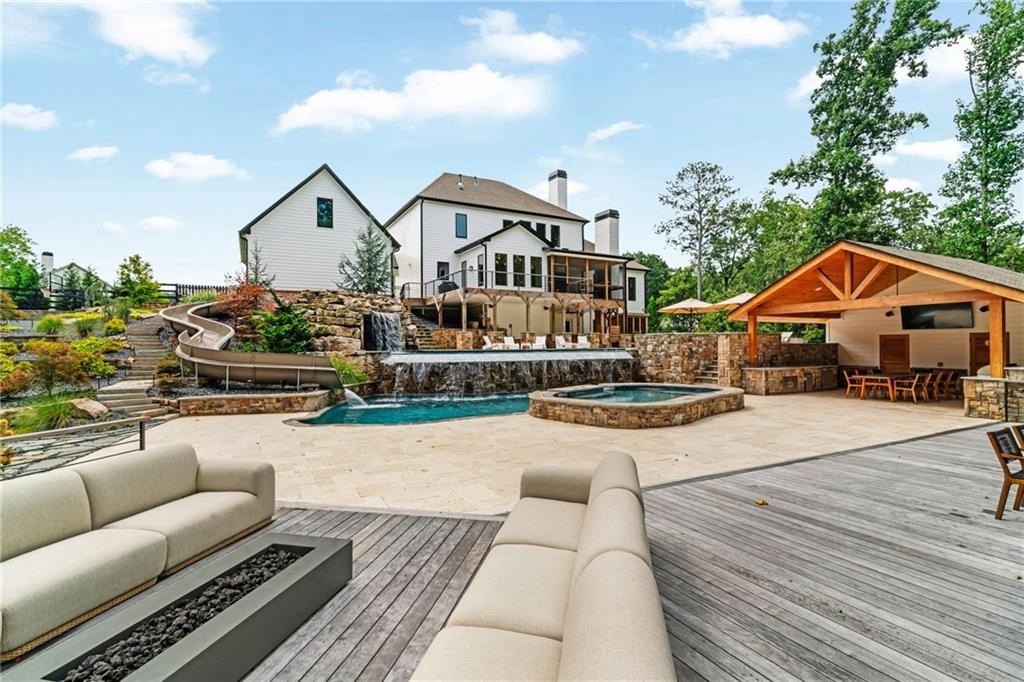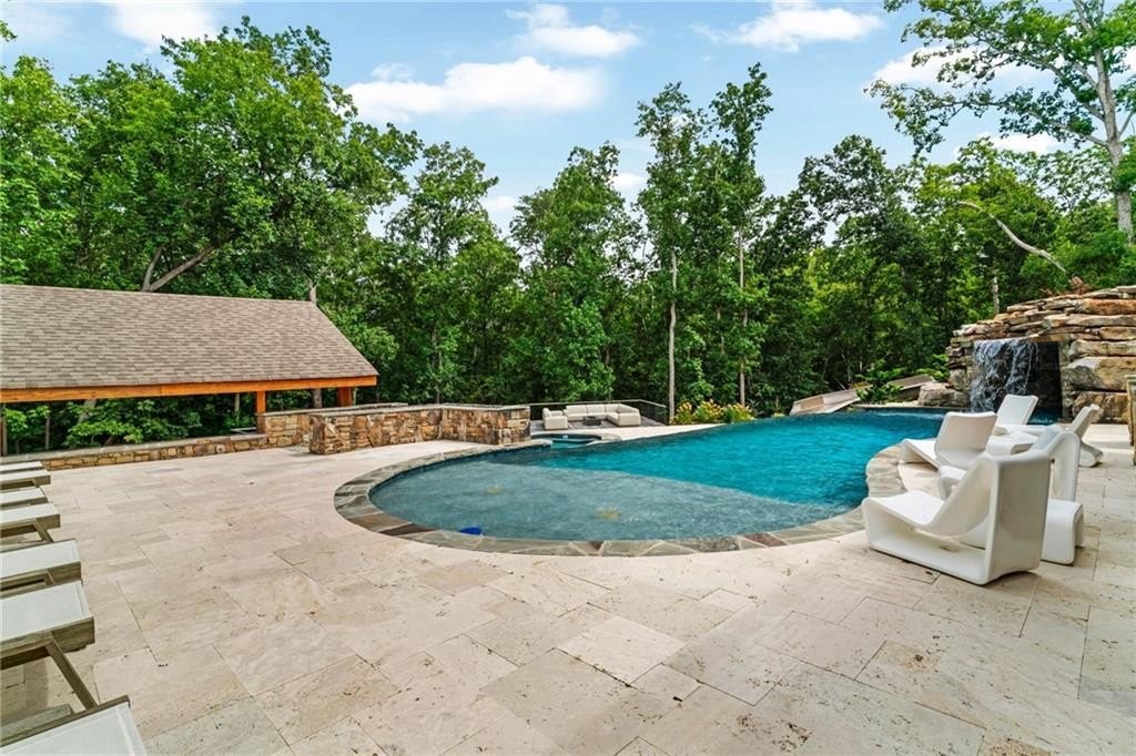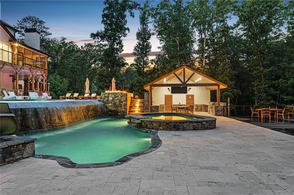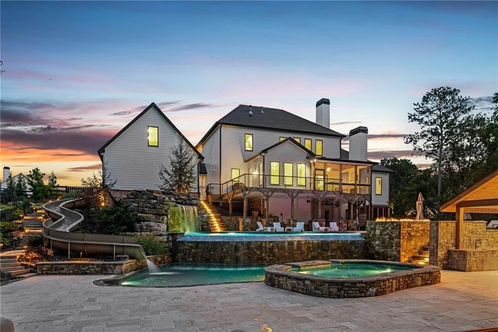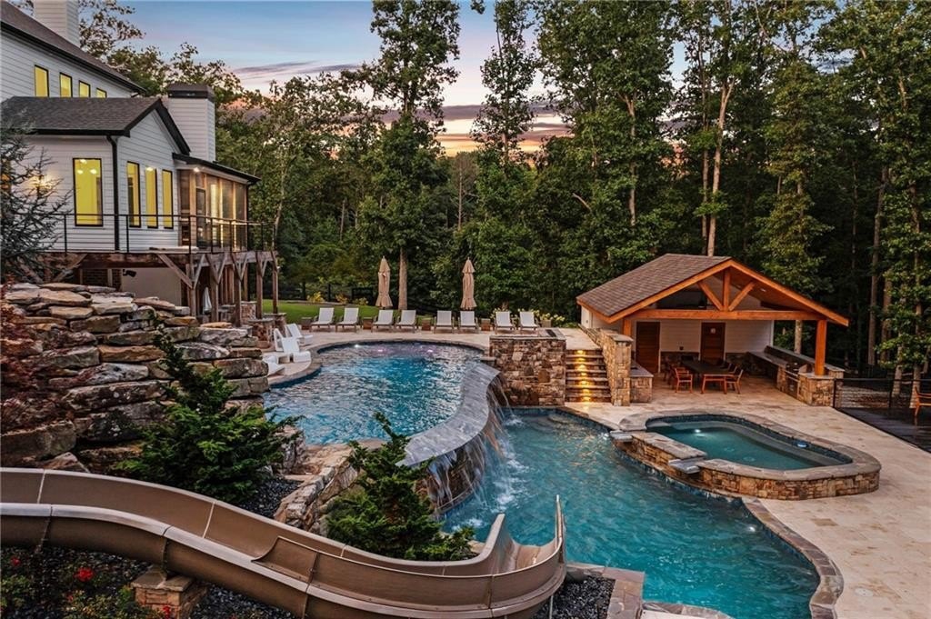The backyard is a true PARADISE with diving ledges, resort-style slides, waterfalls, grottoes, tanning ledges, and a massive hot tub, along with pickleball and basketball courts, a putting green, and an in-ground trampoline. Outdoor living continues with a full kitchen, outdoor bathroom, sauna, private outdoor shower and spectacular outdoor fireplace tucked in the trees for majestic evenings! Covered and screened deck with fireplace is the perfect spot for morning coffee! Custom lighting enhances both the home and backyard, creating a stunning evening ambiance, while a full irrigation system keeps the grounds lush and a full house generator provides peace of mind. A rocking chair front porch adds classic Southern charm, while the attached two-car garage and detached two-car garage provide space for four vehicles in total. Above the detached garage, a private office / bonus space is ideal for a home office, studio, or man cave. The property also features a private hiking trail that leads directly to Canton Creek and waterfall.