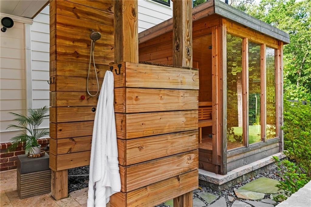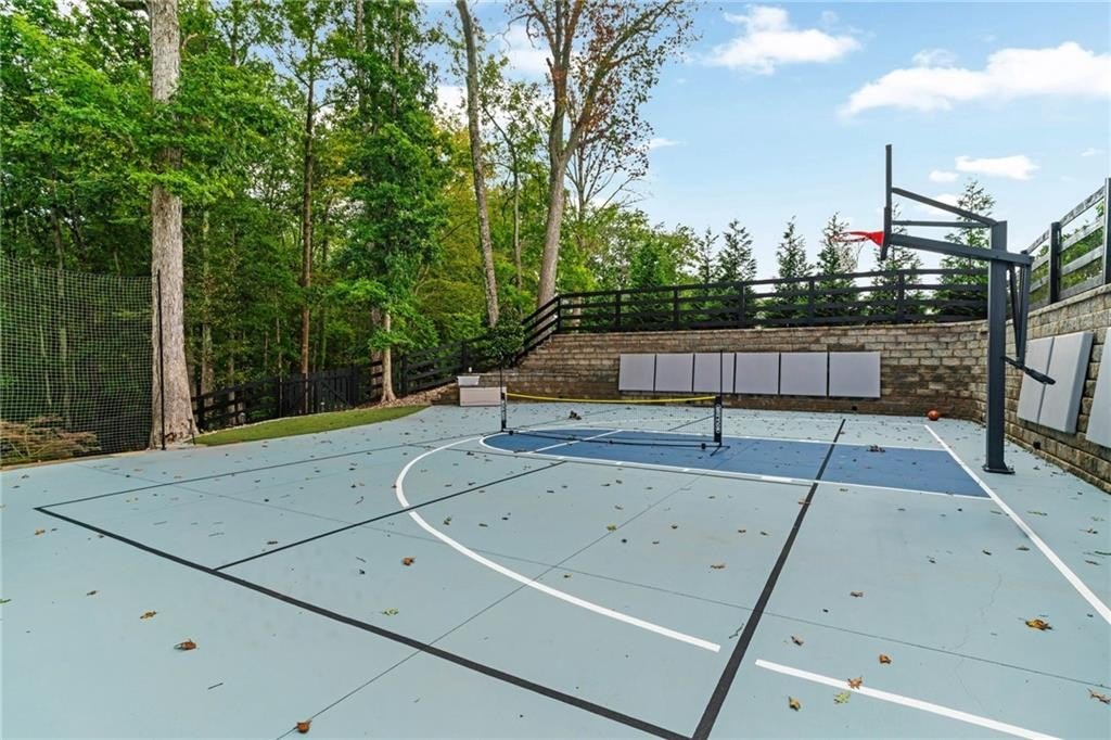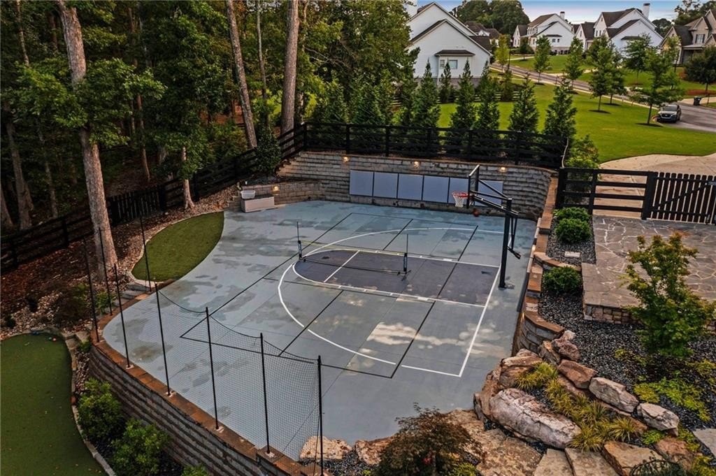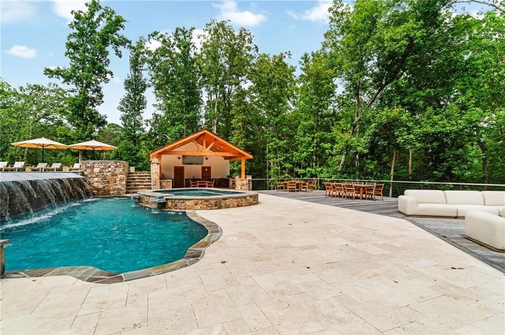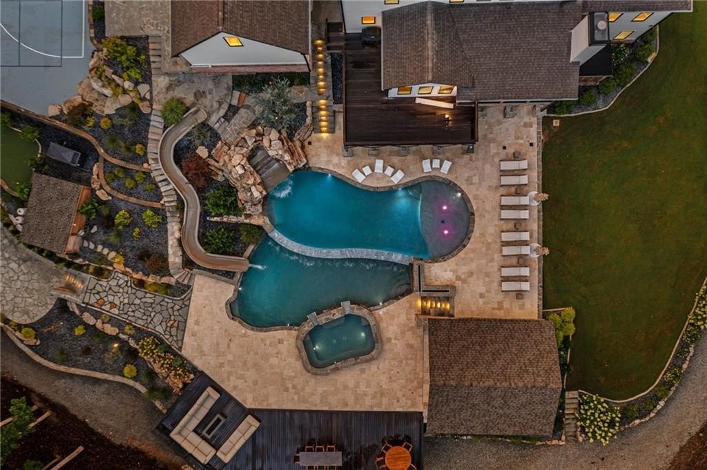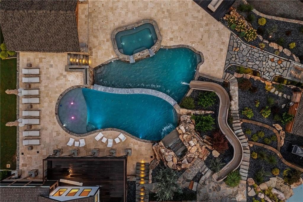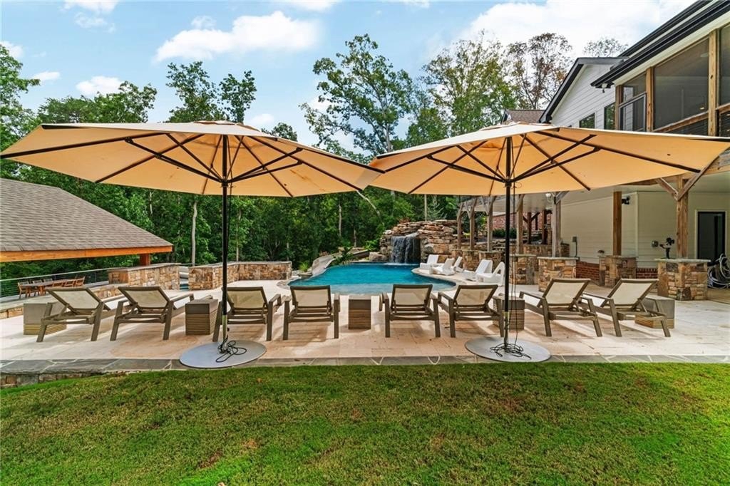 The backyard is a true PARADISE with diving ledges, resort-style slides, waterfalls, grottoes, tanning ledges, and a massive hot tub, along with pickleball and basketball courts, a putting green, and an in-ground trampoline. Outdoor living continues with a full kitchen, outdoor bathroom, sauna, private outdoor shower and spectacular outdoor fireplace tucked in the trees for majestic evenings! Covered and screened deck with fireplace is the perfect spot for morning coffee! Custom lighting enhances both the home and backyard, creating a stunning evening ambiance, while a full irrigation system keeps the grounds lush and a full house generator provides peace of mind. A rocking chair front porch adds classic Southern charm, while the attached two-car garage and detached two-car garage provide space for four vehicles in total. Above the detached garage, a private office / bonus space is ideal for a home office, studio, or man cave. The property also features a private hiking trail that leads directly to Canton Creek and waterfall.