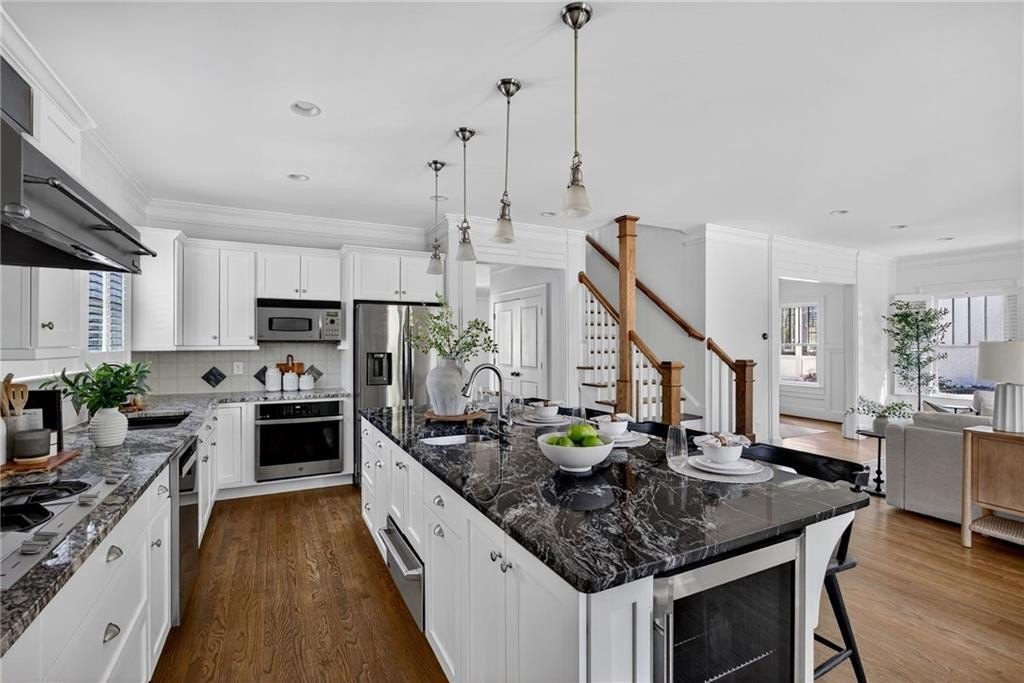 Inside, incredible natural light filters through generous windows, illuminating spaces that feel both refined and welcoming. The main level was designed for connection, with formal and casual areas flowing seamlessly together — from the fireside living room to the dining room ideal for gathering. The kitchen anchors it all with an open layout and inviting warmth, perfectly suited for entertaining or quiet mornings at home.