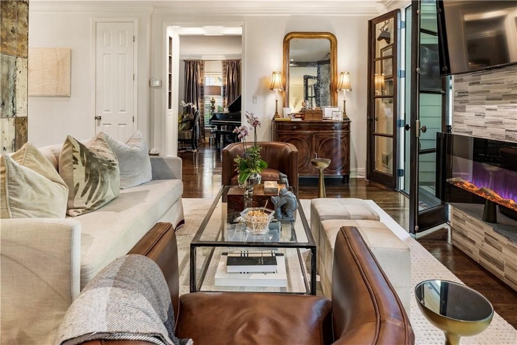 From the professionally reimagined landscaping to the elegantly redesigned interior, every detail has been thoughtfully curated and impeccably maintained. Natural light pours into the home through oversized windows and custom 96” mahogany French doors, highlighting 9-foot ceilings, gleaming hardwood floors, and custom crown molding throughout. The spacious main level offers a seamless flow for entertaining, featuring a sunlit formal dining room with custom trim work and easy access to a beautifully appointed wet bar with quartz counters and a granite sink. The formal living room boasts built-in bookcases and a marble-surround fireplace, while the adjoining family room opens directly to an expansive deck overlooking the serene, wooded preserve—perfect for fireside dining, relaxing, or enjoying the stars with the newly installed outdoor TV.