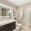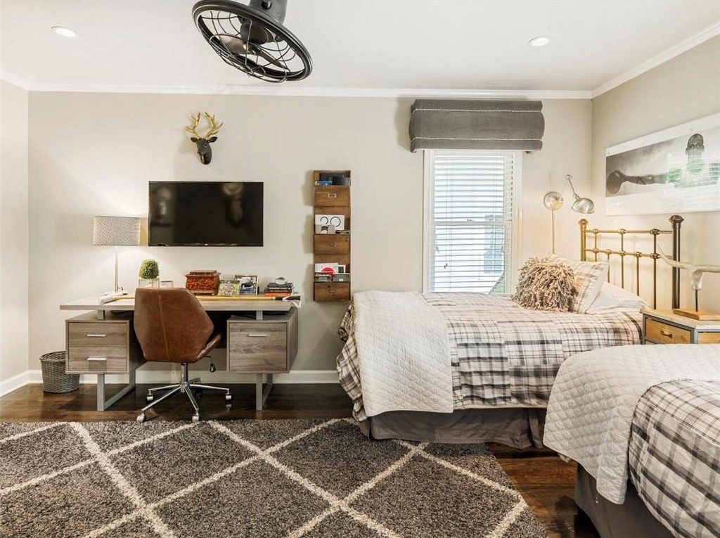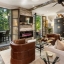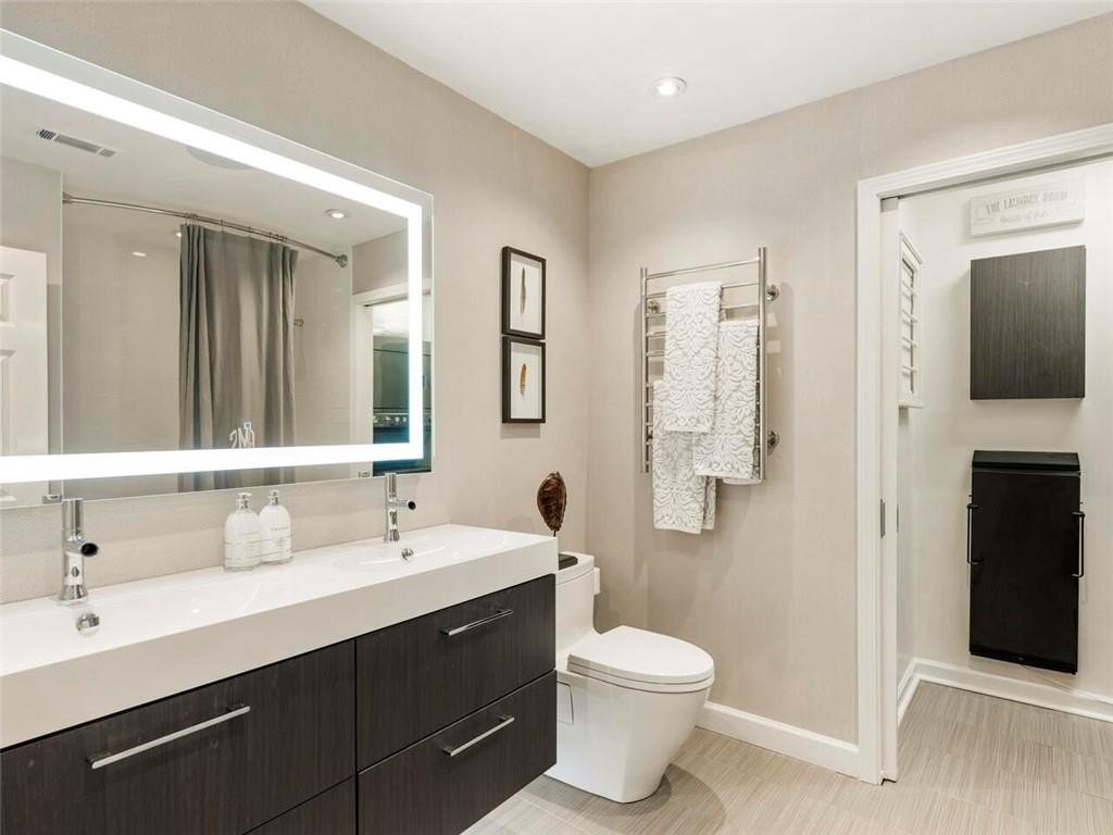 Upstairs, the primary suite is a tranquil retreat featuring a sitting area, a custom walk-in closet, and a stunning marble-walled spa bath with a double fluted vanity, slipper tub, frameless glass shower, heated towel warmer, and smart toilet with temperature-controlled bidet. Two additional spacious bedrooms offer hardwood flooring, custom closets, and access to a renovated guest bathroom with a floating double vanity, quartz counters, TOTO toilet, linen cabinet, and built-in lighting. A walk-in laundry with full-sized, designer-grey HE washer and dryer is conveniently located on this level.