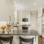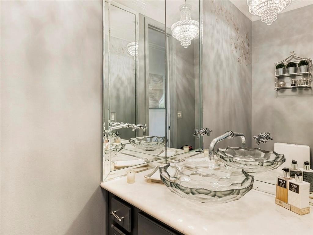 The chef’s kitchen is a true showstopper, outfitted with Cambria quartz countertops, solid wood soft-close cabinetry, a Mother of Pearl backsplash, and top-of-the-line appliances including a custom paneled 42” SubZero refrigerator, Bosch dishwasher, JennAir gas cooktop, convection microwave, and a large undermount granite composite sink with a touchless faucet and premium disposal system. A designer powder room with a Kohler Artist-Edition glass vessel sink and marble-top vanity completes the main level.