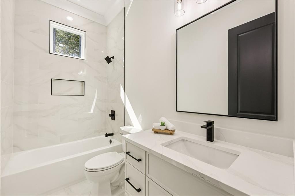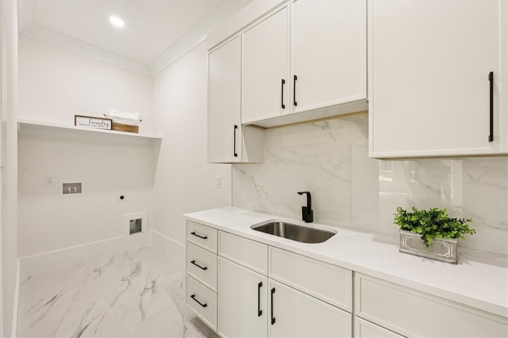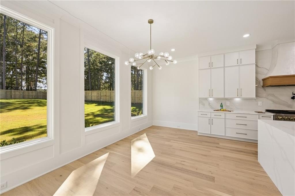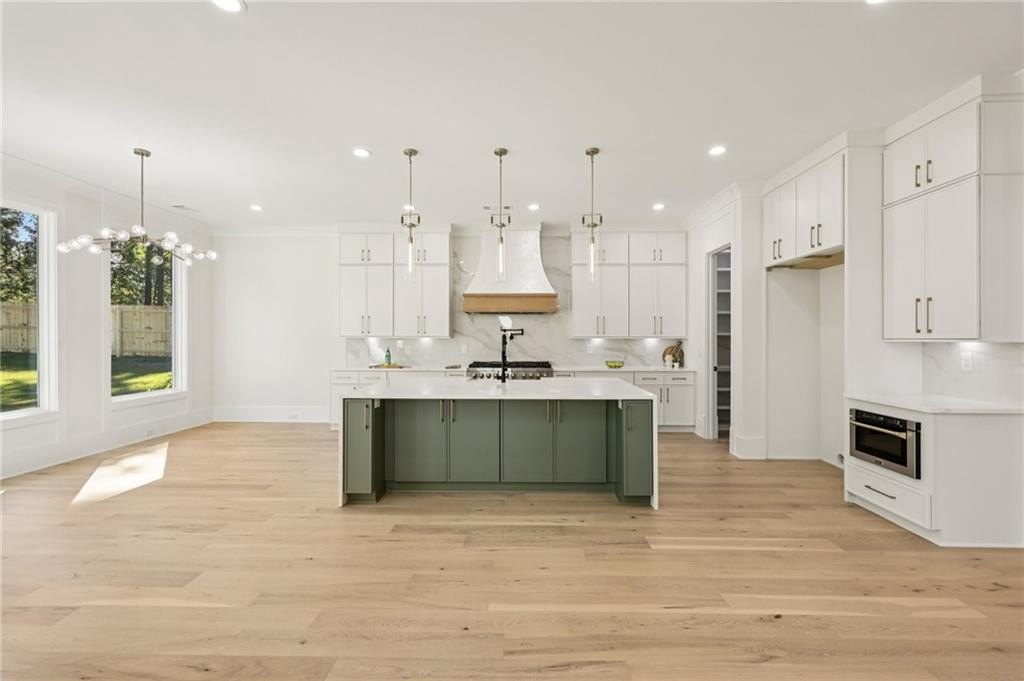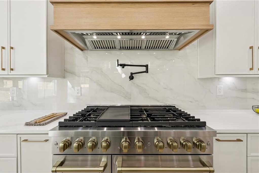 The chef’s kitchen is both beautiful and functional, showcasing an oversized quartz waterfall island, custom cabinetry, porcelain countertops with designer backsplash, and walk-in pantry with built-ins. A premium ZLINE appliance package includes a 6-burner gas range with grill, double ovens, microwave, dishwasher, pot filler, and exterior-vented hood. Enjoy gatherings in the formal dining room with statement chandelier or the breakfast area that opens directly to the back patio.
