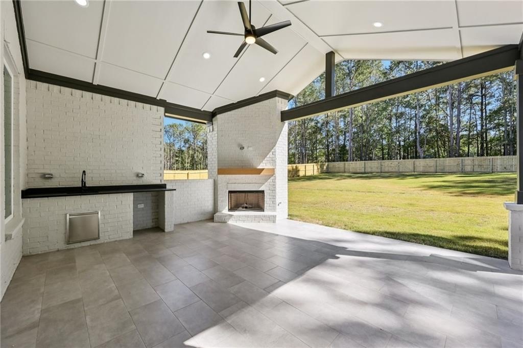 Outdoor living is equally refined with four-sided brick construction, a fully fenced yard, professional landscaping, exterior lighting, and irrigation with efficient drainage design. The spacious covered patio—complete with sink, gas-starter fireplace, and outdoor-kitchen readiness—overlooks a level backyard, ideal for a future pool.