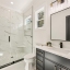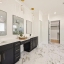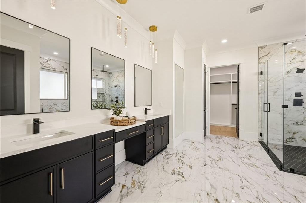 The main-level primary suite is a luxurious retreat featuring a Venetian plaster accent wall, private fireplace, spa-inspired bath with soaking tub, frameless glass shower, dual vanities, and a custom walk-in closet with built-ins. Upstairs, a secondary primary suite offers its own fireplace and ensuite bath, complemented by additional bedrooms, each with walk-in closets and ensuite or direct bath access.