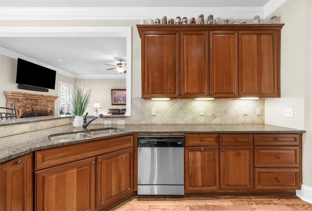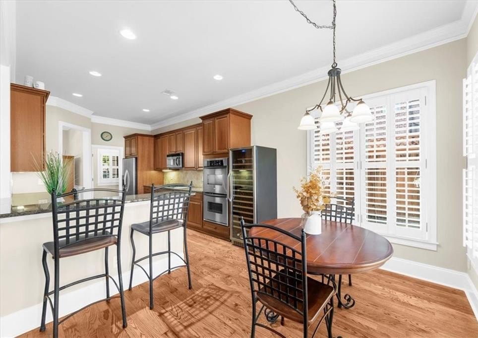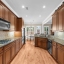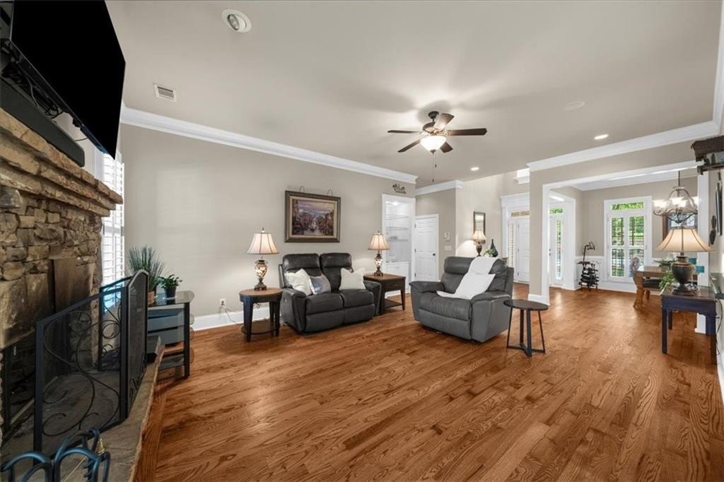 The chef’s kitchen boasts stained cabinetry, expansive stone countertops, and abundant storage. The main level also includes a large bedroom with a walk-in closet and full bath, perfect for guests or a home office.
