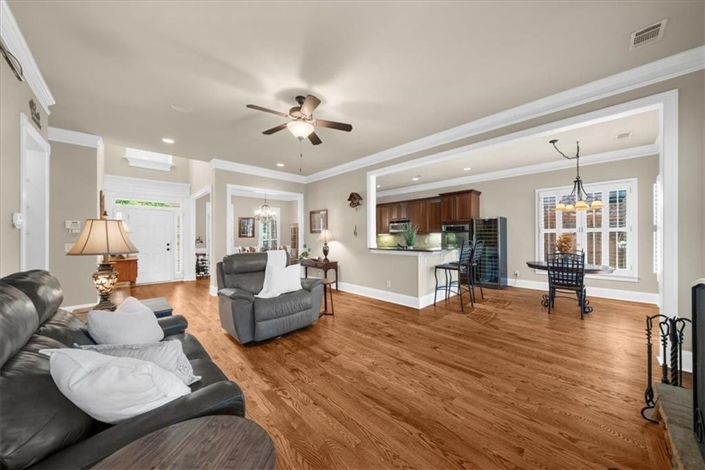 Enter through a charming wrought-iron gate to a covered brick patio, an inviting space to relax and unwind. Inside, the two-story foyer opens to a bright, open-concept floor plan ideal for entertaining or family living. The home features hardwood floors throughout, with the first floor recently refinished and the interior freshly repainted.