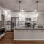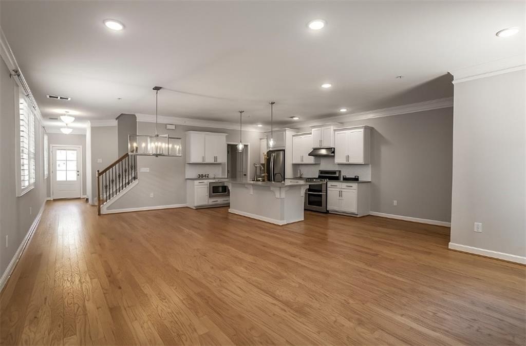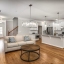 The bright kitchen features stainless steel appliances, white cabinetry, granite counters, and a large island — perfect for entertaining. A spacious dining area flows seamlessly into the living room, creating an ideal space for gatherings.