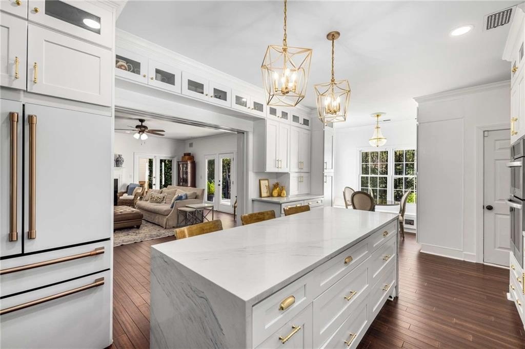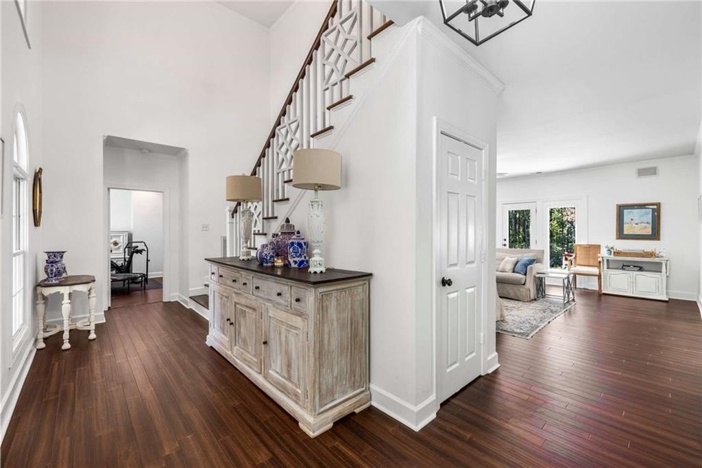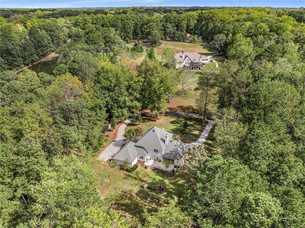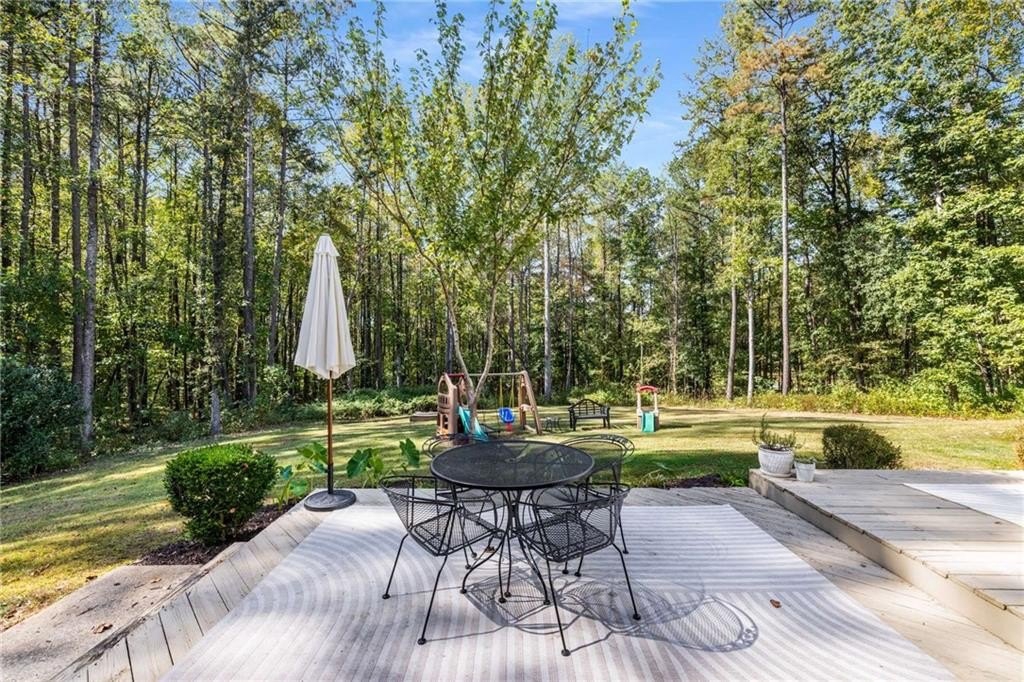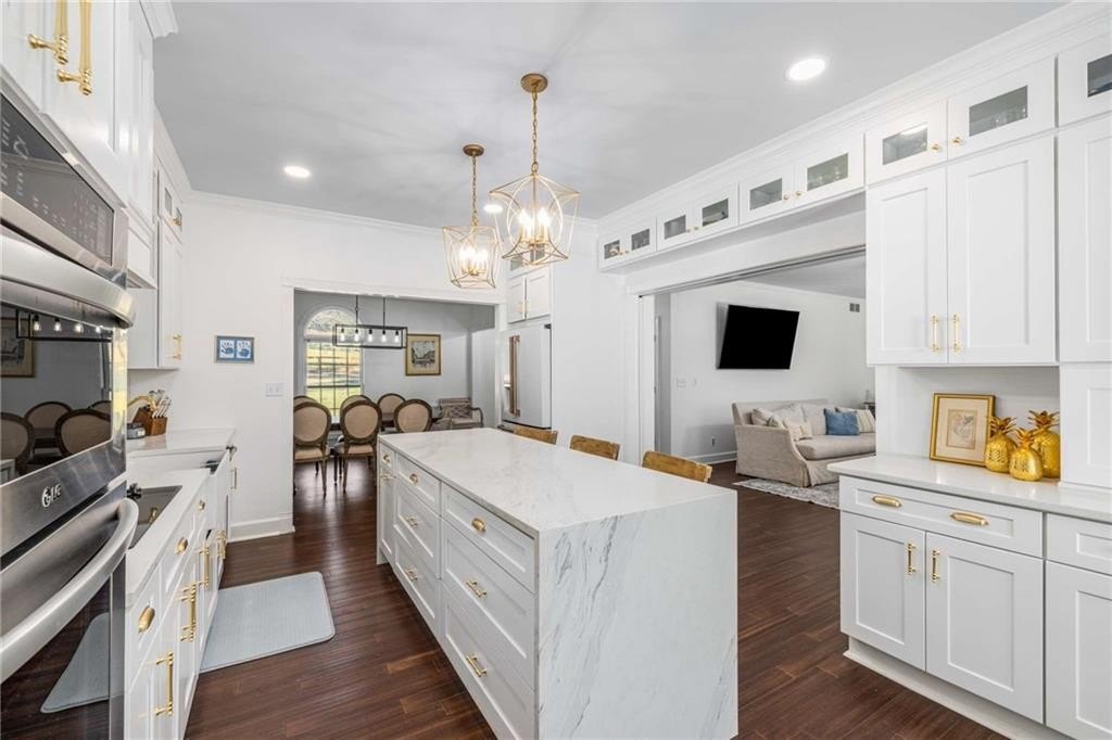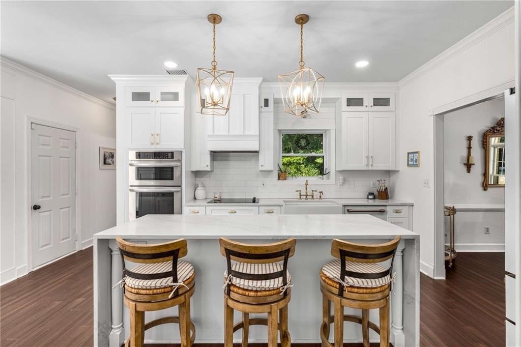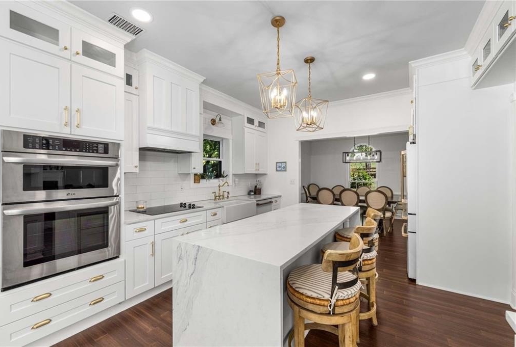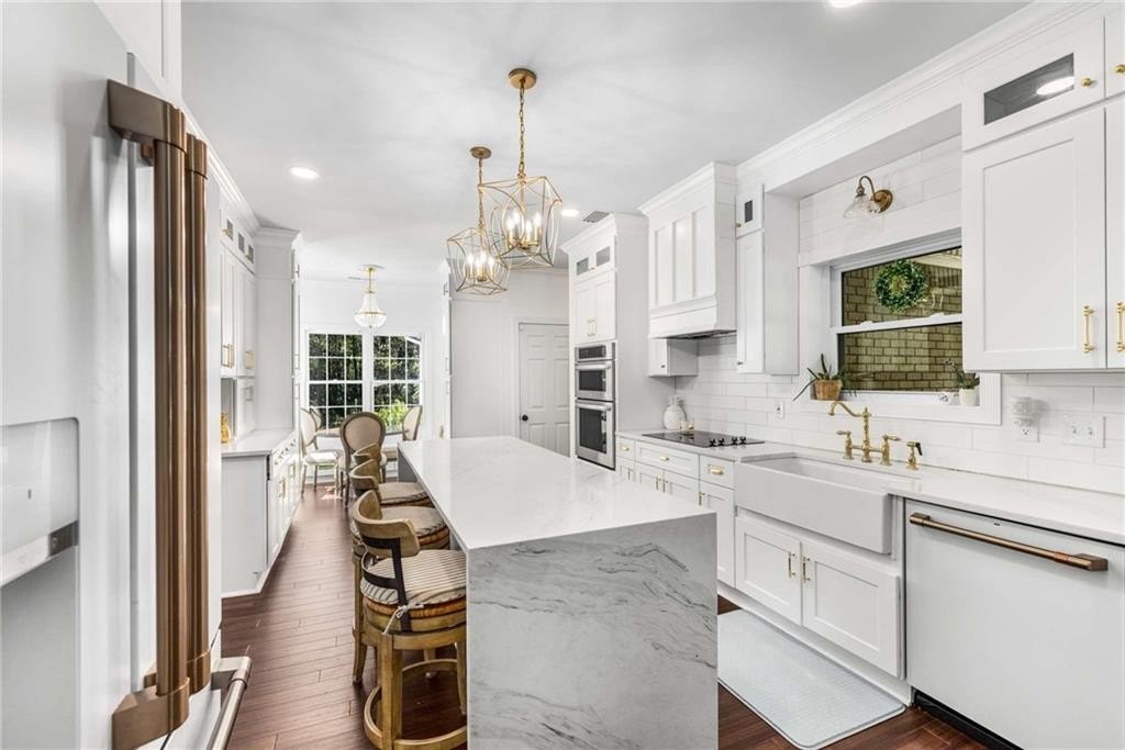 Privately tucked on 4.6 serene, wooded acres, this timeless three-sides brick Colonial blends privacy with polished sophistication and lives like a bespoke estate. A top-to-bottom refresh delivers a truly move-in–ready experience: dark bamboo wood flooring throughout the entire home sets a warm, contemporary tone; a custom-designed staircase railing anchors the entry; and every space has been thoughtfully elevated for daily comfort and effortless entertaining. The completely reimagined kitchen showcases an improved layout with widened openings to the dining and living rooms, including pocket doors for flexible flow. Culinary details impress, cooktop relocated to the back wall with exterior venting, custom cabinetry topped with quartz counters, tile backsplash, and a larger waterfall-edge island with seating. A farmhouse sink with Kingston Brass faucet and a charming breakfast nook with built-in bench complete this magazine-worthy space. Just off the main living areas, the renovated laundry room is both chic and practical—new tile, custom cabinets, quartz countertops with single-slab quartz backsplash, a stainless utility sink, deep enough for dog baths, new faucet, and a built-in dog kennel neatly tucked beneath the cabinetry. The primary suite on the main remains a serene retreat with beautifully refinished cabinetry, granite countertops, soaking tub, dual vanities, and two walk-in closets. Upstairs, smart planning created two full baths where there was once one: a new hall bath with shower/tub combo, fresh tile floors and walls, decorative trim, new vanity and fixtures; and a new private en-suite for the bedroom suite, featuring a stand-up shower, coordinated tile, decorative millwork, vanity, fixtures, and toilet. Secondary bedrooms are generous, and a custom built-in bunk, Twin over Queen, with bookshelf adds function and fun for guests or kids. French doors from the fireside family room open to a large, beautiful deck overlooking a sun-splashed, more open backyard. With coveted zoning for Dowell ES, Smitha MS, and Osborne HS, this residence pairs rare acreage and a quiet setting with curated finishes and modern systems—a luxury escape in the heart of Marietta.