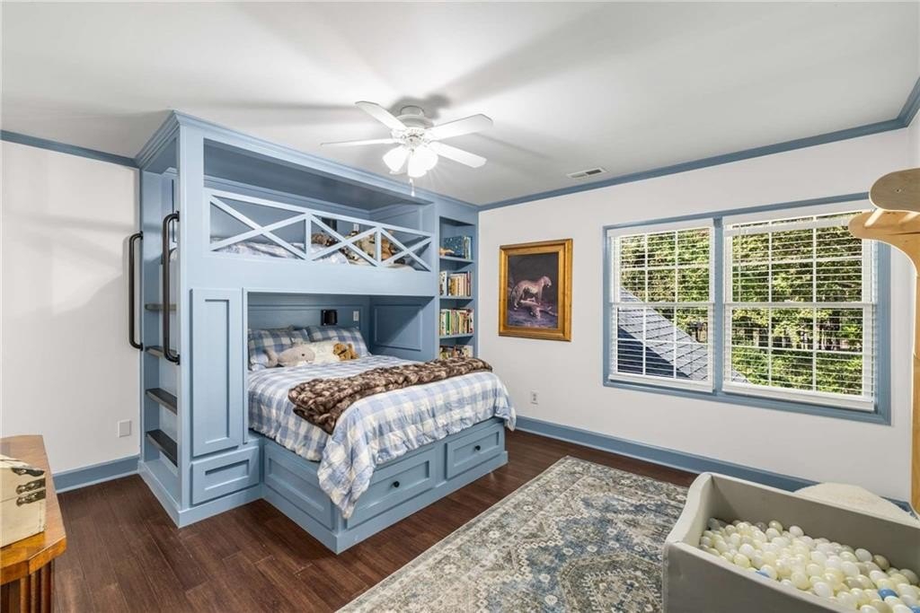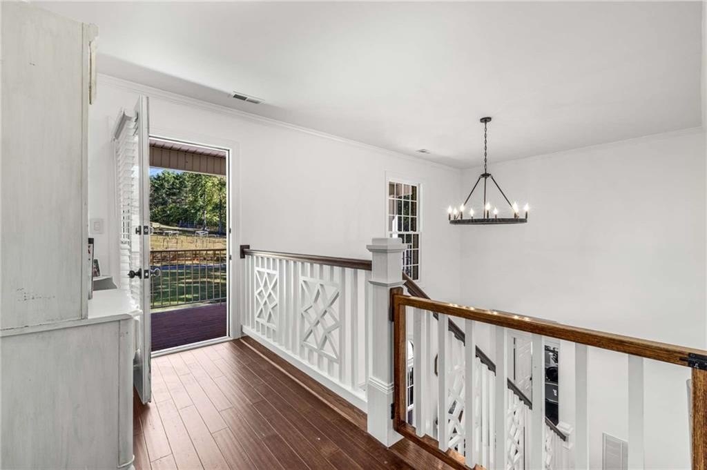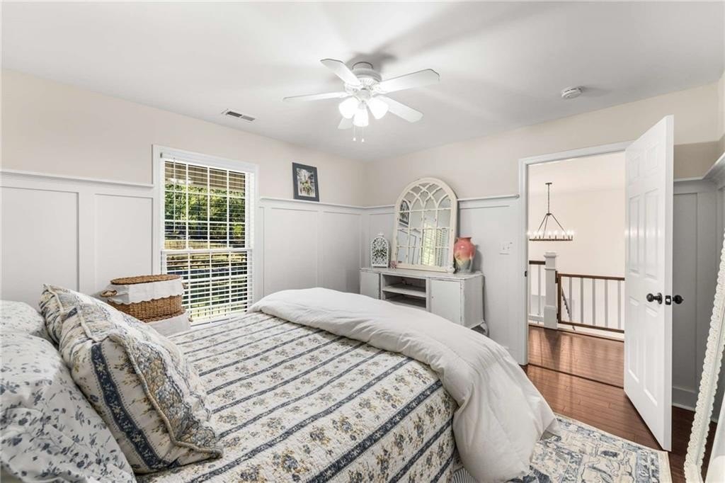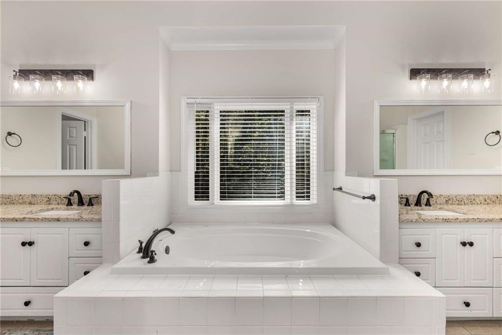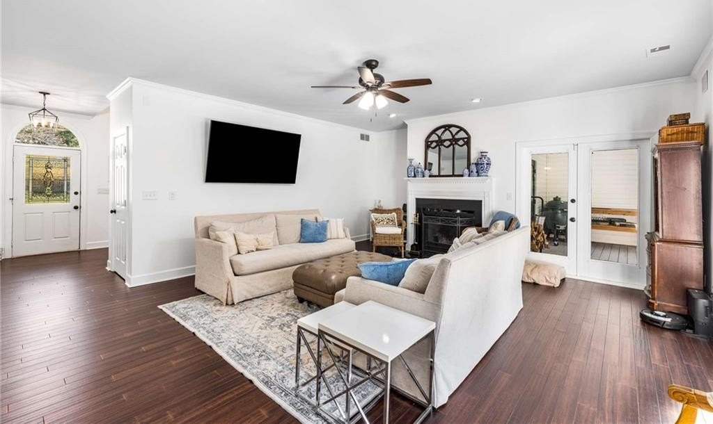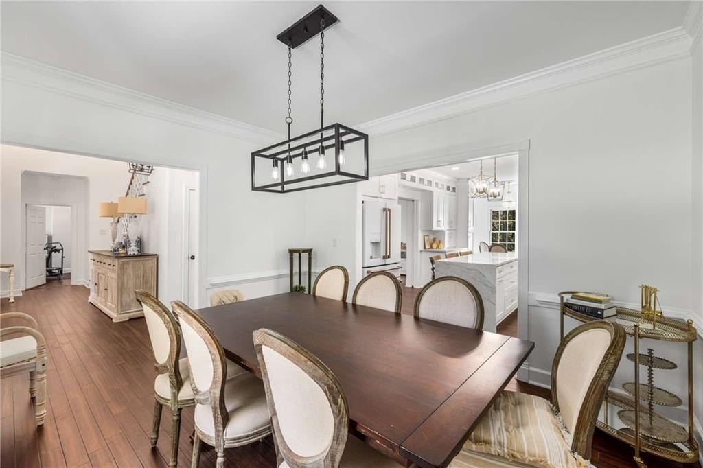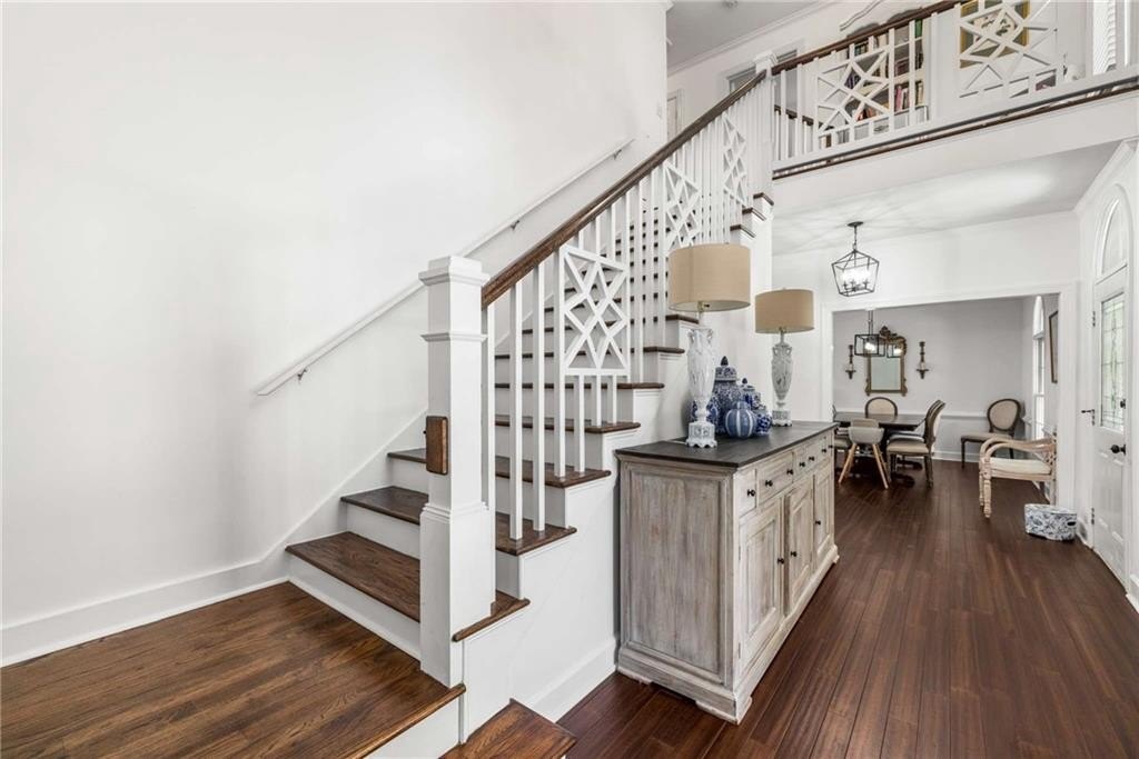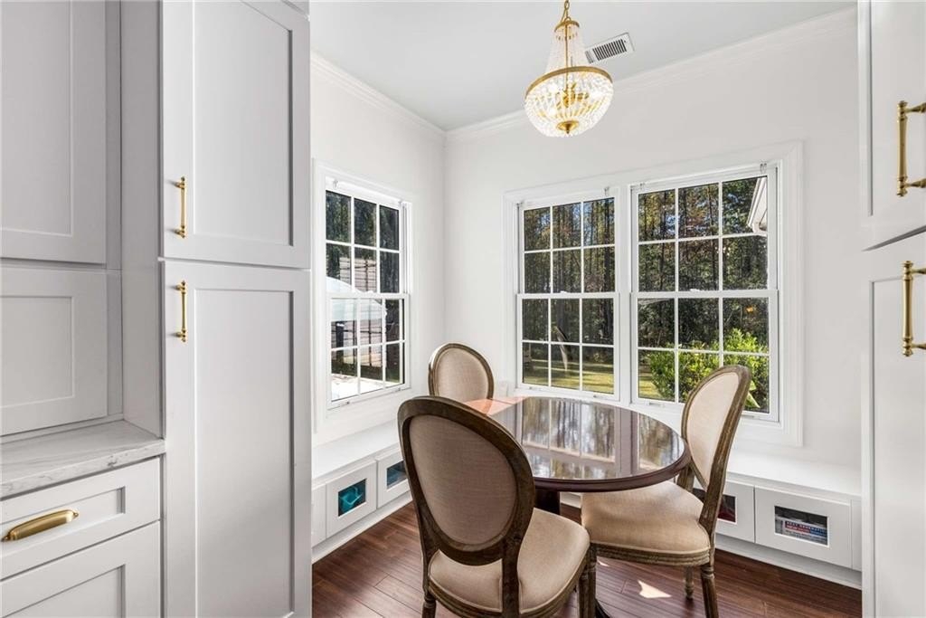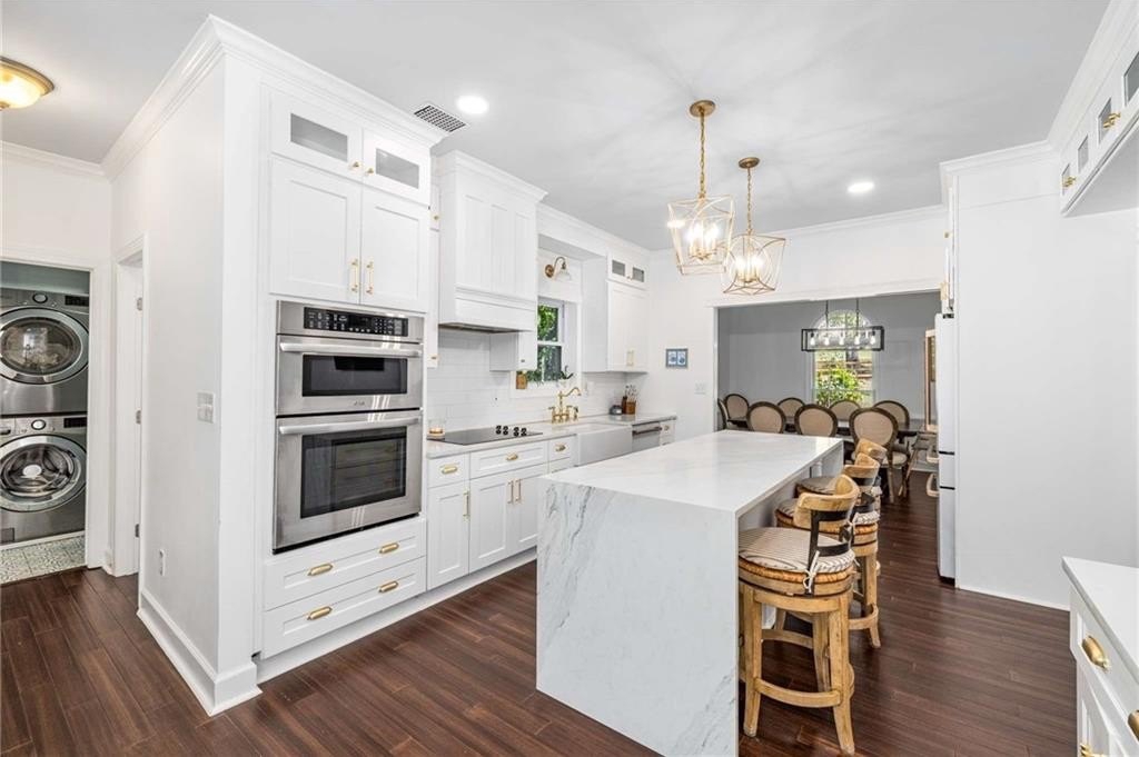 Privately tucked on 4.6 serene, wooded acres, this timeless three-sides brick Colonial blends privacy with polished sophistication and lives like a bespoke estate. A top-to-bottom refresh delivers a truly move-in–ready experience: dark bamboo wood flooring throughout the entire home sets a warm, contemporary tone; a custom-designed staircase railing anchors the entry; and every space has been thoughtfully elevated for daily comfort and effortless entertaining. The completely reimagined kitchen showcases an improved layout with widened openings to the dining and living rooms, including pocket doors for flexible flow. Culinary details impress, cooktop relocated to the back wall with exterior venting, custom cabinetry topped with quartz counters, tile backsplash, and a larger waterfall-edge island with seating. A farmhouse sink with Kingston Brass faucet and a charming breakfast nook with built-in bench complete this magazine-worthy space. Just off the main living areas, the renovated laundry room is both chic and practical—new tile, custom cabinets, quartz countertops with single-slab quartz backsplash, a stainless utility sink, deep enough for dog baths, new faucet, and a built-in dog kennel neatly tucked beneath the cabinetry. The primary suite on the main remains a serene retreat with beautifully refinished cabinetry, granite countertops, soaking tub, dual vanities, and two walk-in closets. Upstairs, smart planning created two full baths where there was once one: a new hall bath with shower/tub combo, fresh tile floors and walls, decorative trim, new vanity and fixtures; and a new private en-suite for the bedroom suite, featuring a stand-up shower, coordinated tile, decorative millwork, vanity, fixtures, and toilet. Secondary bedrooms are generous, and a custom built-in bunk, Twin over Queen, with bookshelf adds function and fun for guests or kids. French doors from the fireside family room open to a large, beautiful deck overlooking a sun-splashed, more open backyard. With coveted zoning for Dowell ES, Smitha MS, and Osborne HS, this residence pairs rare acreage and a quiet setting with curated finishes and modern systems—a luxury escape in the heart of Marietta.