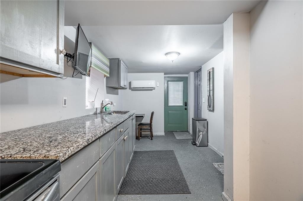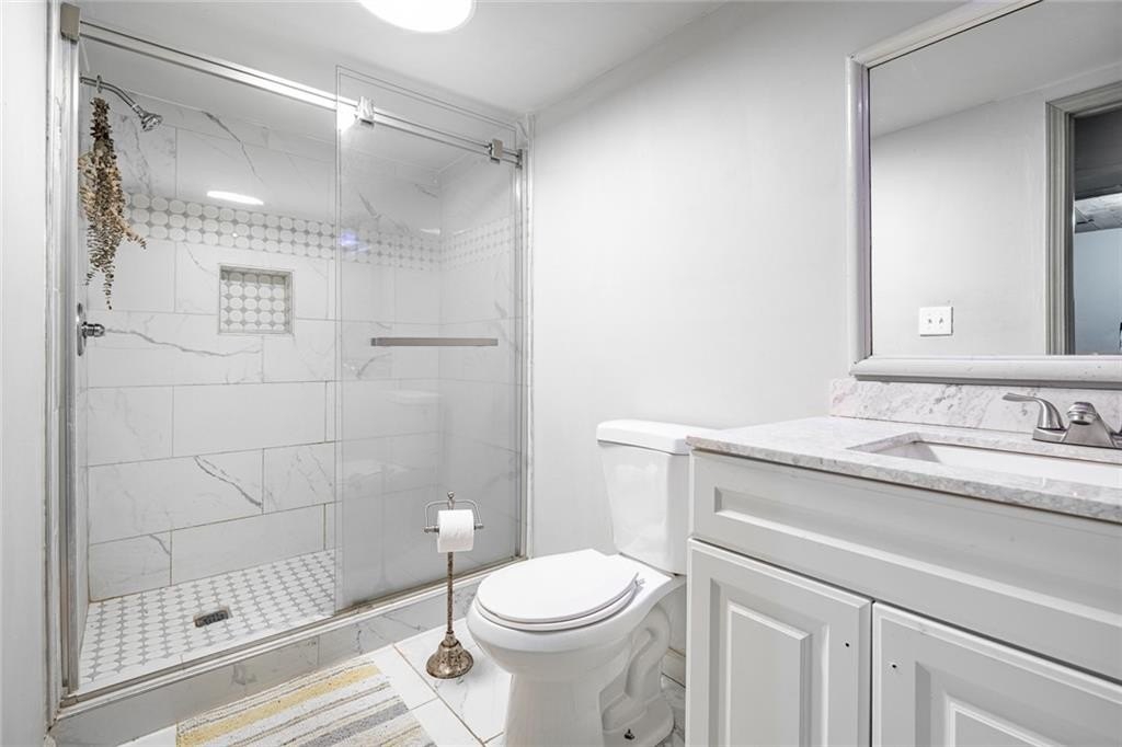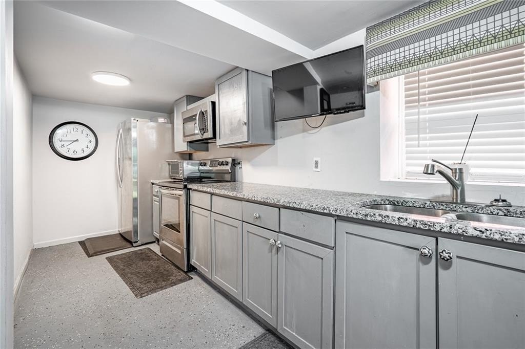 Main Level, the bright and inviting kitchen boasts stone countertops, newer stainless steel appliances, and a breakfast area that overlooks the spacious living room—perfect for everyday living or entertaining.