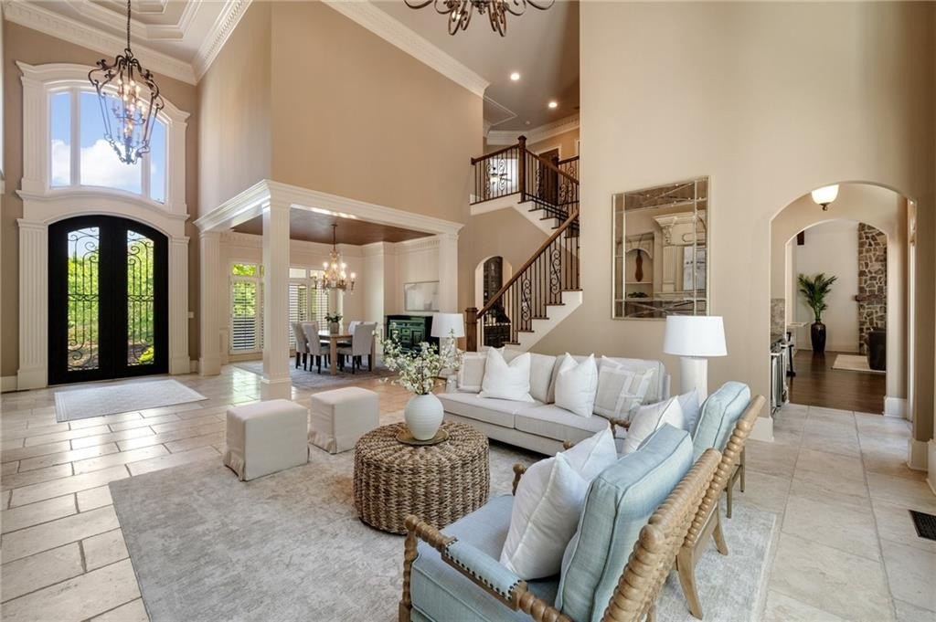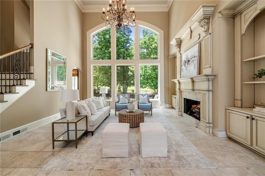 Tucked into a quiet cul-de-sac street within one of Suwanee’s most prestigious 24/7 guard-gated communities, this executive showpiece blends luxury with thoughtful functionality and convenience. It offers a rare combination of security, top-tier schools, and is just steps away from resort-caliber amenities, all within one of North Atlanta’s most desirable lifestyle settings. Privately positioned along the 15th fairway of the Jack Nicklaus-designed golf course, you're met with scale and substance from the moment you enter through the elegant oversized entry doors. The foyer opens to a formal dining room and a private study, while just beyond lies a two-story, fireside great room anchored by a breathtaking wall of windows giving you unobstructed views of the patio, foliage and golf course.