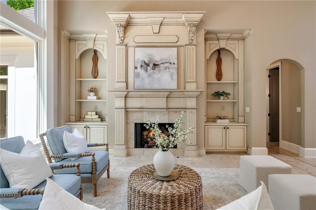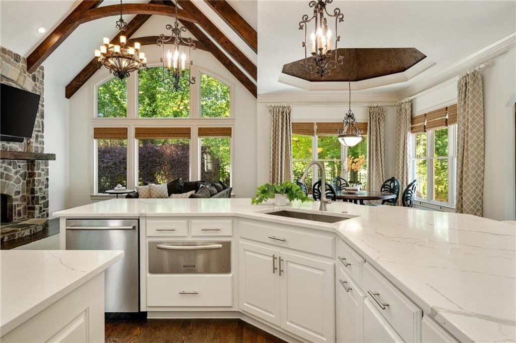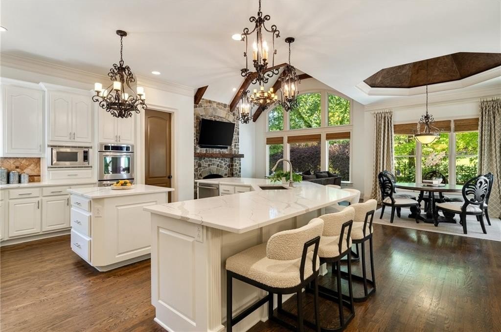 At the heart of the home, a transformed kitchen is outfitted with quartz countertops, 5-burner KitchenAid cooktop, double ovens, warming drawer and whisper-quiet Bosch dishwasher. The space is designed for everyday ease and relaxation as it opens to a breathtaking vaulted family room that features one of the homes 4 fireplaces.
