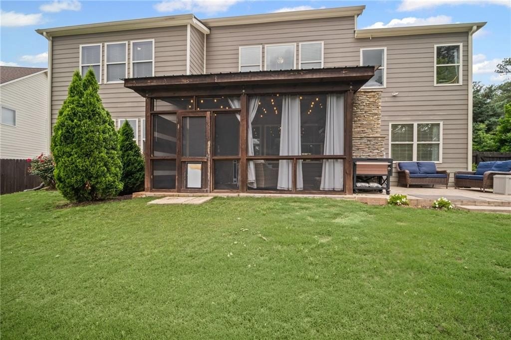The outdoor area is complete with a screened patio, stone fireplace (gas), ceiling fan, and wood privacy fence, perfect for relaxing evenings or weekend get-togethers.