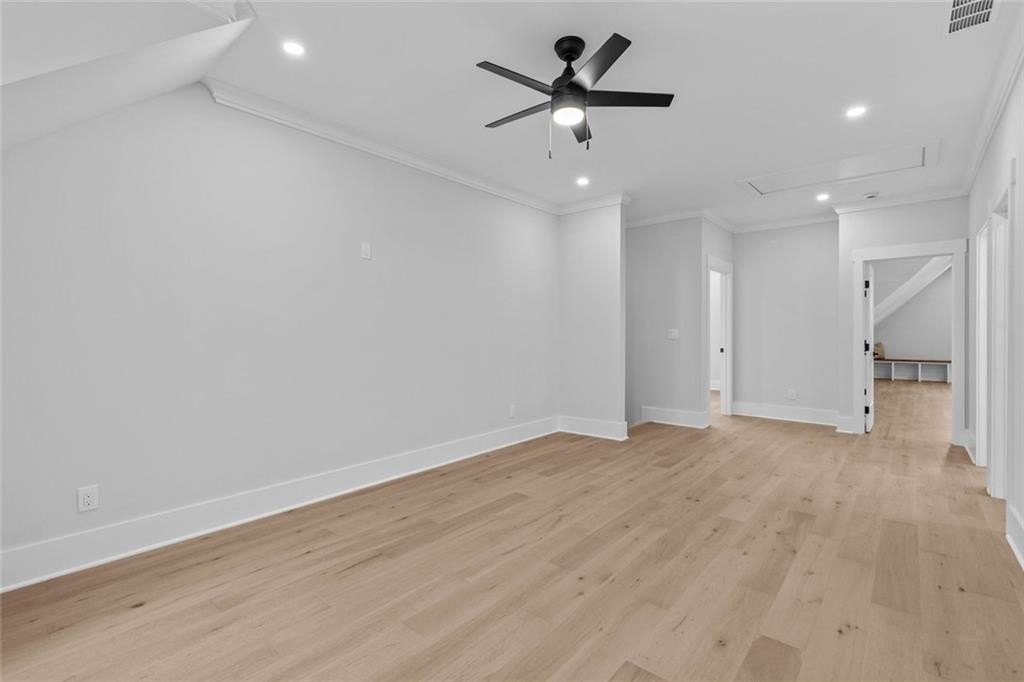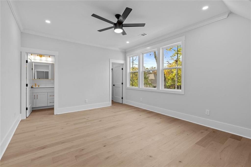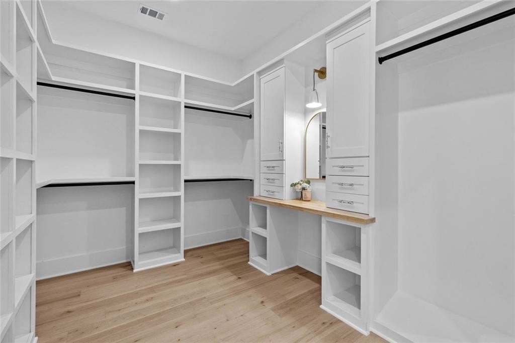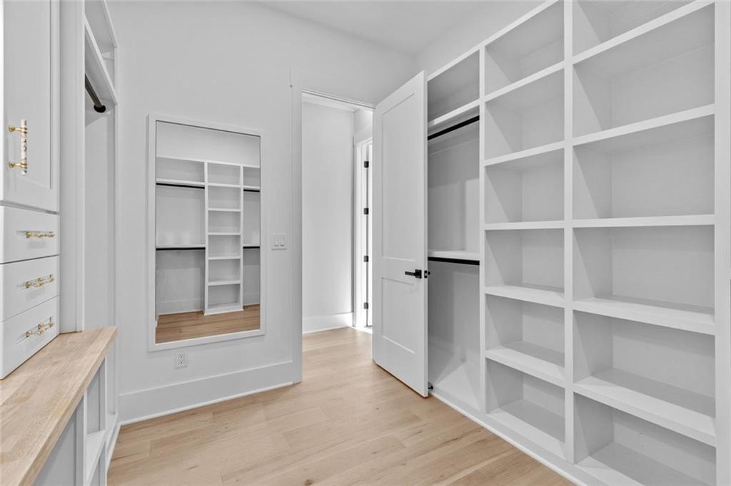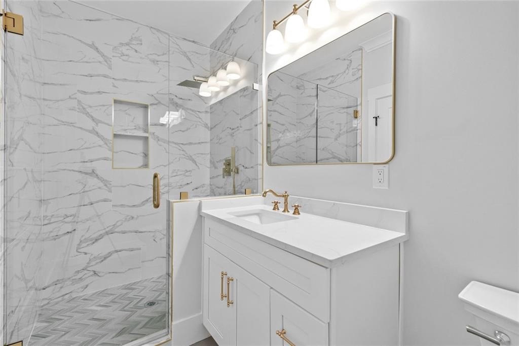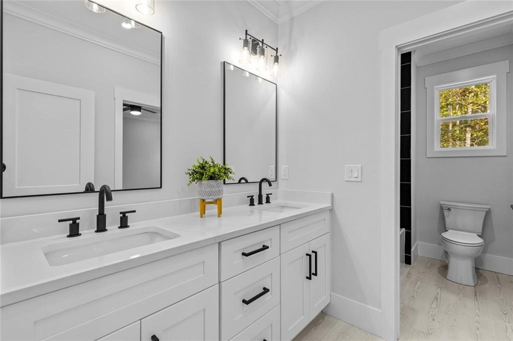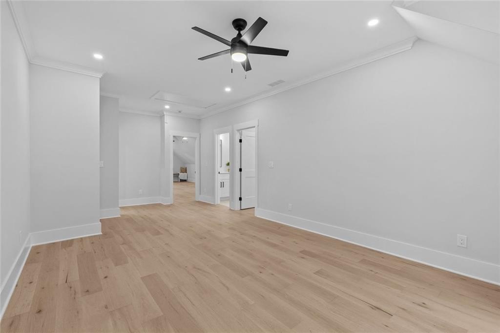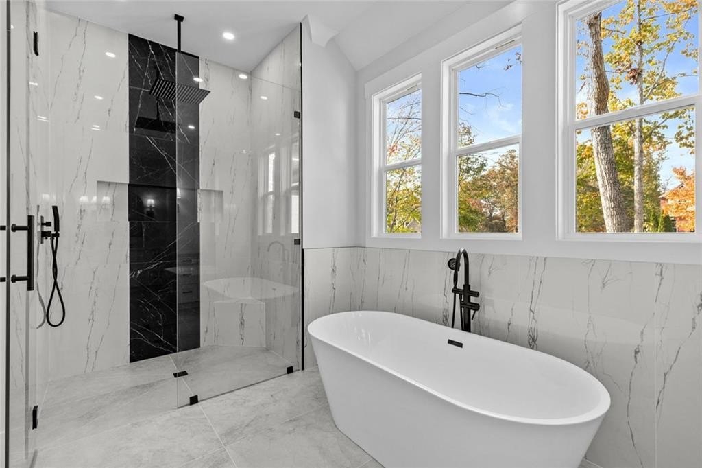 The primary suite offers a sophisticated retreat, highlighted by a private fireplace, custom closet system, double vanities, an oversized curbless shower, and a separate soaking tub. Upstairs, a cozy living area and additional bedrooms provide flexible space for family or guests.