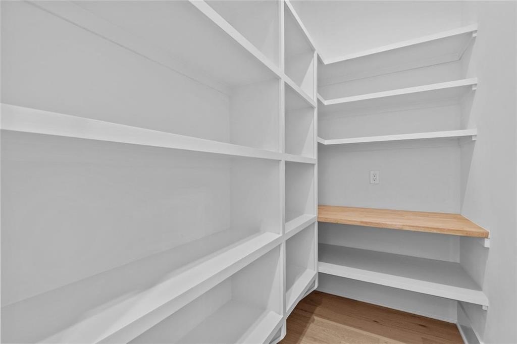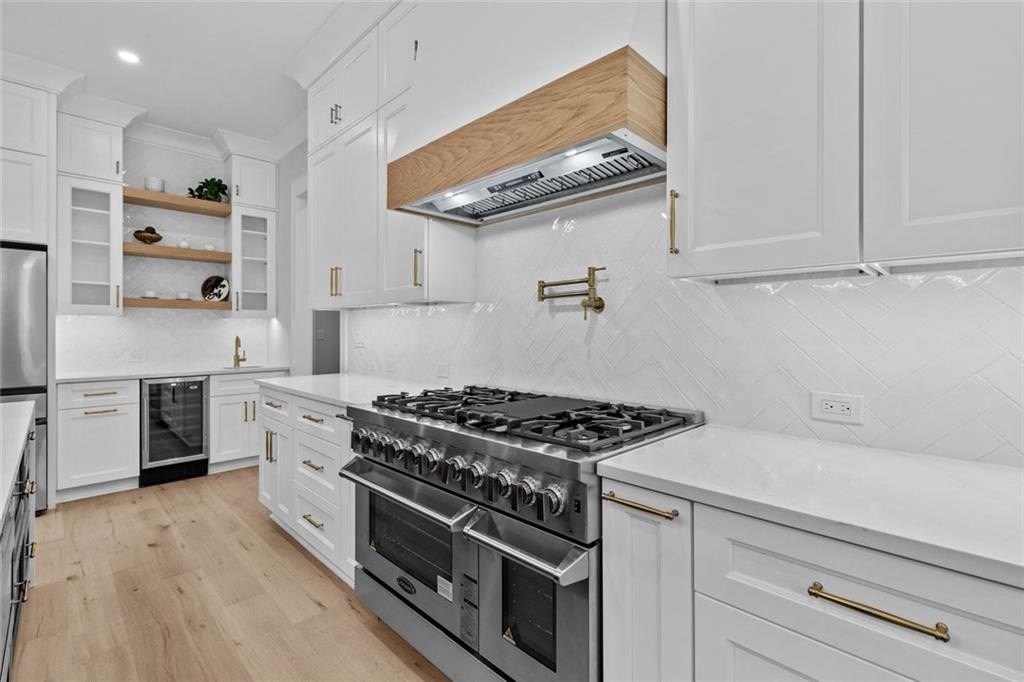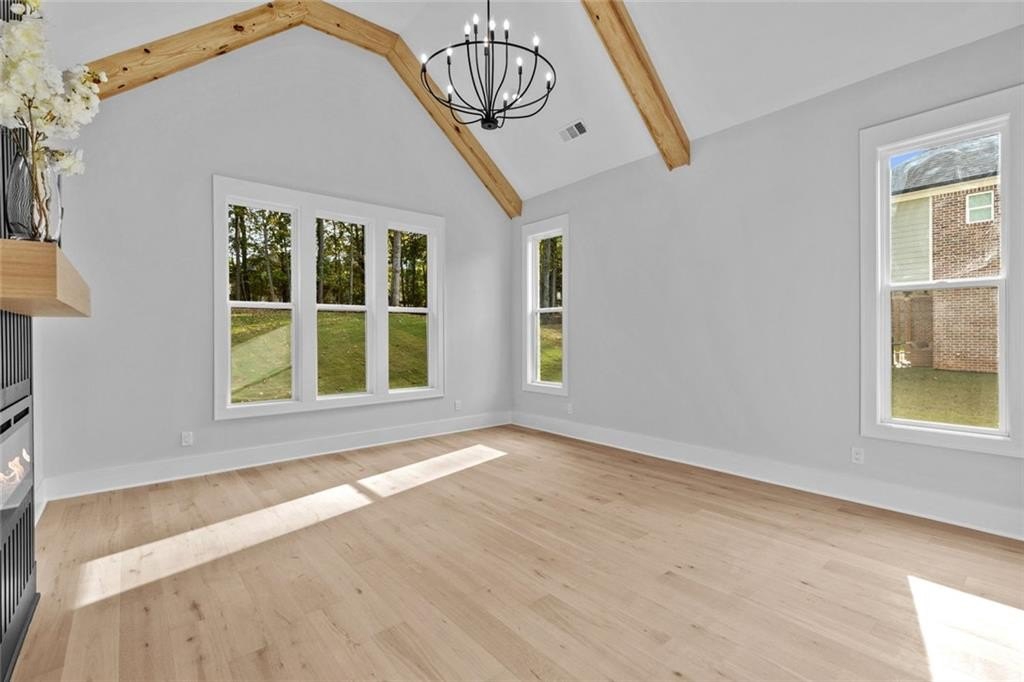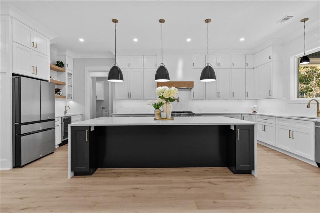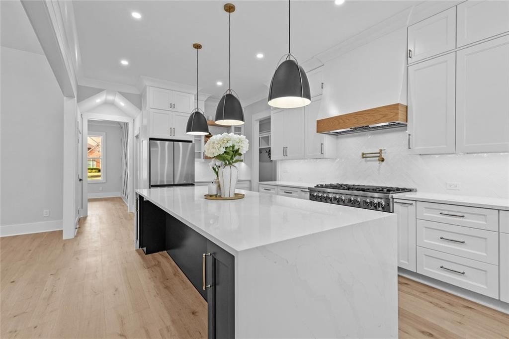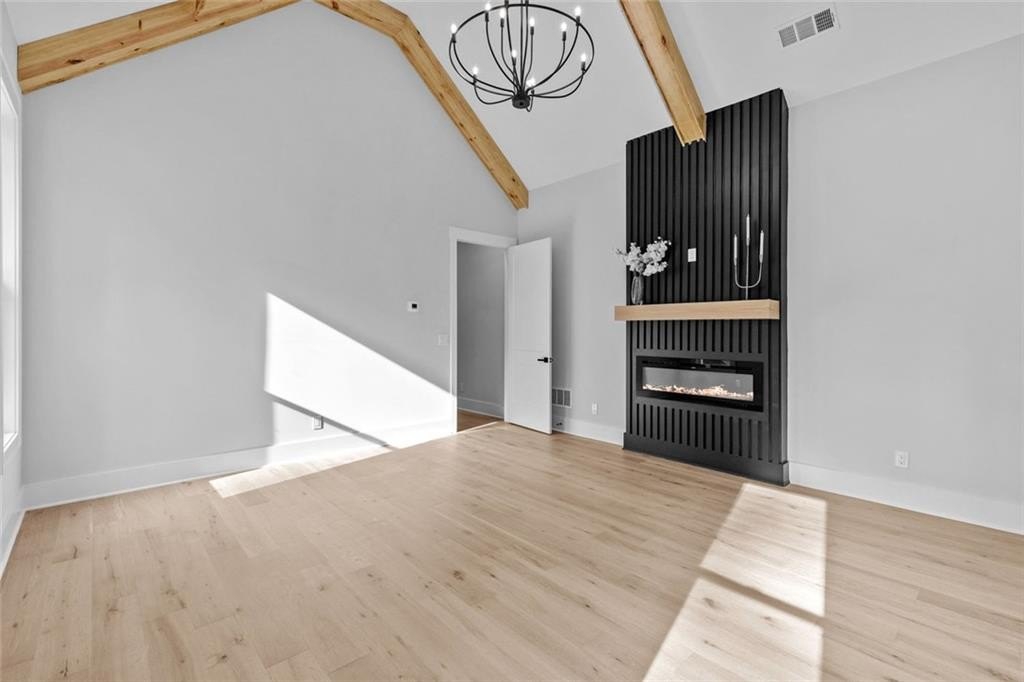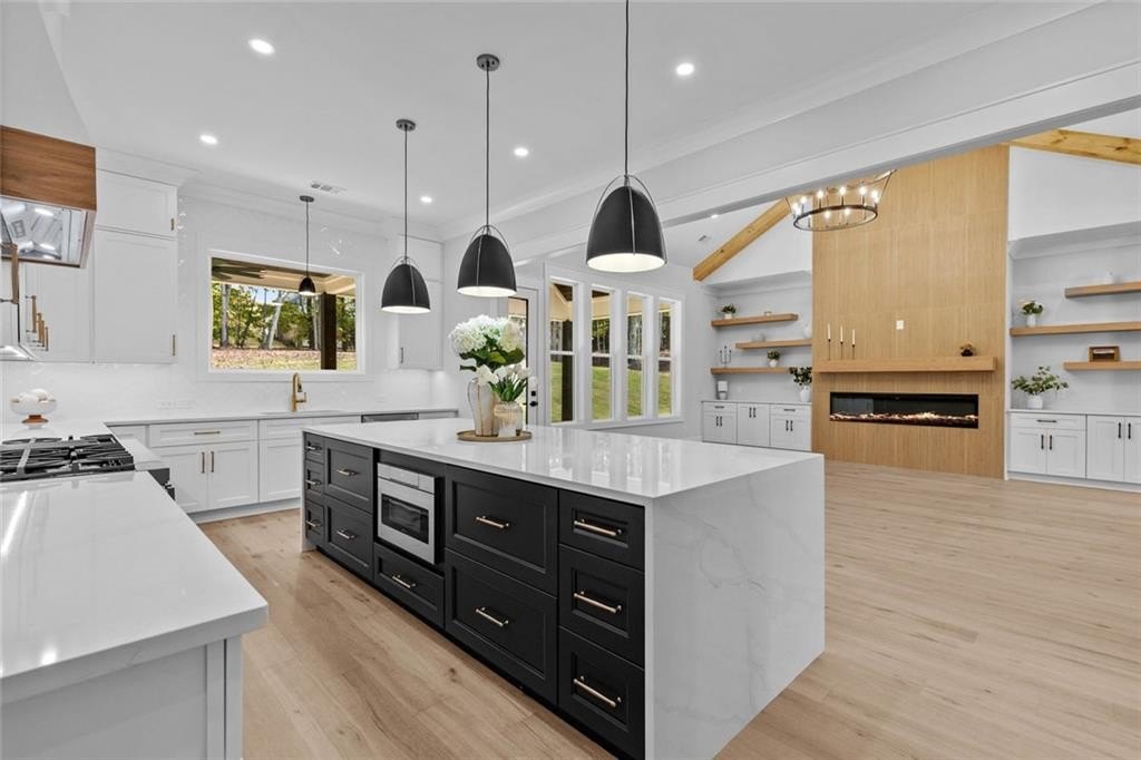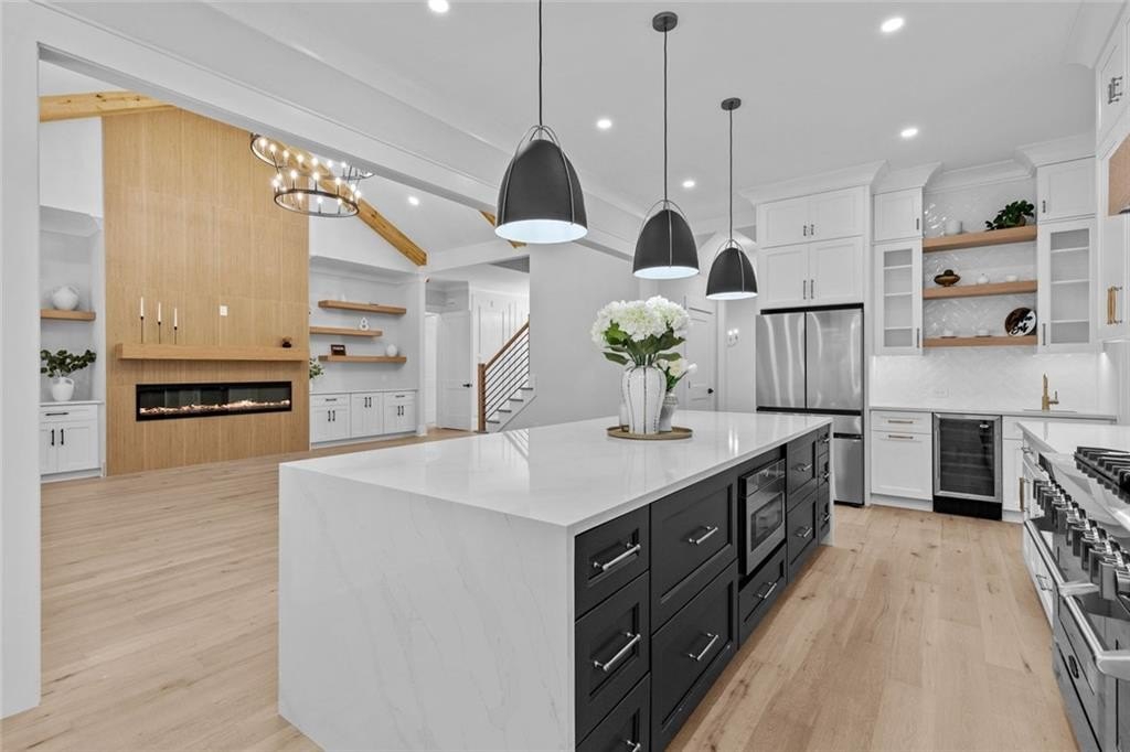 The open-concept living area showcases striking wood beams, soaring ceilings, and a custom-built fireplace, creating a warm yet refined atmosphere. The chef’s kitchen is the heart of the home—perfect for both everyday living and entertaining—complete with a large island, dedicated coffee bar with sink, quartz countertops, elegant backsplashes, dual walk-in pantries, a custom hood, and high-end appliances.