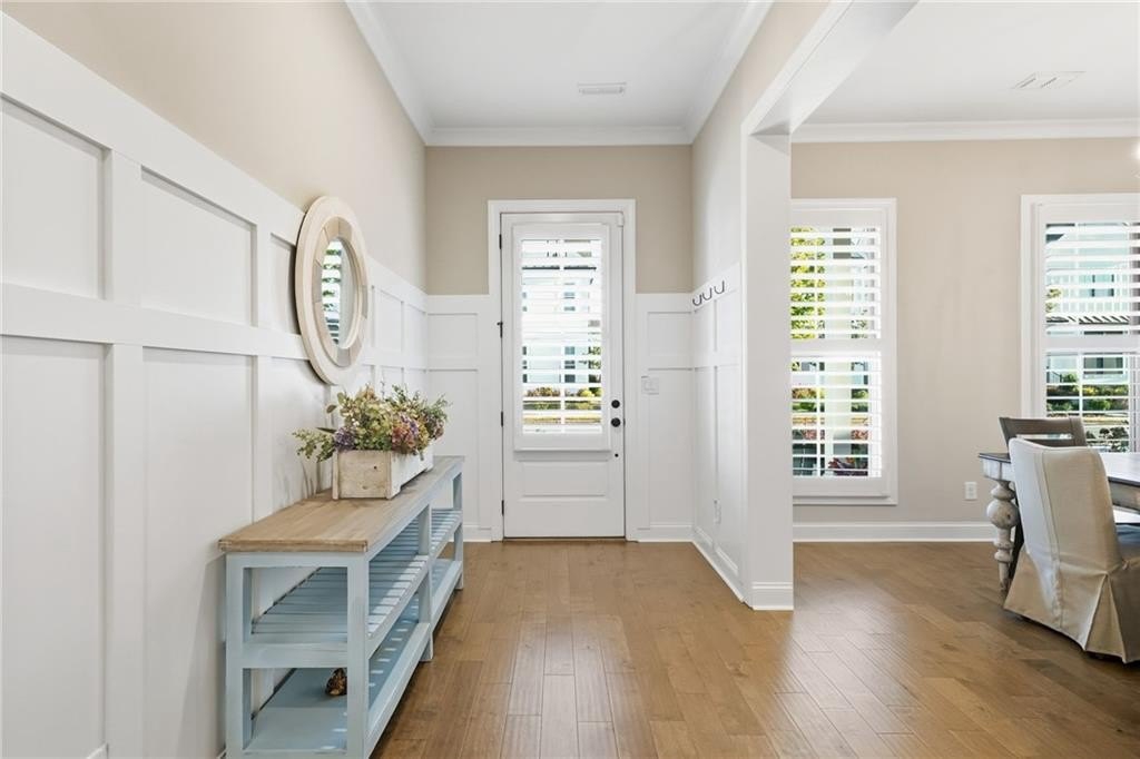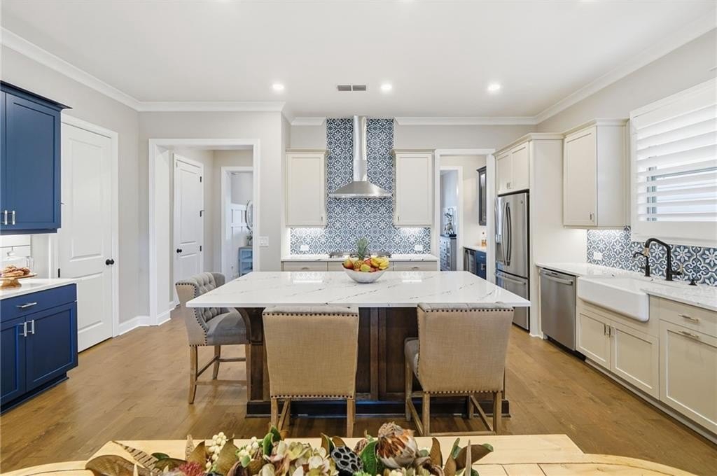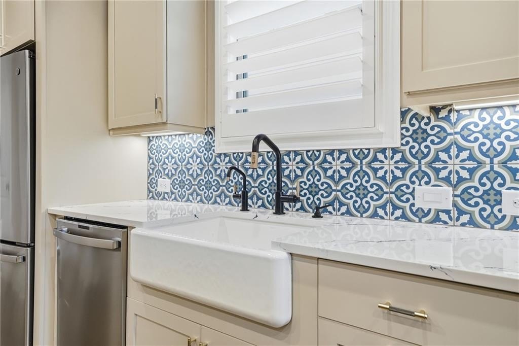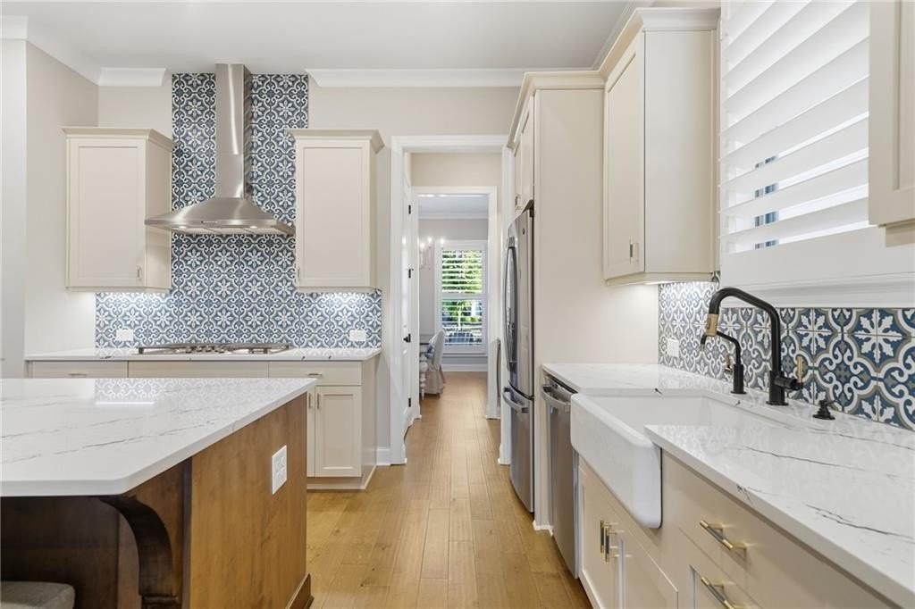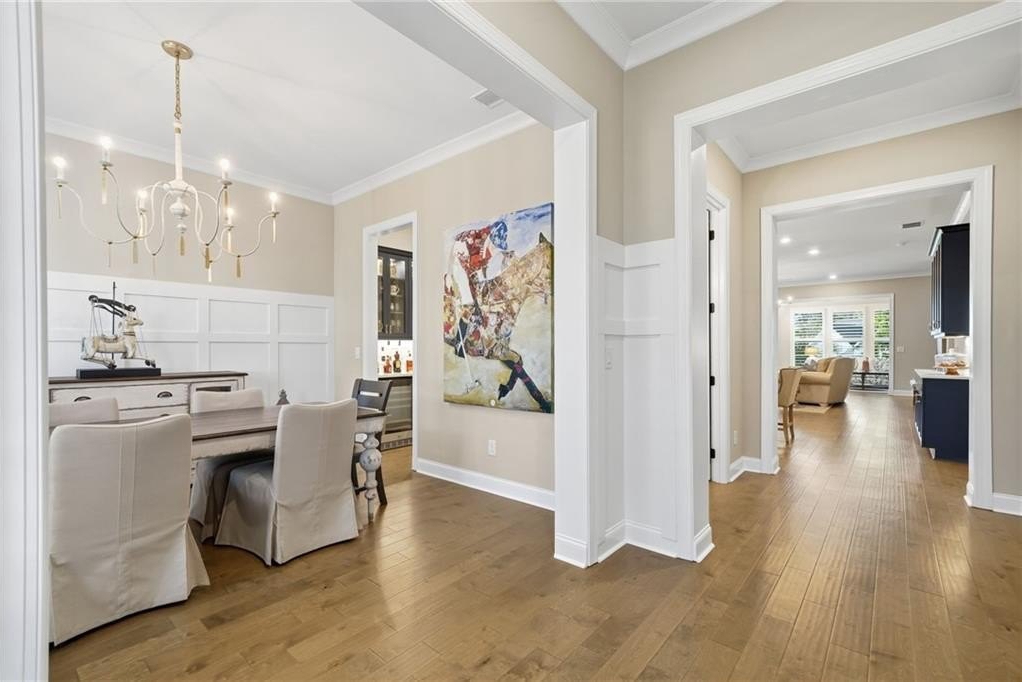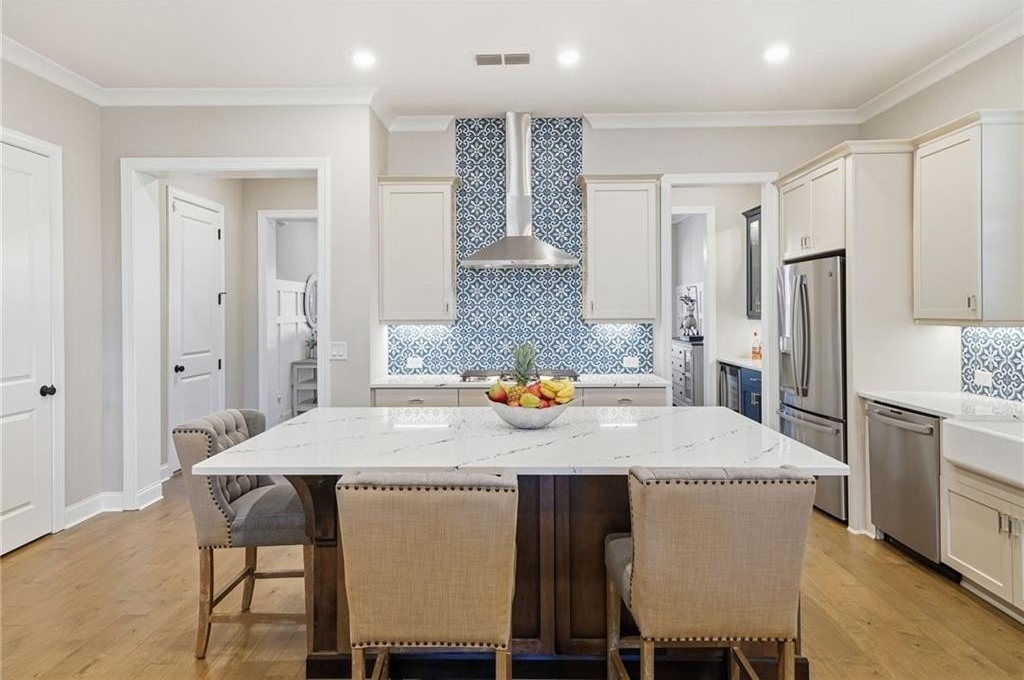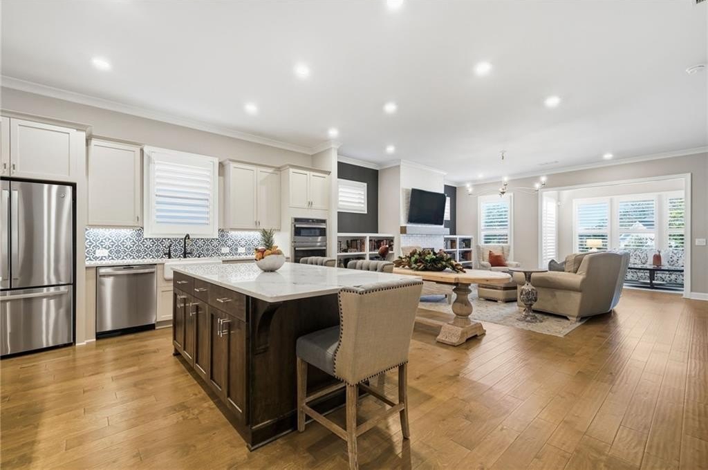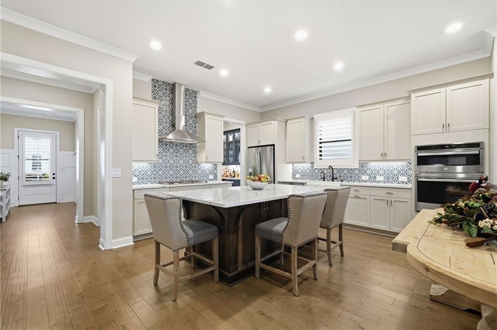 Step inside to find wood floors throughout, plantation shutters, and designer light fixtures that elevate every room. The chef’s kitchen is a showstopper with an Insta-Hot water dispenser, butler’s pantry with wine cooler, counter-depth refrigerator, and whisper-quiet dishwasher—a true dream for entertaining.