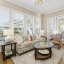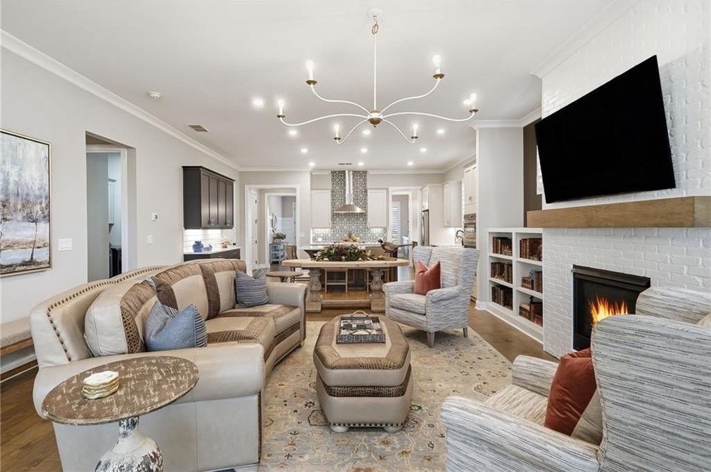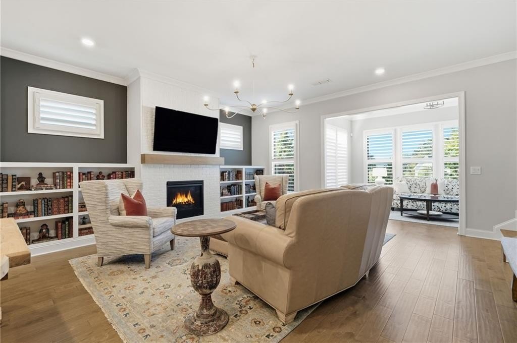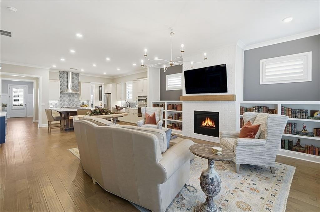 The open-concept living area features a fireplace with gas logs, built-in bookshelves, and a sunroom that fills the space with natural light. The formal dining room boasts elegant wainscoting, while the covered rear porch includes a natural gas BBQ tap for effortless outdoor gatherings.