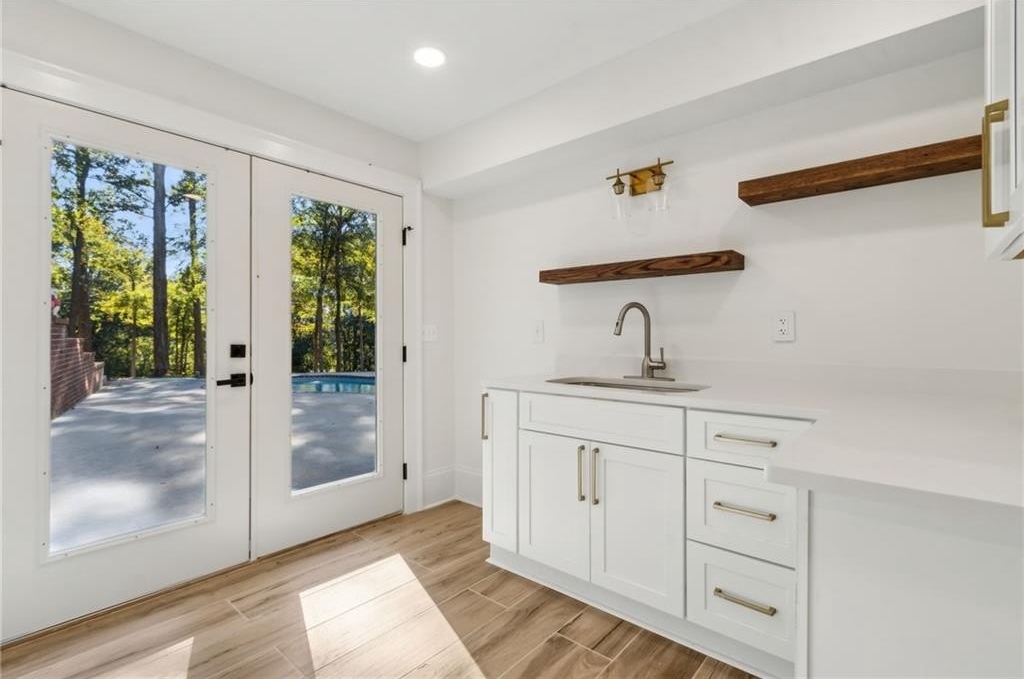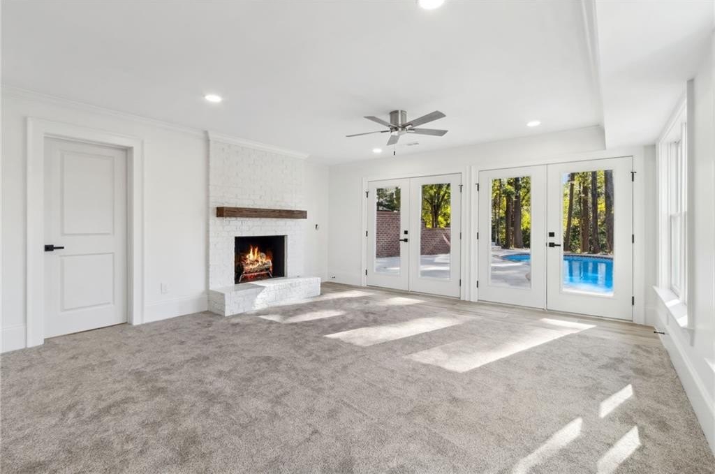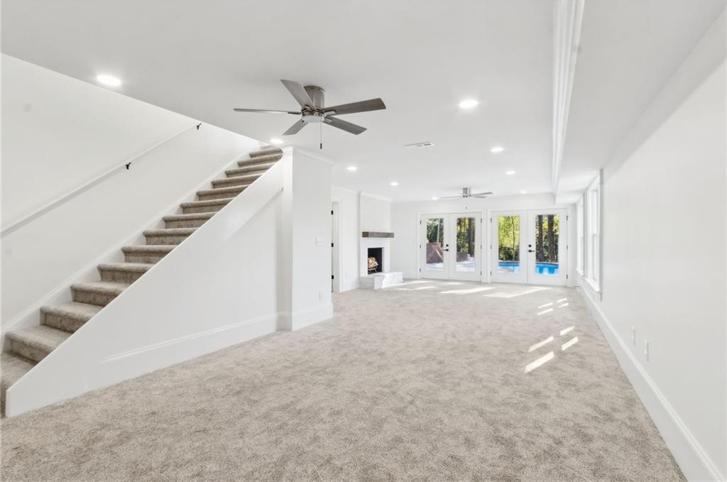 The fully finished walk-out basement adds even more living space, complete with a large recreation room with fireplace, French doors to the pool, an additional bedroom and full bath, two flex rooms (ideal for a gym, studio, or media room), and a kitchenette with additional French doors leading outside. A three-car garage includes a built-in workshop area, providing room for hobbies, tools, or extra storage.