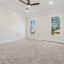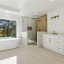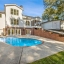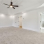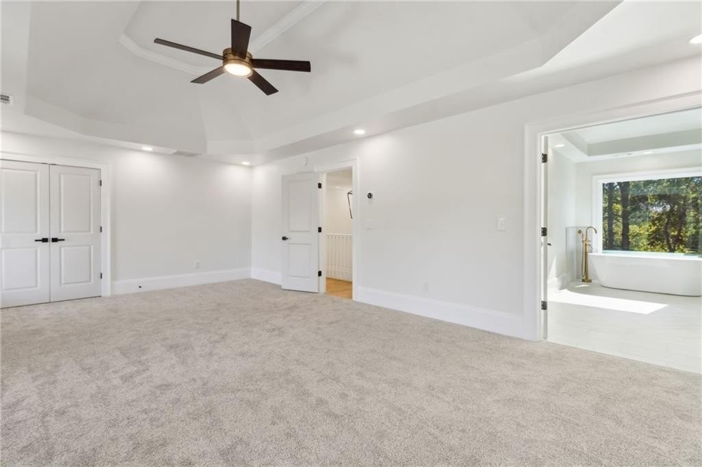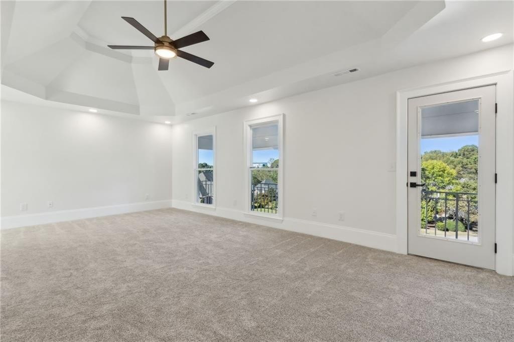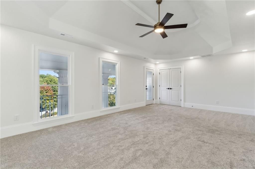 Upstairs, the owner’s suite offers a peaceful retreat with a tray ceiling and private balcony access. The spa-like en-suite bath features Quartz countertops with double vanities, a separate tile shower, and a soaking tub with views of the pool and backyard. Each upstairs bedroom includes its own private en-suite bath with Quartz countertops and beautifully tiled finishes, offering comfort and privacy for family or guests. A main-level bedroom with a large walk-in closet and 9-foot ceilings is ideal for guests or multigenerational living.