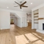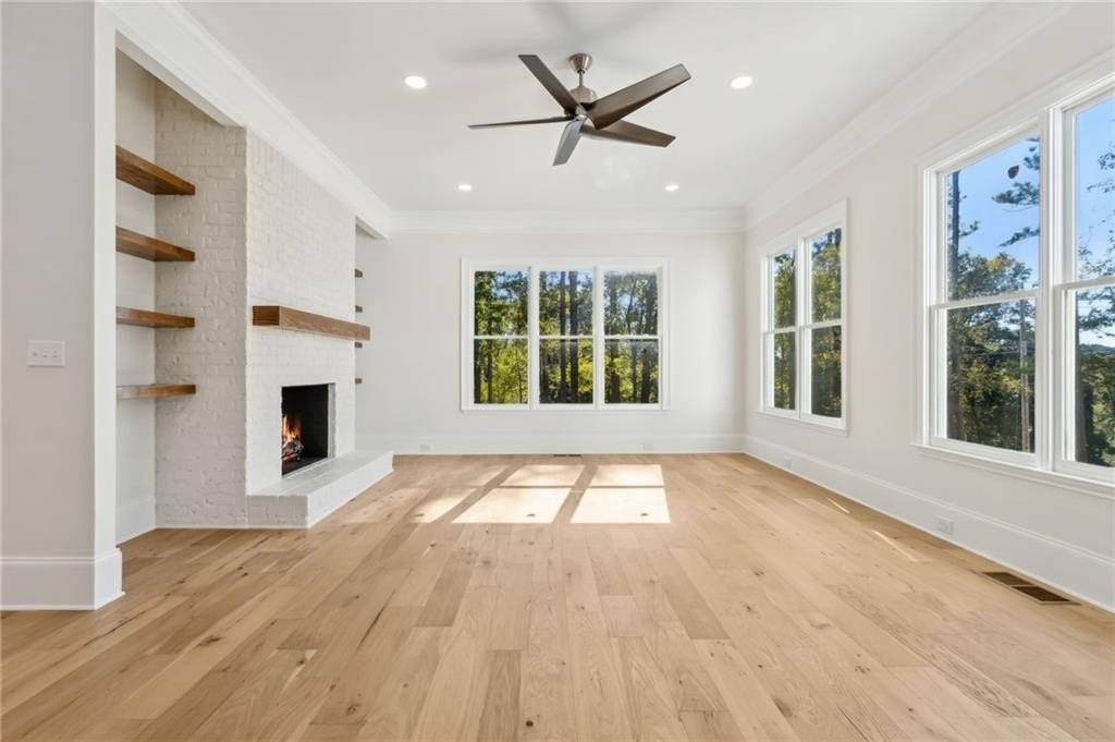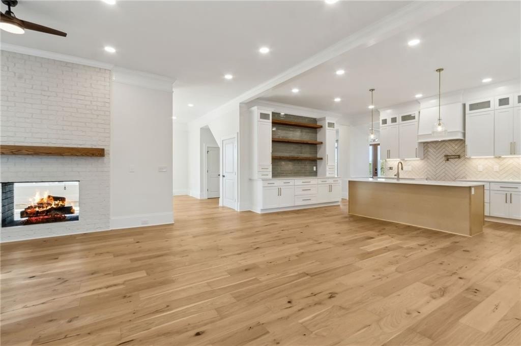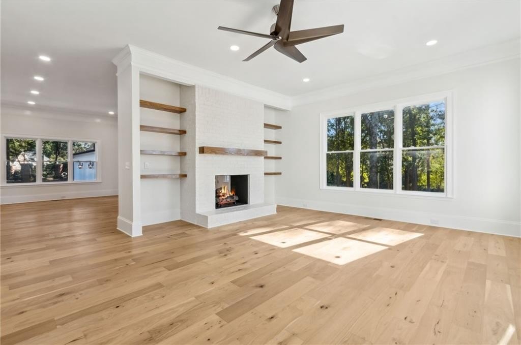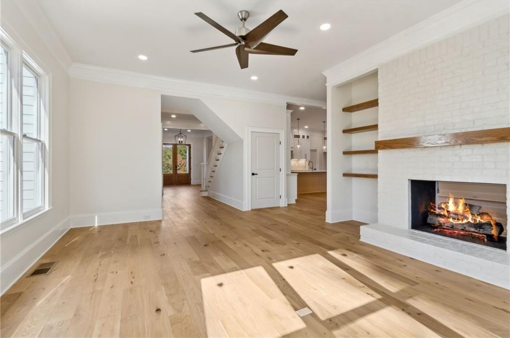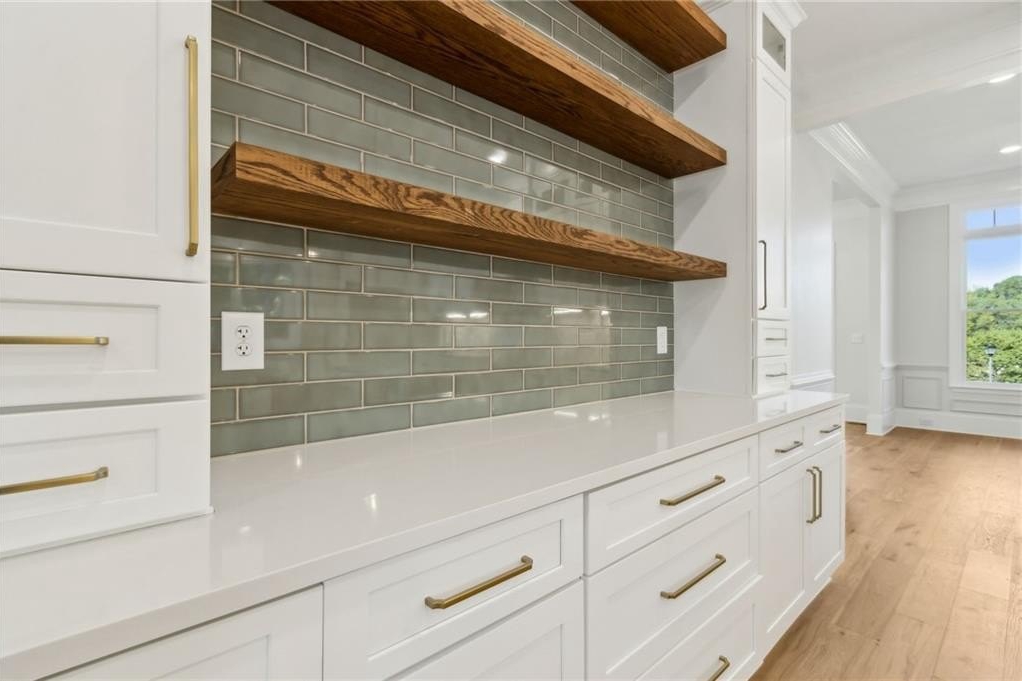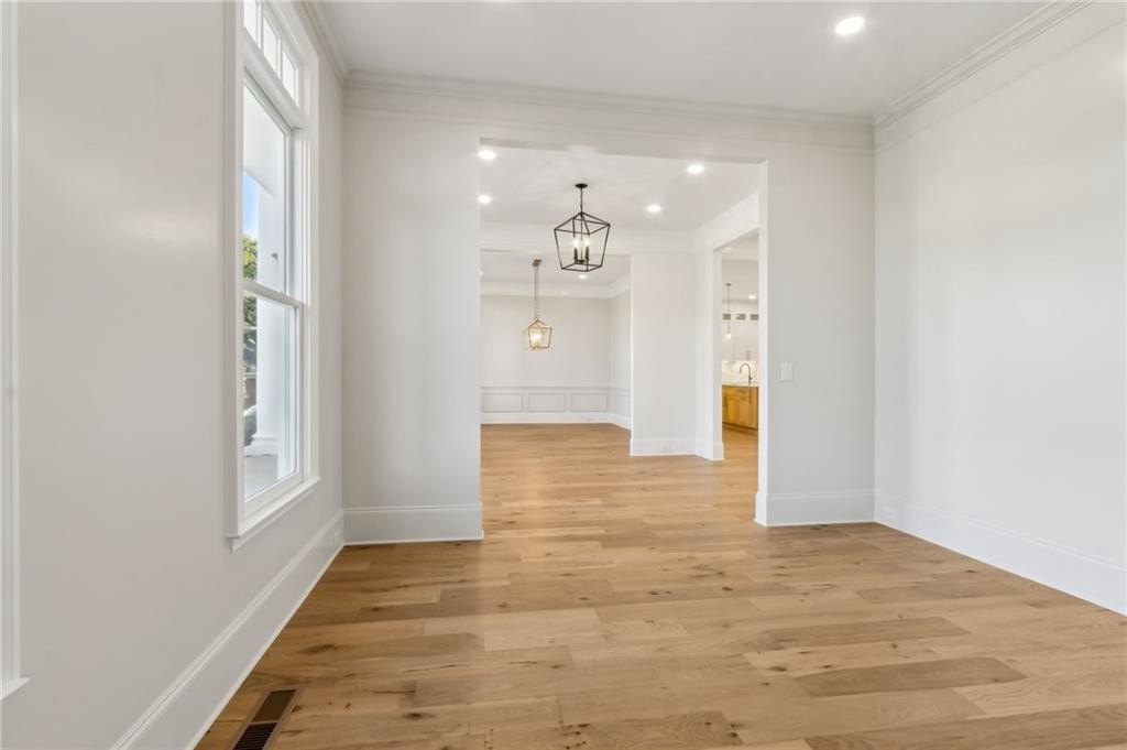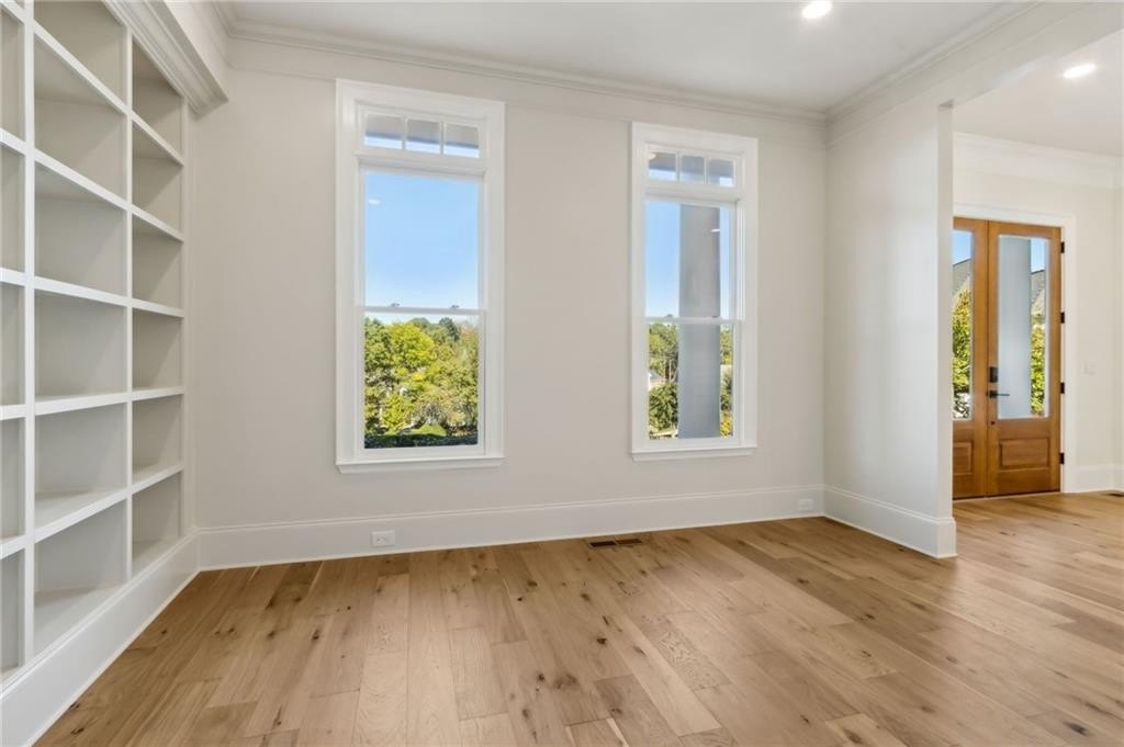 As you step through the French doors, you're welcomed by brand-new hardwood floors, soaring 9-foot ceilings, and elegant crown, cap, and picture molding, complemented by 8-inch baseboards throughout. The formal dining room features classic shadow box molding, while the formal living room or study offers a full wall of custom built-in bookcases—perfect for a library or executive home office.