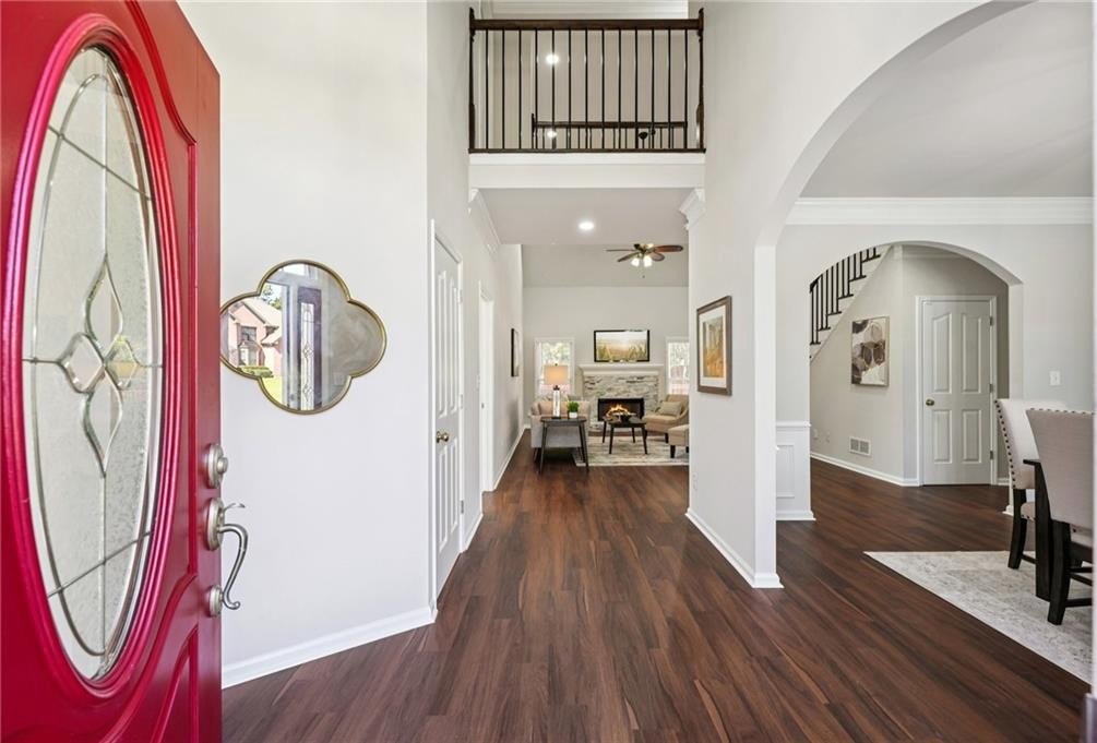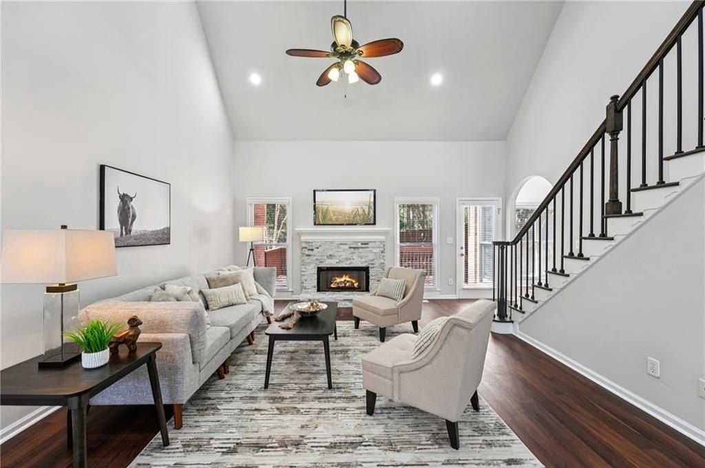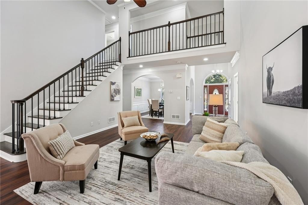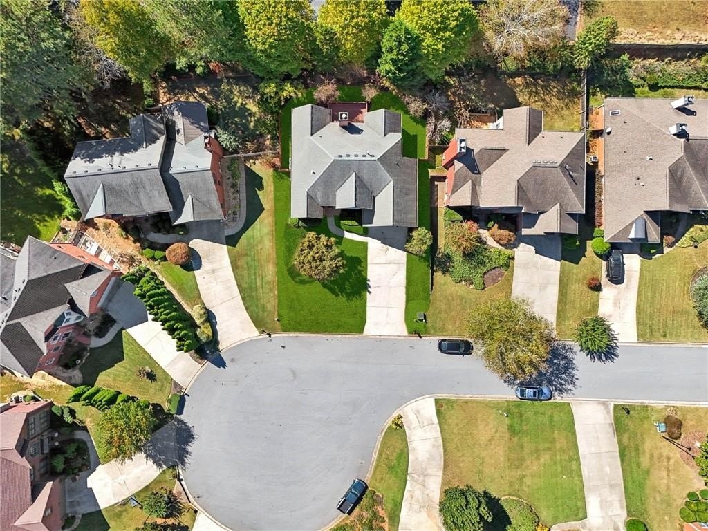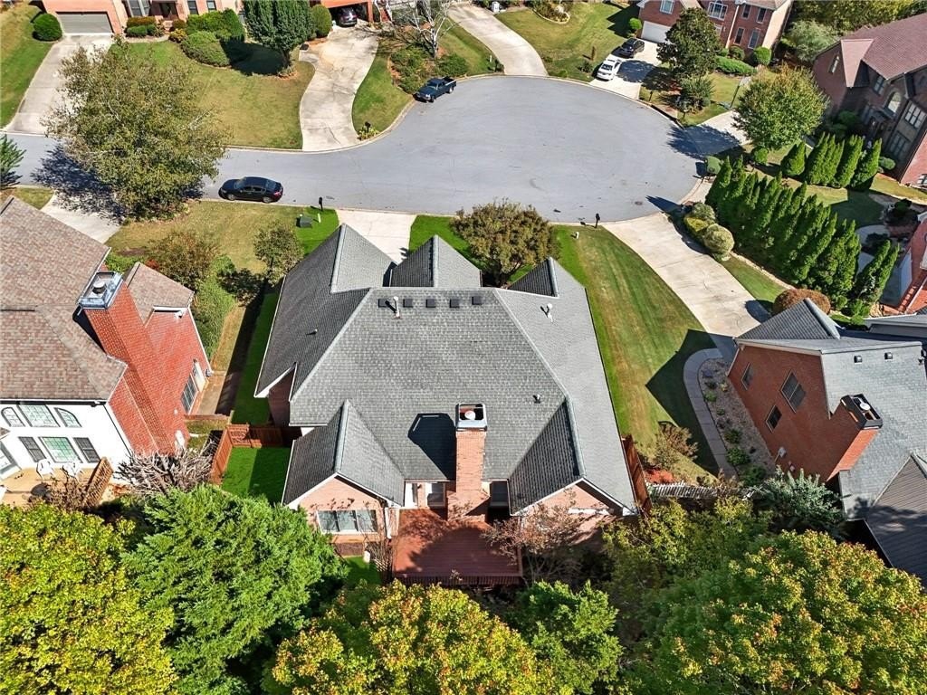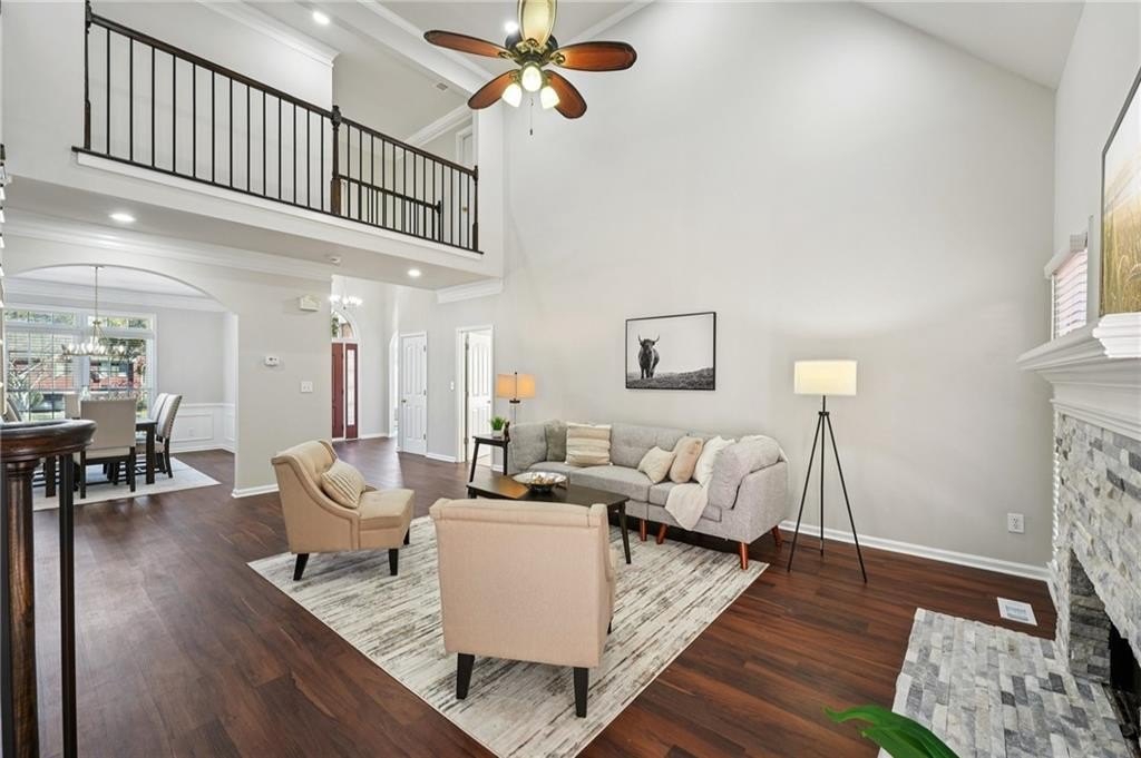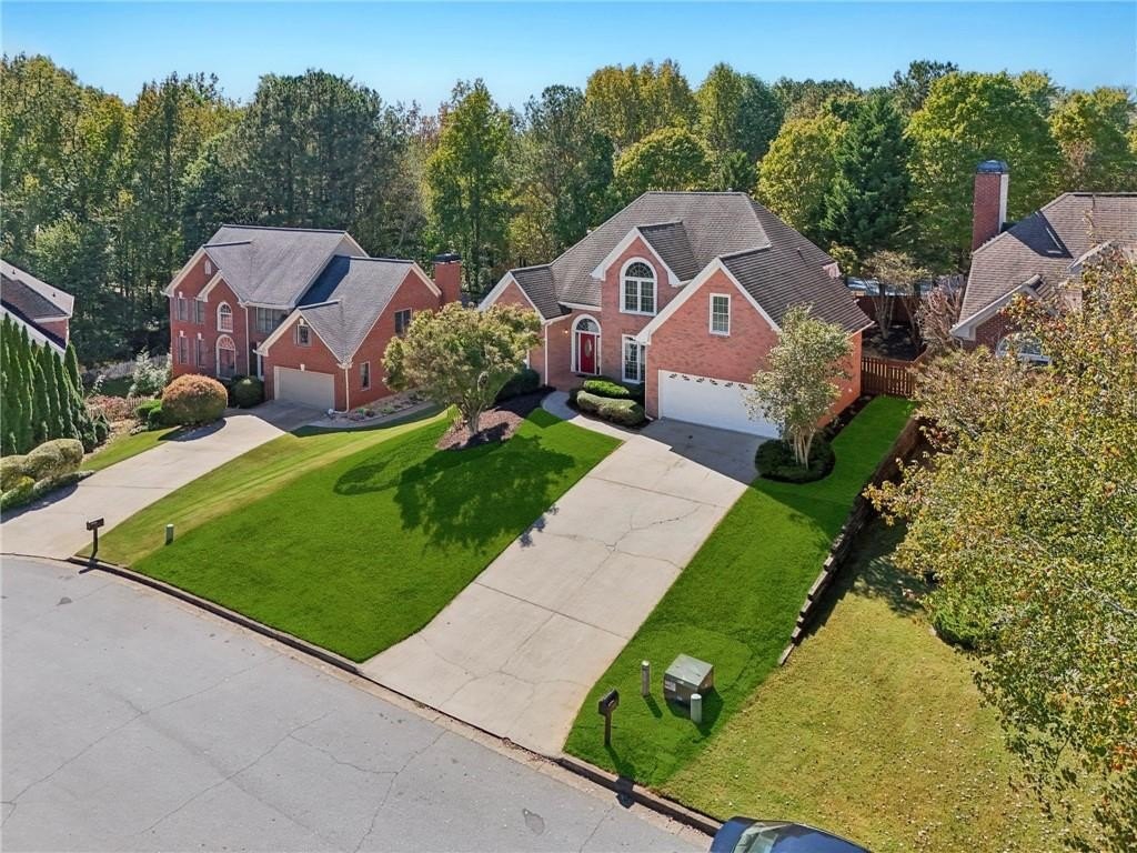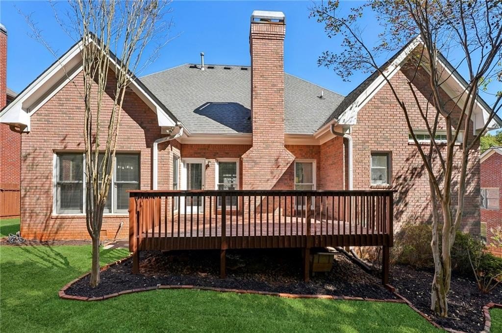 Welcome Home! Experience refined living in this stunning north-east facing, four sided brick, master on main, finished basement home perfectly situated on a quiet cul-de-sac lot, perfectly nestled in the highly sought-after Vicarage Walk community. This expansive residence combines elegant design, freshly painted, and thoughtfully crafted indoor and outdoor spaces all in an unbeatable location with top-tier Fulton county school district. As you enter the home, you are welcomed by a breathtaking two-story foyer. On your right is a formal dining room with custom trim and designer finishes; to your left, a spacious executive office. The heart of the home is the light-filled great room with soaring high ceilings, a newly upgraded dramatic stone fireplace. The chef's kitchen is a dream: updated with sleek white stone countertops, a newly replaced backsplash, a brand new range, stainless steel appliances, An informal dining area with high ceiling surrounded by windows perfect for sunlight throughout the day, this space ideal for both morning and evening entertaining. Also on the main level is a beautifully appointed master suite with an oversized bathroom with double vanity and closet. Newly upgraded overlooking stairs will lead you on the second level, you'll find three more spacious bedrooms, and the two ways open pathways to go to the unfinished storeroom. As soon as you go downstairs, a fully finished basement is waiting for you to create your own billiards/game area, home gym and theater. The basement has a bedroom and full bathroom. Freshly painted and new epoxy installed two car garage. Out back, enjoy your private outdoor oasis with oversize deck, matured trees and professionally landscaped yard ideal for year-round gatherings.