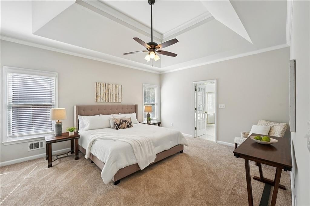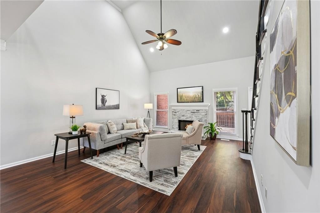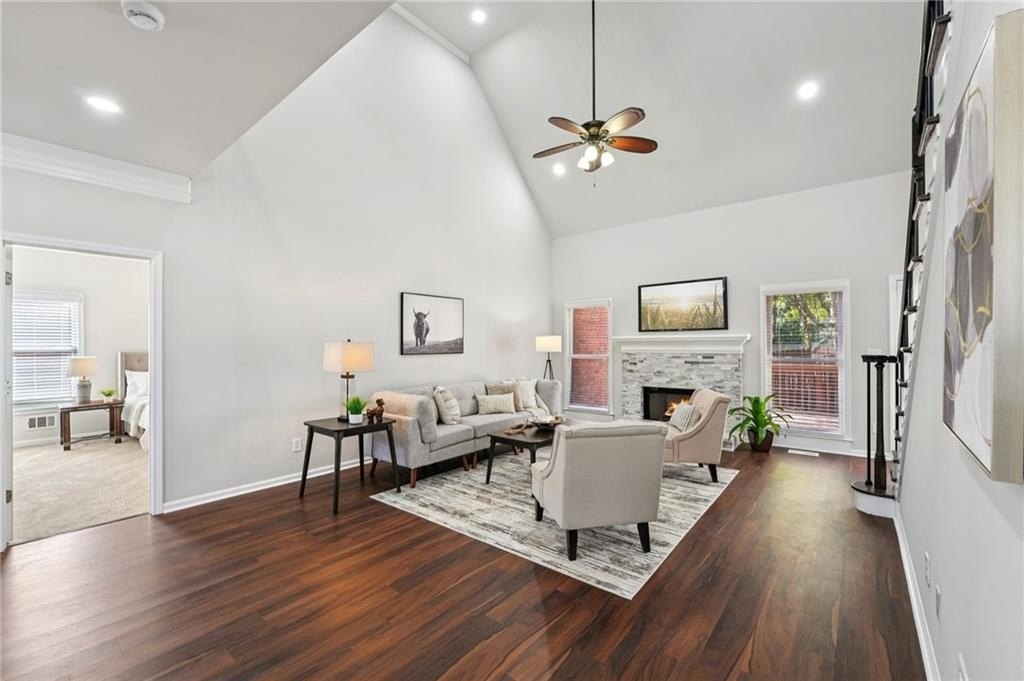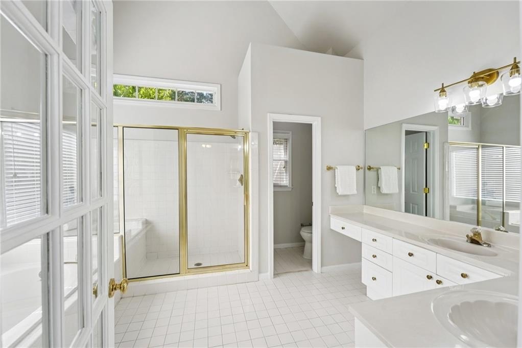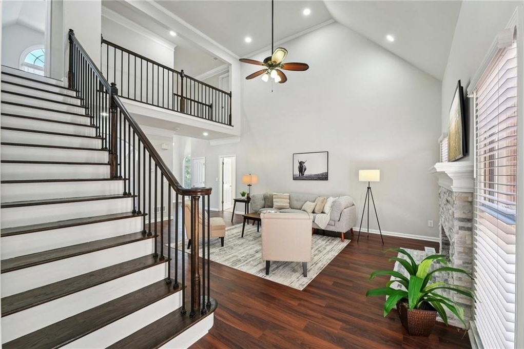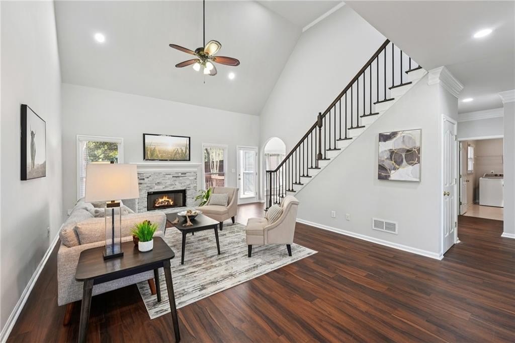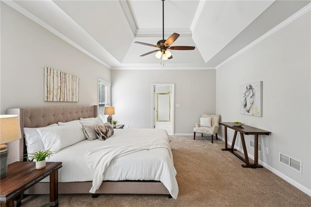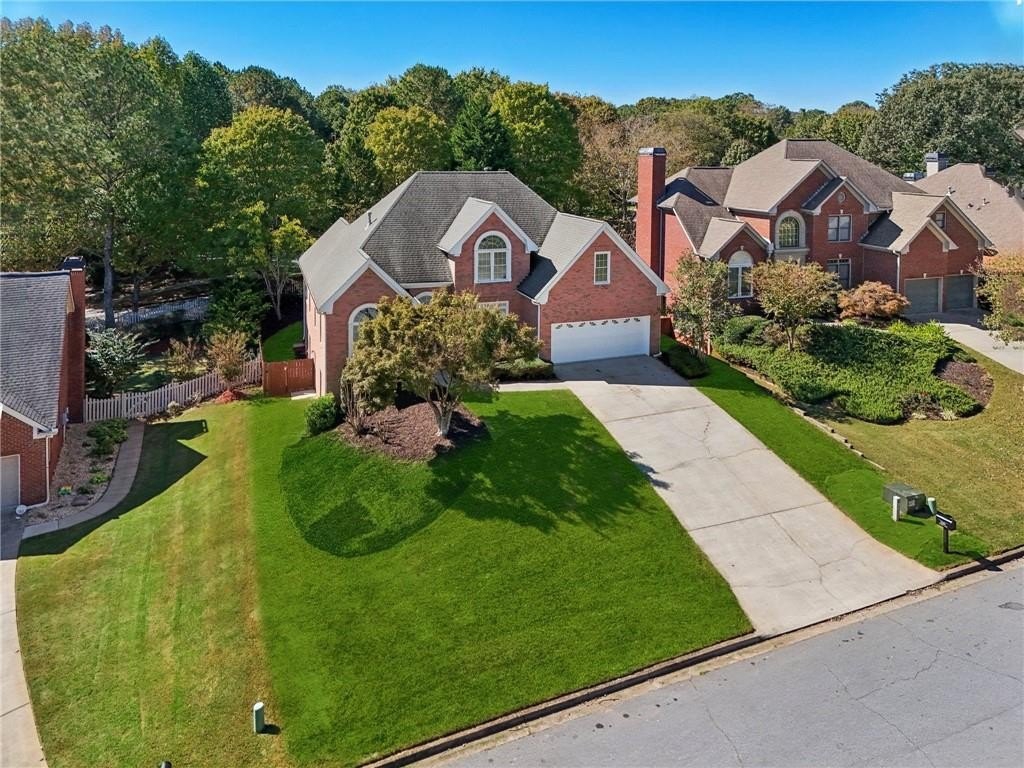 Welcome Home! Experience refined living in this stunning north-east facing, four sided brick, master on main, finished basement home perfectly situated on a quiet cul-de-sac lot, perfectly nestled in the highly sought-after Vicarage Walk community. This expansive residence combines elegant design, freshly painted, and thoughtfully crafted indoor and outdoor spaces all in an unbeatable location with top-tier Fulton county school district. As you enter the home, you are welcomed by a breathtaking two-story foyer. On your right is a formal dining room with custom trim and designer finishes; to your left, a spacious executive office. The heart of the home is the light-filled great room with soaring high ceilings, a newly upgraded dramatic stone fireplace. The chef's kitchen is a dream: updated with sleek white stone countertops, a newly replaced backsplash, a brand new range, stainless steel appliances, An informal dining area with high ceiling surrounded by windows perfect for sunlight throughout the day, this space ideal for both morning and evening entertaining. Also on the main level is a beautifully appointed master suite with an oversized bathroom with double vanity and closet. Newly upgraded overlooking stairs will lead you on the second level, you'll find three more spacious bedrooms, and the two ways open pathways to go to the unfinished storeroom. As soon as you go downstairs, a fully finished basement is waiting for you to create your own billiards/game area, home gym and theater. The basement has a bedroom and full bathroom. Freshly painted and new epoxy installed two car garage. Out back, enjoy your private outdoor oasis with oversize deck, matured trees and professionally landscaped yard ideal for year-round gatherings.
