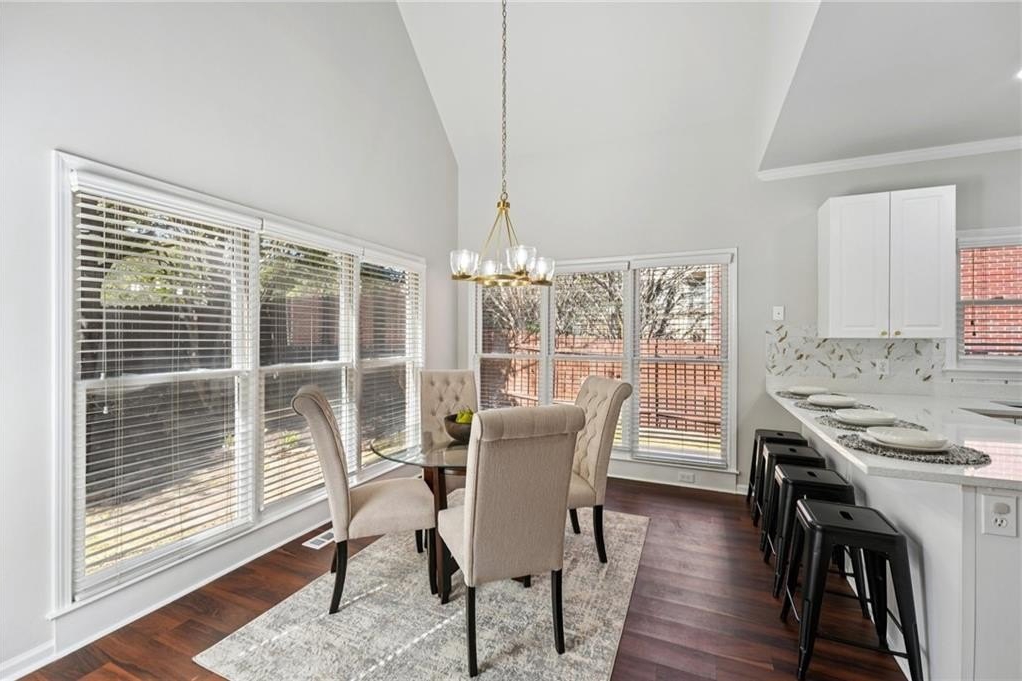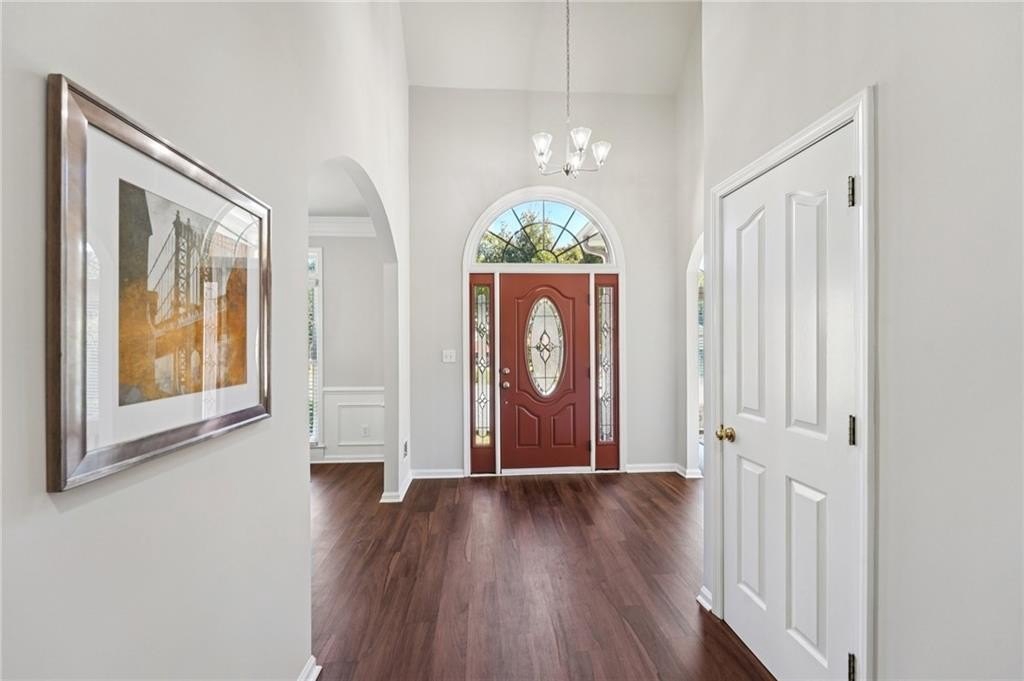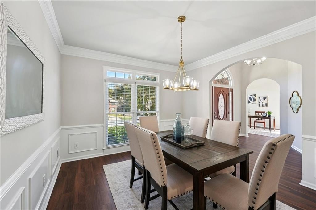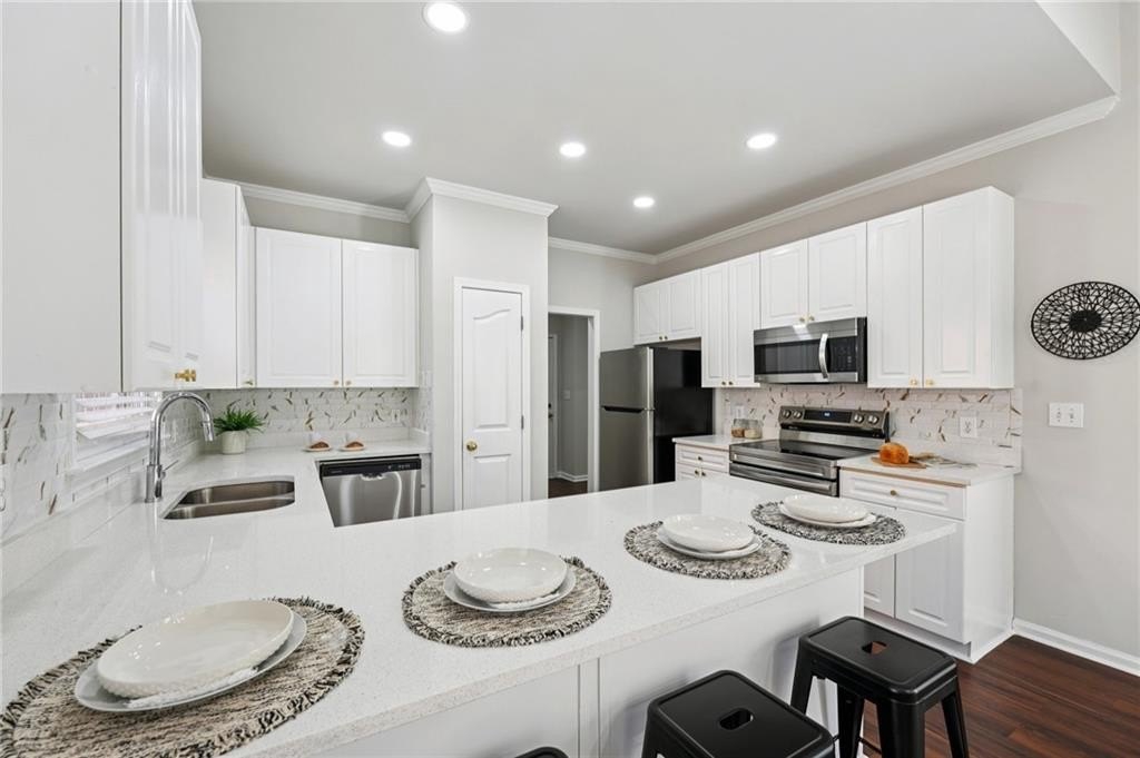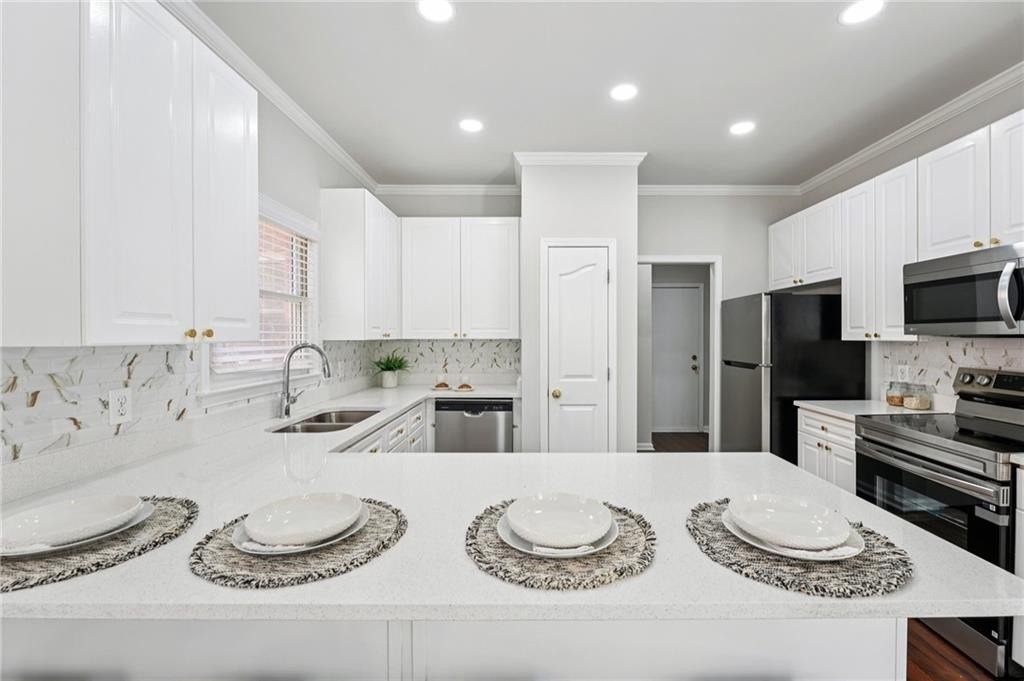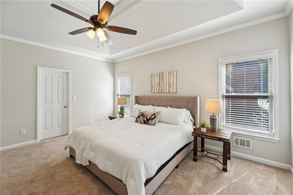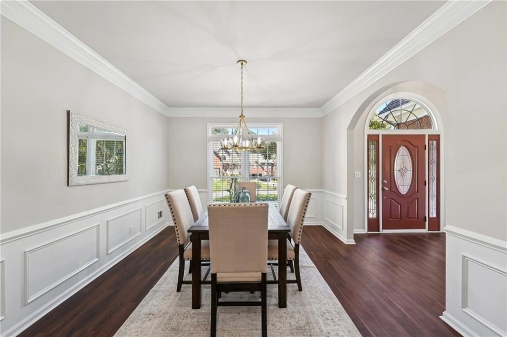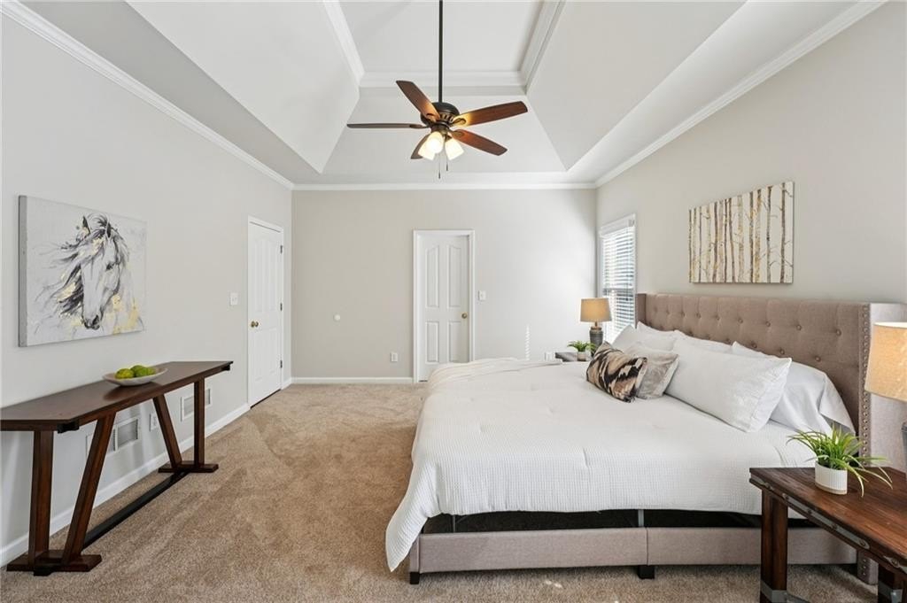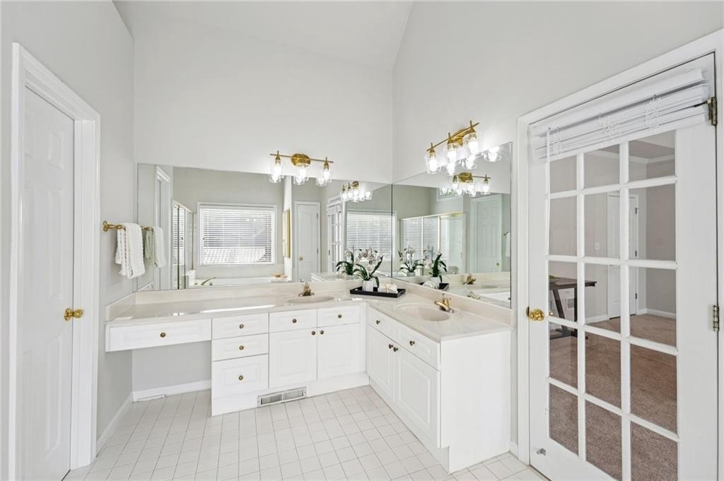 Welcome Home! Experience refined living in this stunning north-east facing, four sided brick, master on main, finished basement home perfectly situated on a quiet cul-de-sac lot, perfectly nestled in the highly sought-after Vicarage Walk community. This expansive residence combines elegant design, freshly painted, and thoughtfully crafted indoor and outdoor spaces all in an unbeatable location with top-tier Fulton county school district. As you enter the home, you are welcomed by a breathtaking two-story foyer. On your right is a formal dining room with custom trim and designer finishes; to your left, a spacious executive office. The heart of the home is the light-filled great room with soaring high ceilings, a newly upgraded dramatic stone fireplace. The chef's kitchen is a dream: updated with sleek white stone countertops, a newly replaced backsplash, a brand new range, stainless steel appliances, An informal dining area with high ceiling surrounded by windows perfect for sunlight throughout the day, this space ideal for both morning and evening entertaining. Also on the main level is a beautifully appointed master suite with an oversized bathroom with double vanity and closet. Newly upgraded overlooking stairs will lead you on the second level, you'll find three more spacious bedrooms, and the two ways open pathways to go to the unfinished storeroom. As soon as you go downstairs, a fully finished basement is waiting for you to create your own billiards/game area, home gym and theater. The basement has a bedroom and full bathroom. Freshly painted and new epoxy installed two car garage. Out back, enjoy your private outdoor oasis with oversize deck, matured trees and professionally landscaped yard ideal for year-round gatherings.