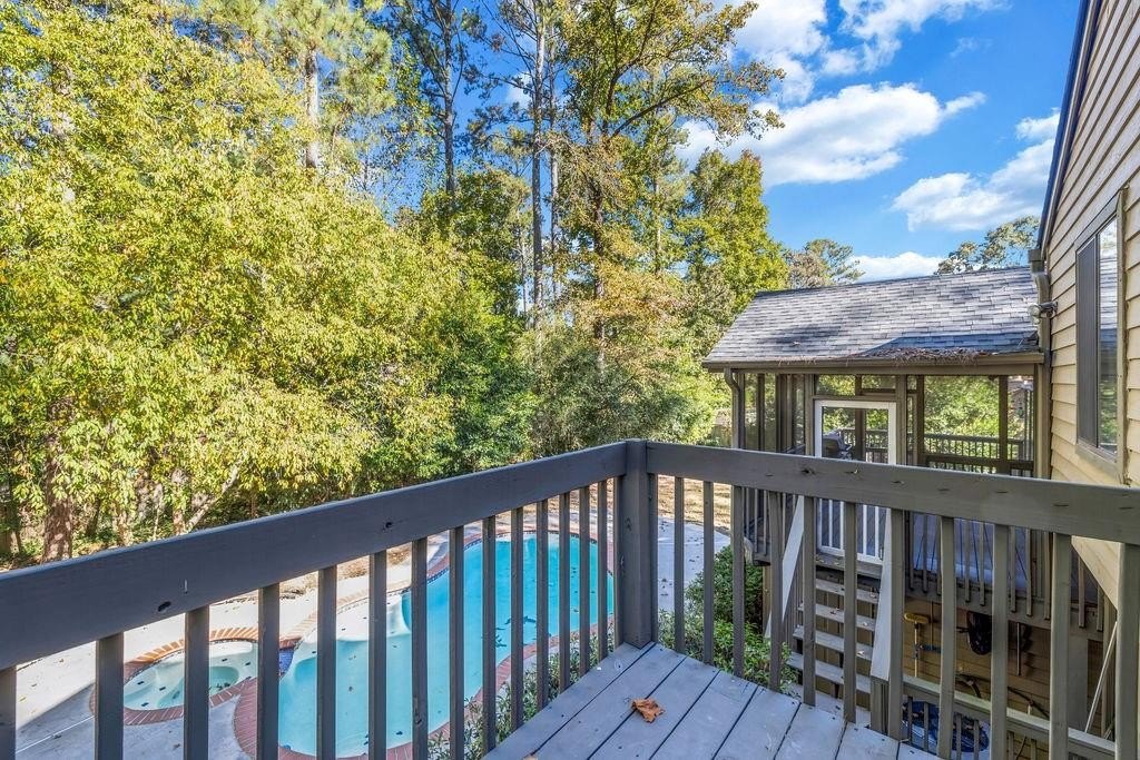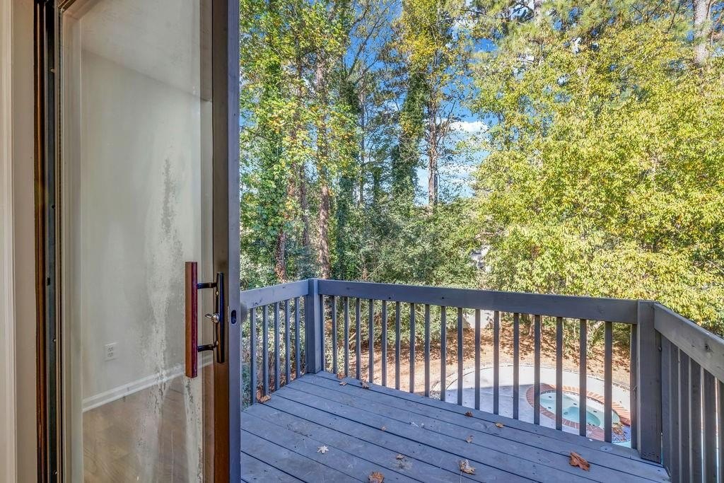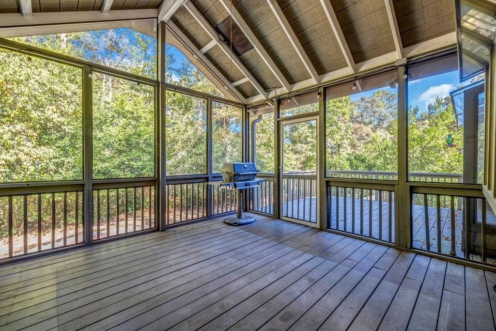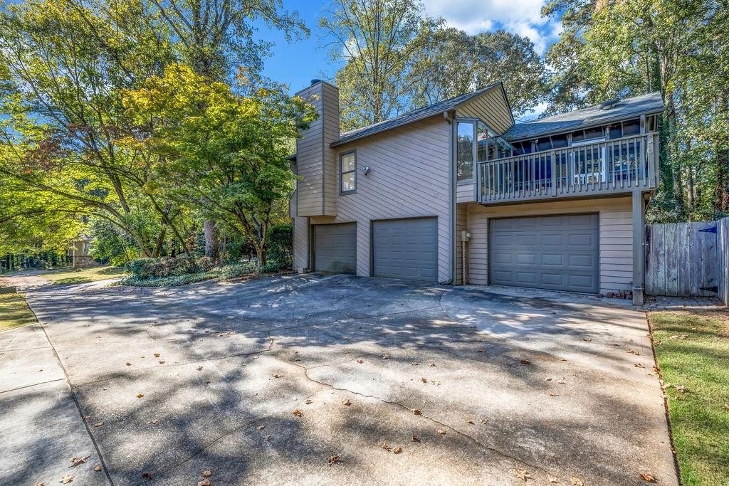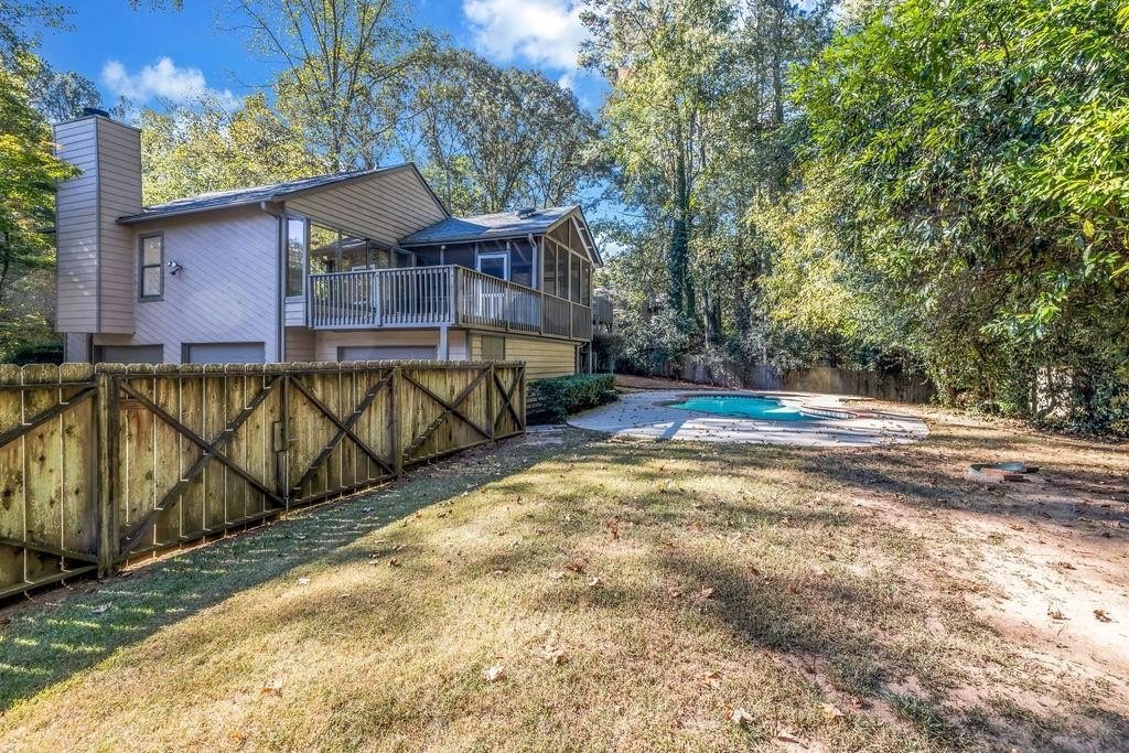 Featuring a sparkling pool and spacious three-car garage, this charming home is tucked away in the sought-after Landings East community, known for its welcoming atmosphere and convenient location near Stone Mountain Park. Step inside to a bright two-story foyer with gleaming hardwood floors that open to a cozy living room with vaulted ceilings and a warm gas fireplace, perfect for family movie nights or gatherings with friends. The adjoining dining room overlooks the living area, creating an inviting space for meals and celebrations. The kitchen features Corian countertops, bar seating, and a sunny breakfast nook where everyone can enjoy casual mornings together. From the kitchen, step into the screened-in porch that overlooks the sparkling backyard pool, a peaceful retreat for relaxing or watching the kids play. The fenced backyard provides ample space for children or pets to run and play safely. Upstairs, you’ll find three comfortable bedrooms and two full bathrooms, including a spacious primary suite with dual vanities, a garden tub, separate shower, and beautiful skylights that fill the room with natural light. Step out onto your private balcony to enjoy a quiet morning coffee while overlooking the pool. The finished basement offers the perfect space for entertaining or hosting guests, complete with a bar area, additional bedroom and full bath, and a large laundry room. The three-car drive-under garage provides abundant storage for vehicles, bikes, and more. Lovingly maintained and move-in ready, this home offers the ideal blend of comfort, style, and outdoor enjoyment, a wonderful place for your family to make lasting memories.