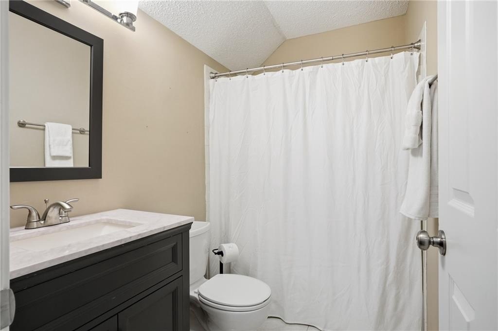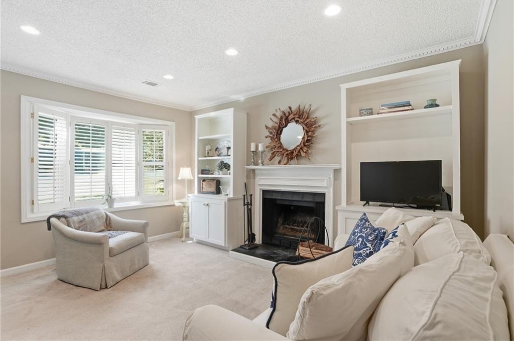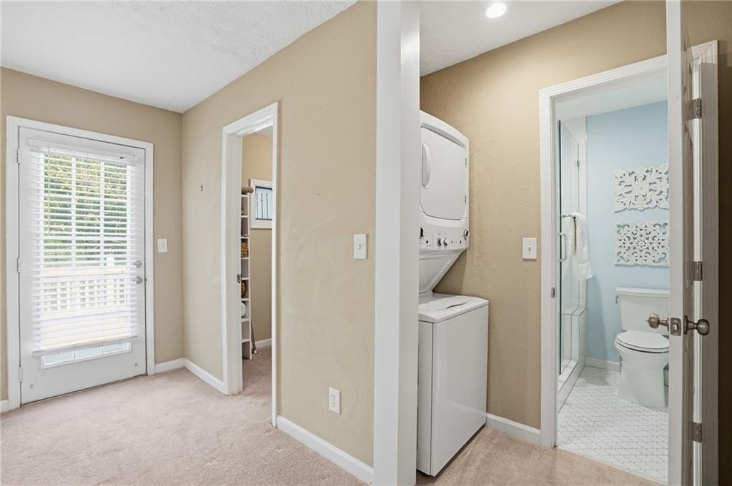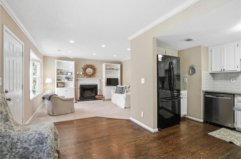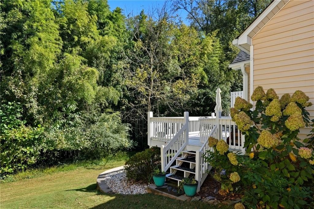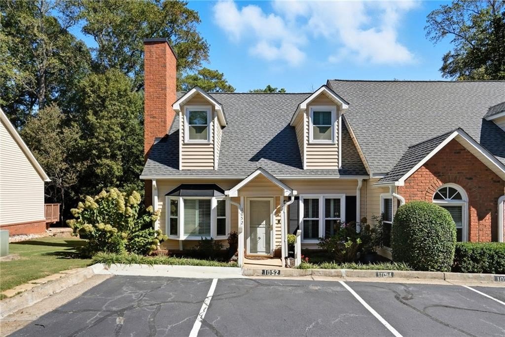 Charming End-Unit Townhome Near Historic Roswell. This beautifully maintained end-unit townhome offers effortless functionality and comfortable living. The open-concept layout connects the living room, dining area, and kitchen, creating a perfect flow for everyday living and entertaining. Step outside to the back deck overlooking a private wooded view. The primary suite on the main level features a renovated bath with a walk-in shower, custom tile, and stylish vanity, plus a spacious walk-in closet. The inviting living area includes a fireplace with built-in bookcases, Two laundry areas - stackable on main level and laundry in hall on the upper level.