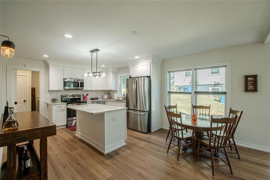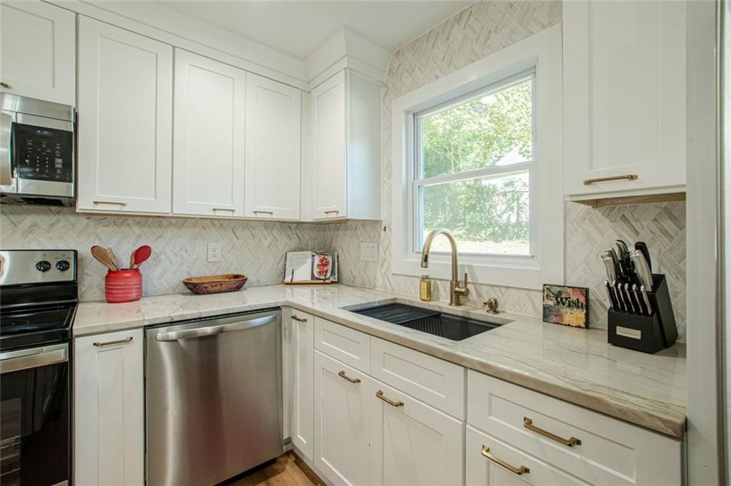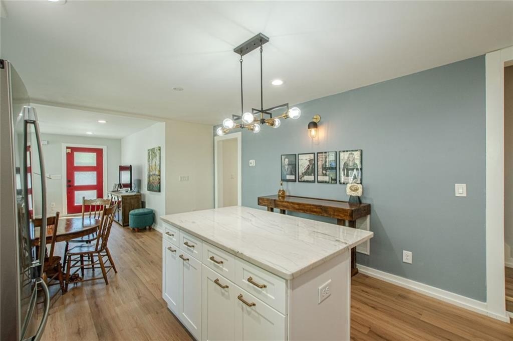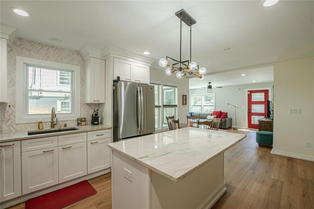 Completely renovated from the studs up in 2021, this 4-bedroom, 3-bath home showcases exquisite craftsmanship and a light-filled, open floor plan designed for modern living. The chef’s kitchen is a true showpiece, featuring gleaming quartz countertops, soft-close cabinetry, a designer tile backsplash, antique brass hardware, stainless appliances, and brand-new luxury vinyl flooring. Custom top-down/bottom-up blinds add both style and functionality to the main living and dining areas.