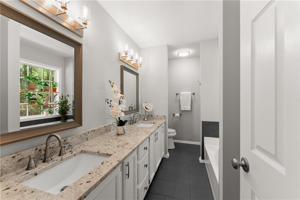 The open-concept main living area features new hardwood floors, fresh paint, and a fully remodeled kitchen with white shaker cabinetry, granite countertops, and stainless-steel appliances. The primary suite offers a relaxing retreat with a renovated bathroom showcasing double vanities, granite counters, and new ceramic tile. Two additional bedrooms provide flexible space for family, guests, or a home office.