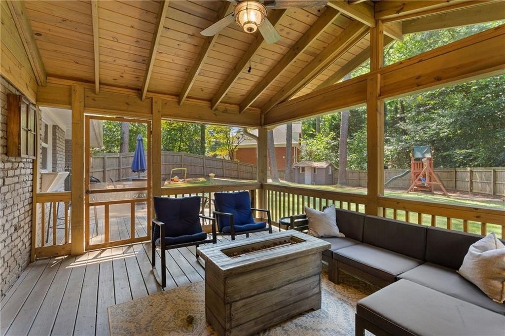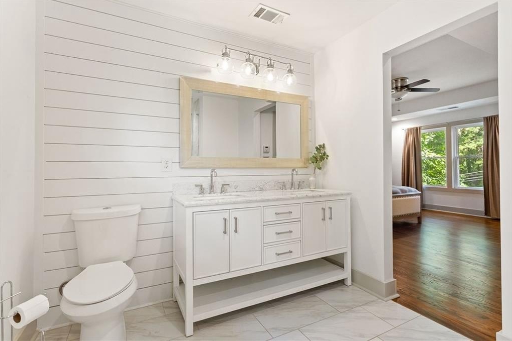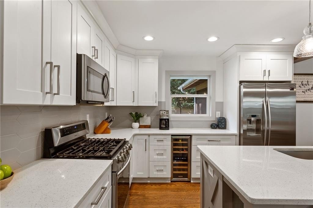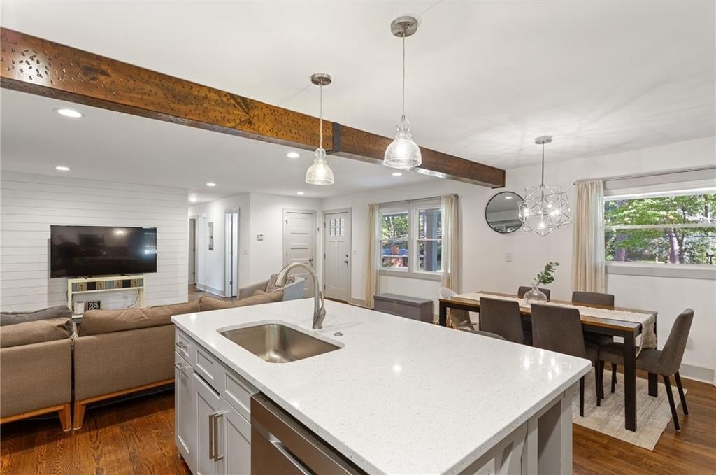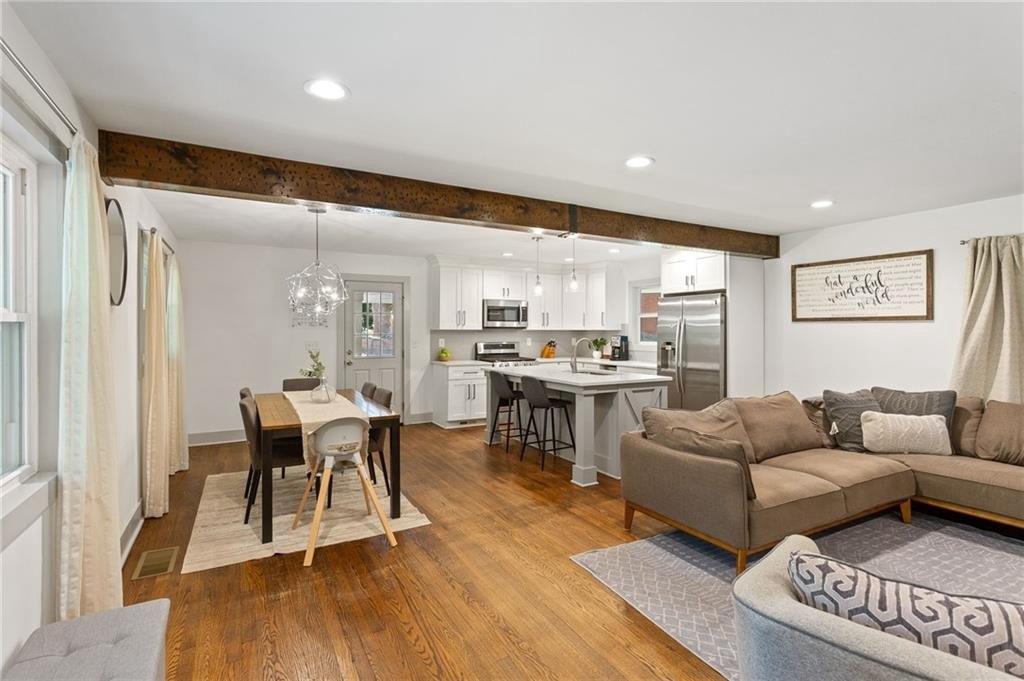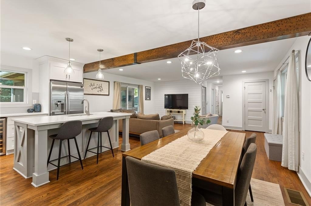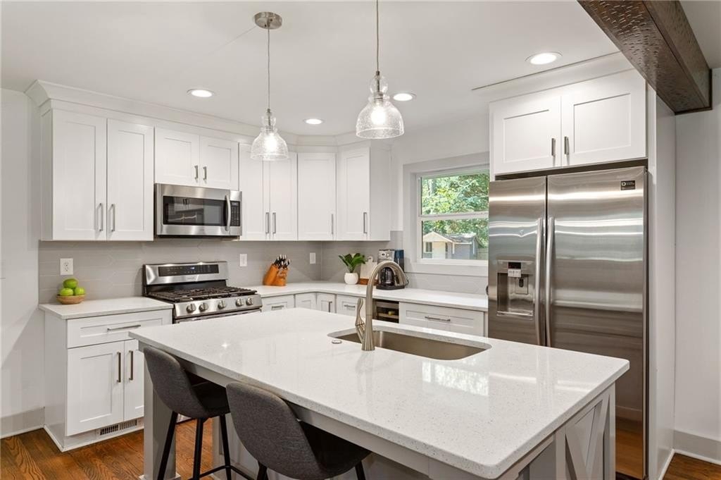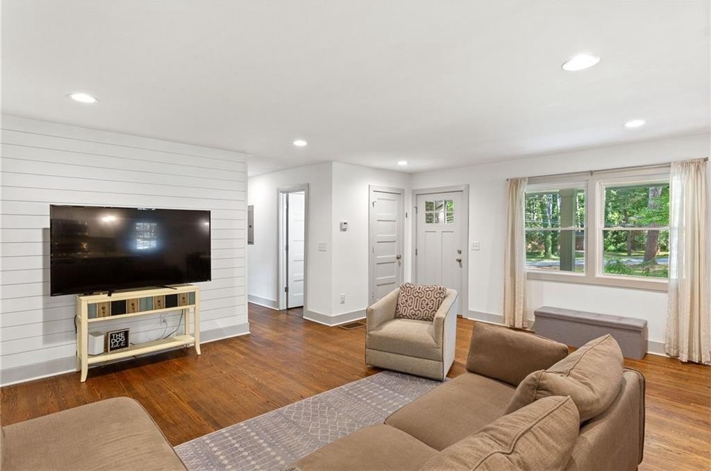 Located on a peaceful corner lot in one of Atlanta’s most sought-after, walkable neighborhoods, this 4-bedroom, 2.5-bathroom gem delivers a thoughtfully renovated living space, blending timeless charm with modern updates. Step inside to discover rich hardwood floors, a striking beamed ceiling, and a shiplap accent wall that brings texture and warmth to the great room. The fully renovated kitchen is equal parts functional and fabulous, featuring sleek quartz countertops, stainless steel appliances, a wine cooler, an island with breakfast bar, and crisp cabinetry designed for the modern lifestyle. The updated bathrooms offer spa-inspired finishes, while recessed lighting throughout the home keeps everything feeling bright and airy. Out back, the screened-in porch is a true showstopper, and with a custom wall built for your mounted TV, it's the ultimate spot for entertaining, game nights, or relaxing all year long. This quiet, tree-lined neighborhood feeds into top-rated schools and offers access to a community pool with an active swim team. Optional annual membership available. All just minutes from local parks, shopping, dining, and some of Atlanta’s most beloved attractions, including the Atlanta Botanical Gardens, Chattahoochee Nature Center, and the Georgia Aquarium. It’s the perfect balance of peaceful living and vibrant city access.