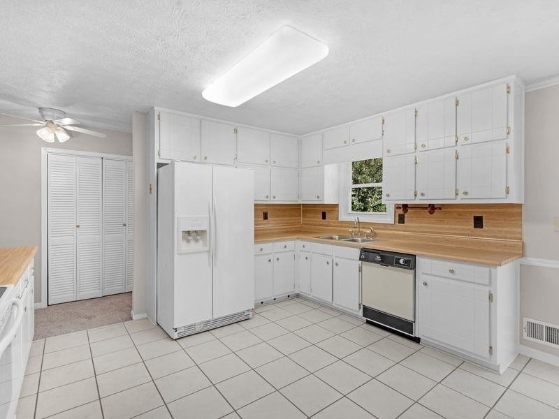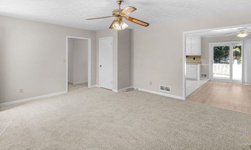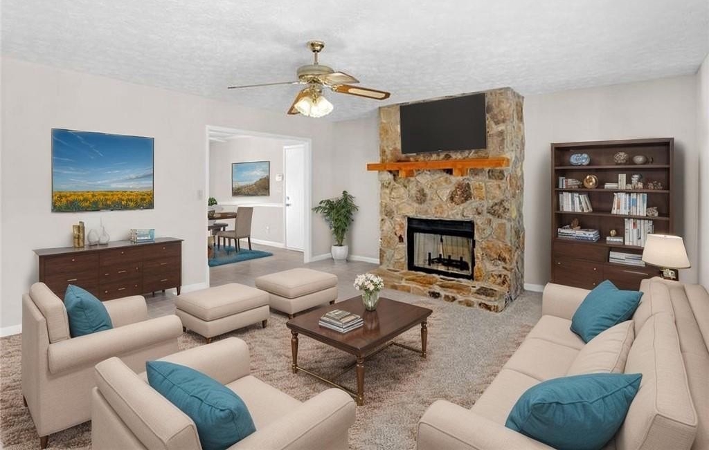 Inside, you'll find new flooring and fresh paint throughout. The spacious living room features a cozy stone fireplace, perfect for gatherings. The large kitchen offers plenty of cabinet and counter space-ideal for everyday living and meal prep.