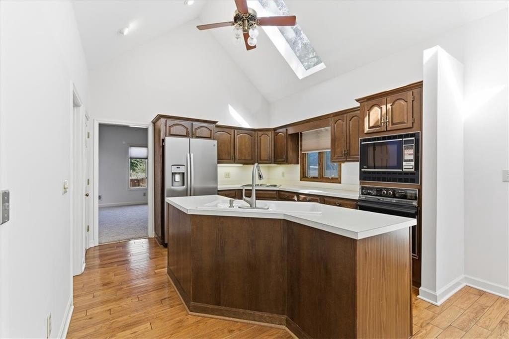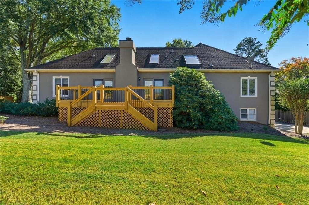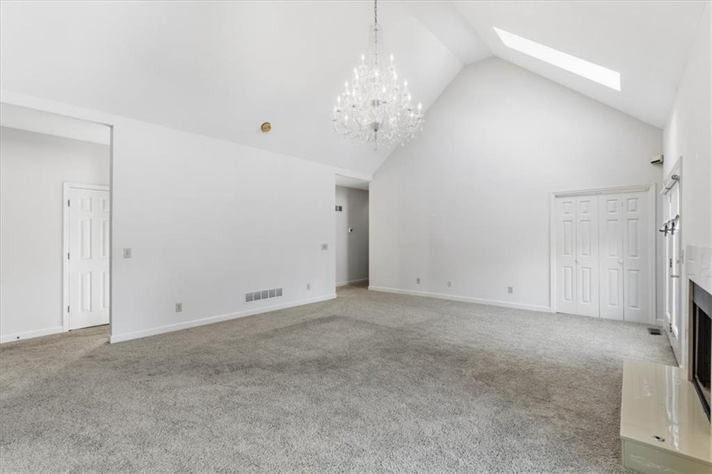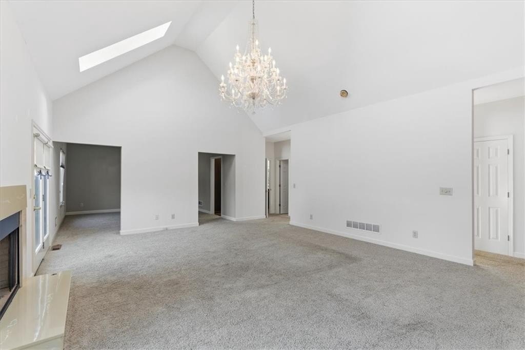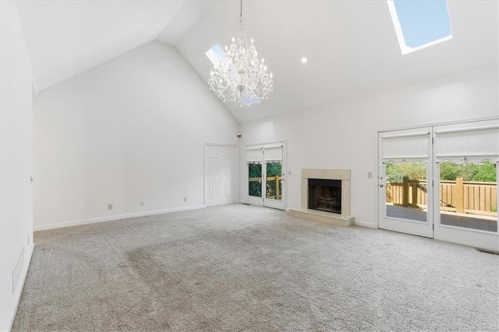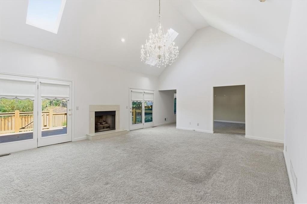 Inside, cathedral ceilings, skylights, and elegant arched transom windows fill the home with natural light, creating a bright and inviting atmosphere. The great room centers around a beautiful fireplace and features two full-glass double doors that open to a spectacular deck — perfect for outdoor entertaining or quiet relaxation.